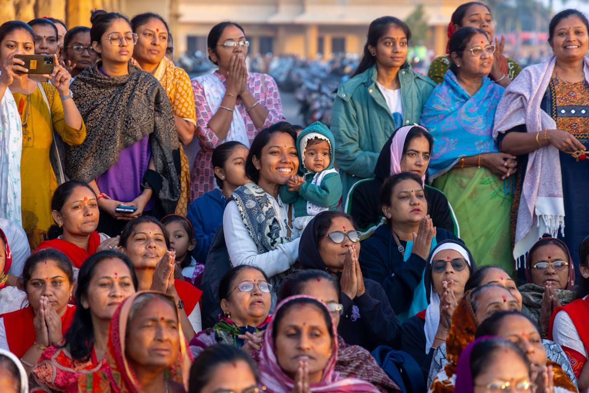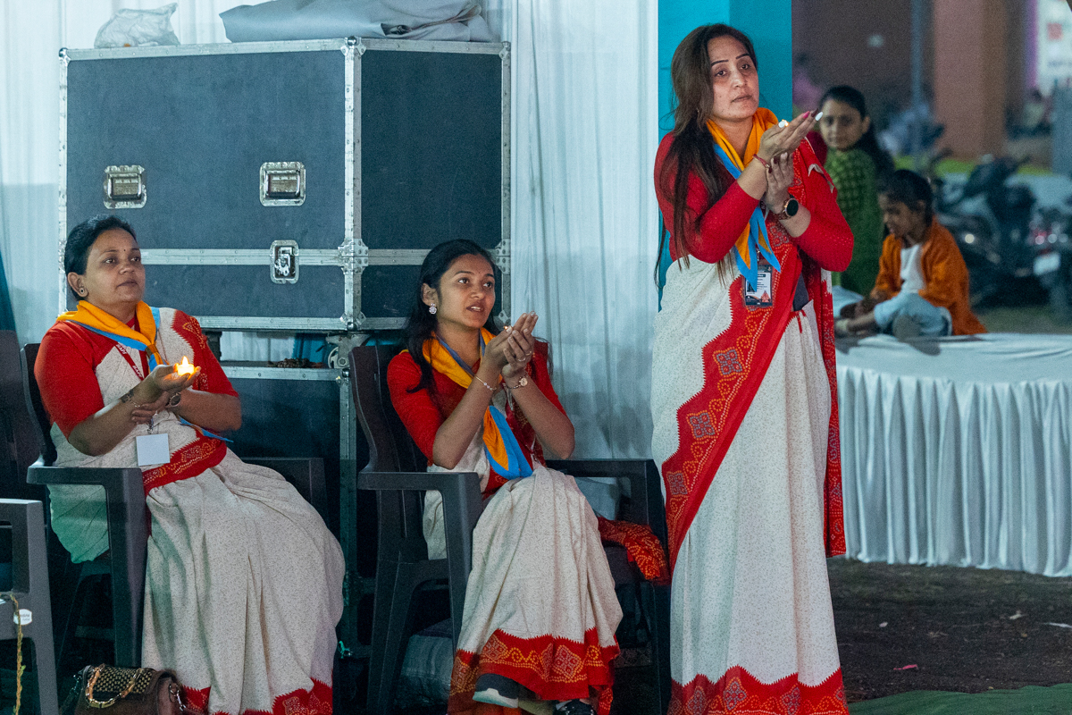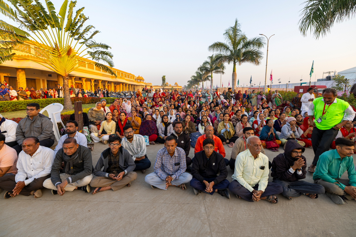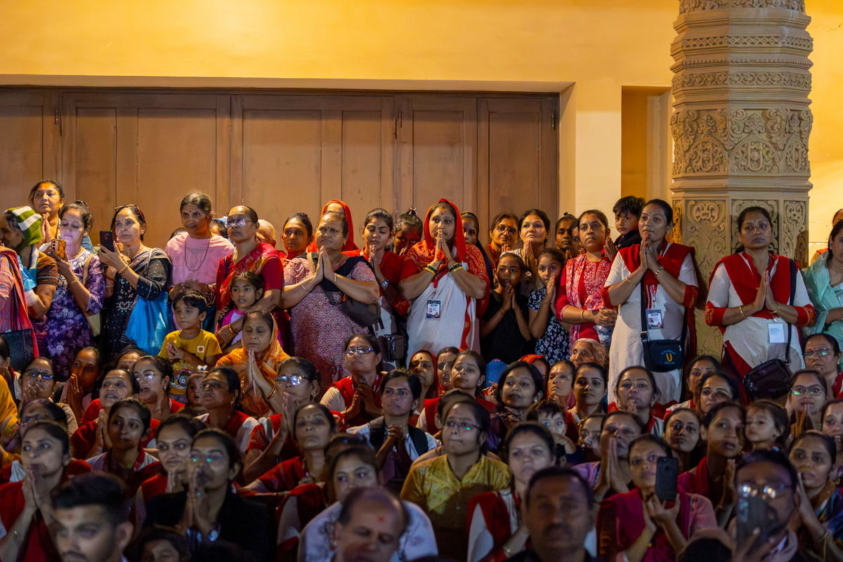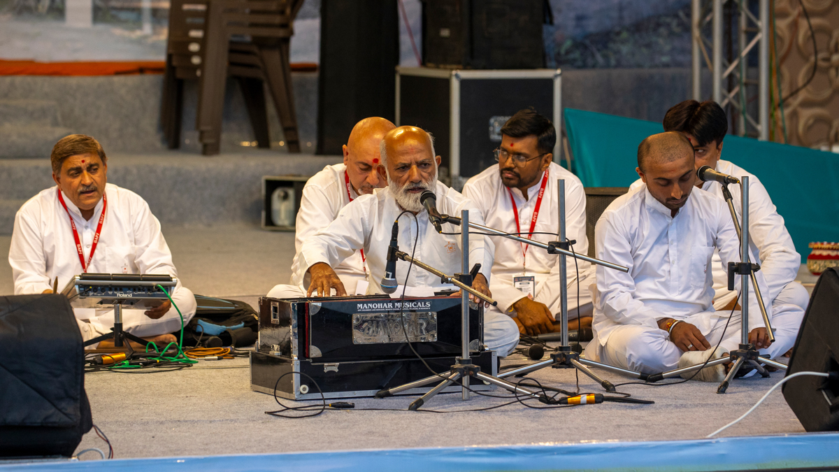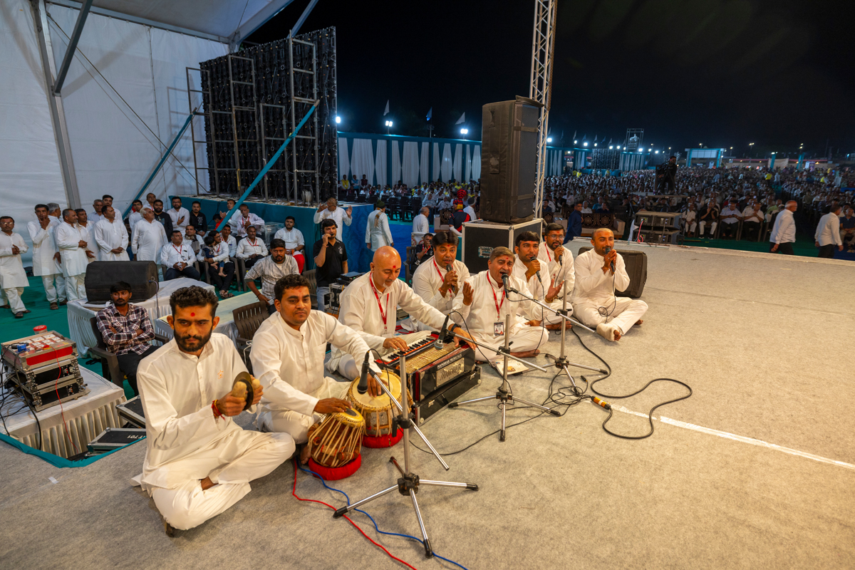 Devotees sing kirtans at the beginning of the evening Bhadra Gramya Din assembly