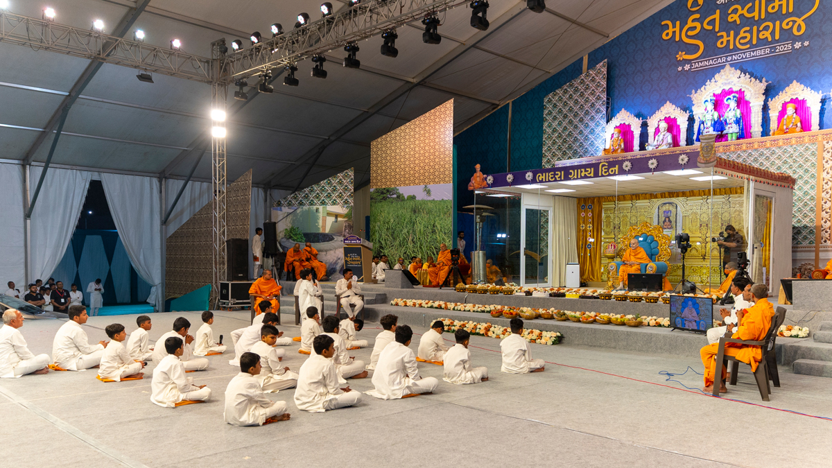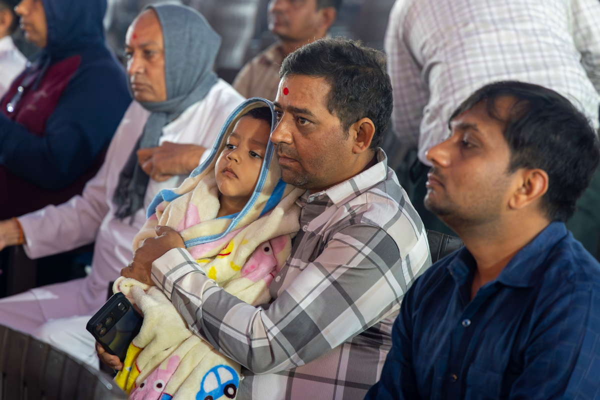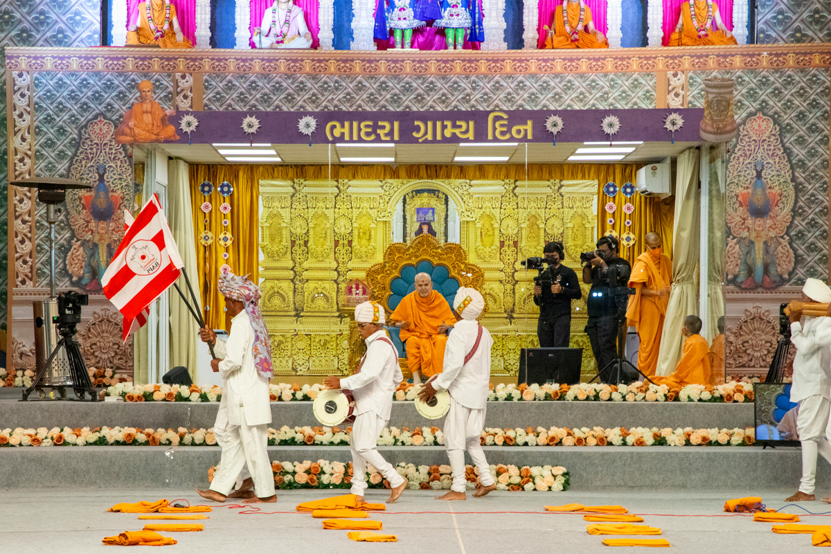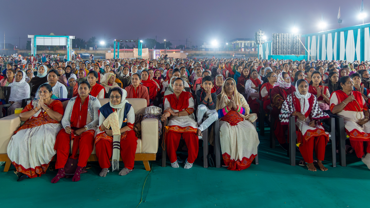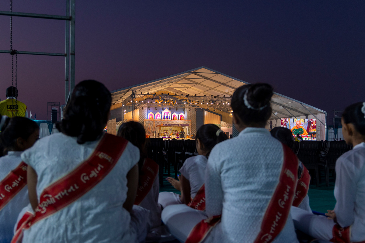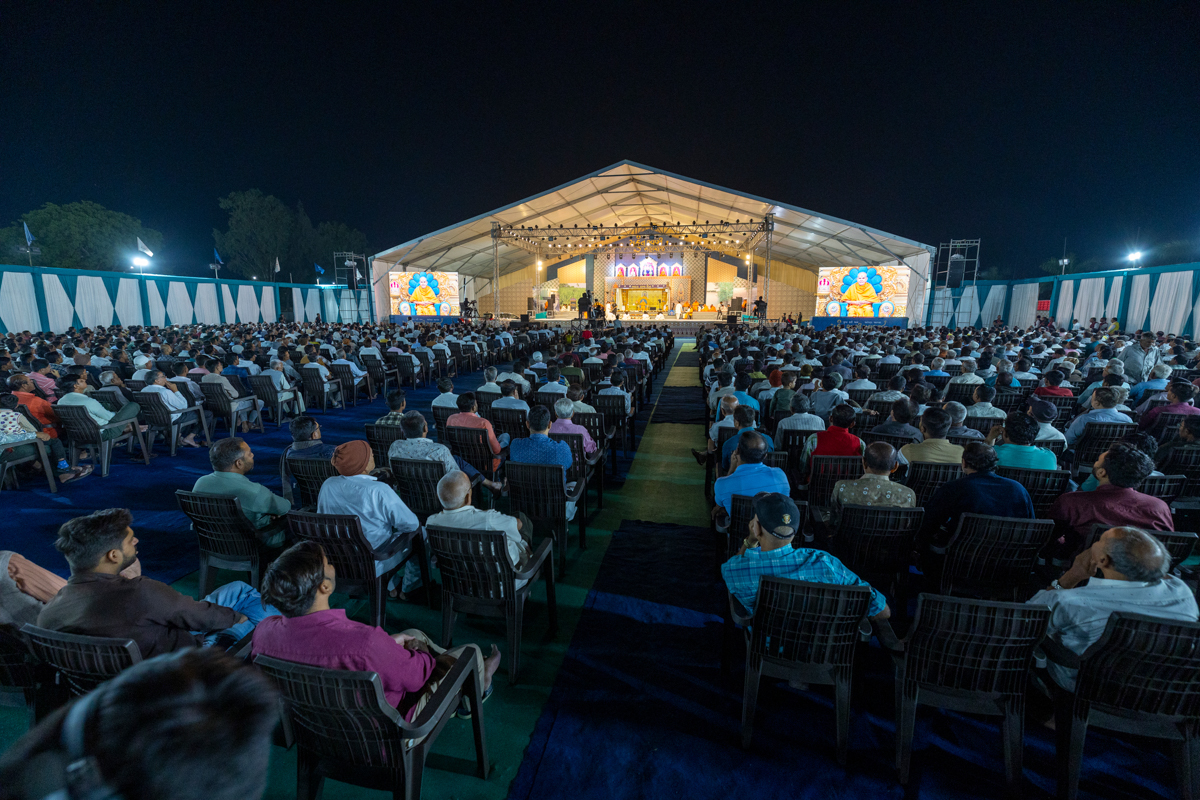 Devotees sing kirtans at the beginning of the evening Bhadra Gramya Din assembly