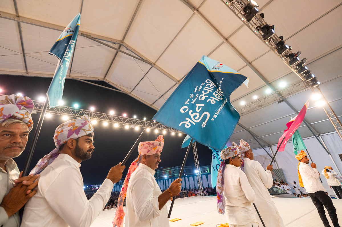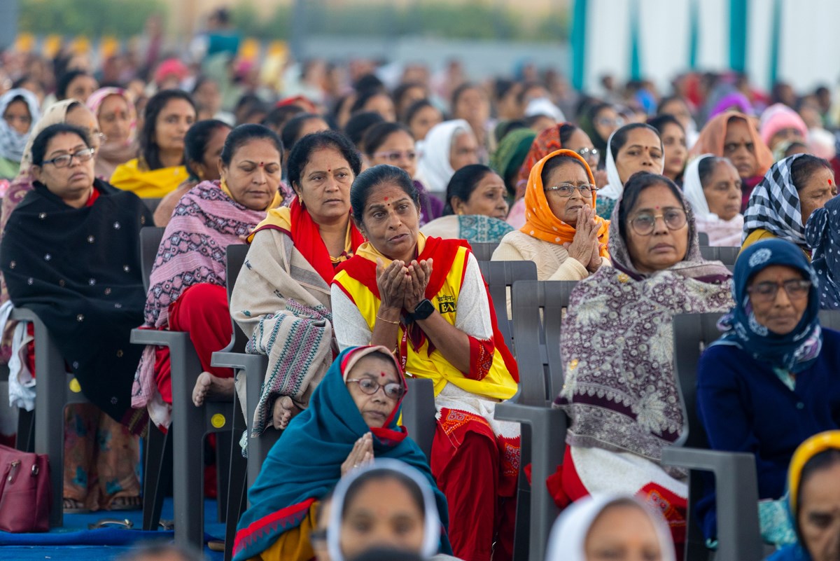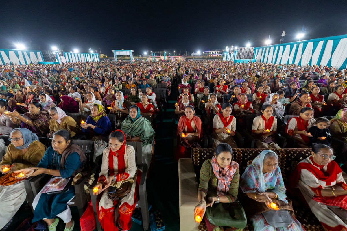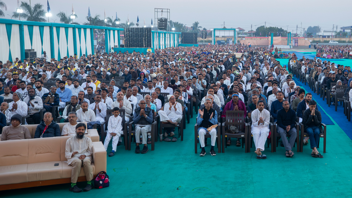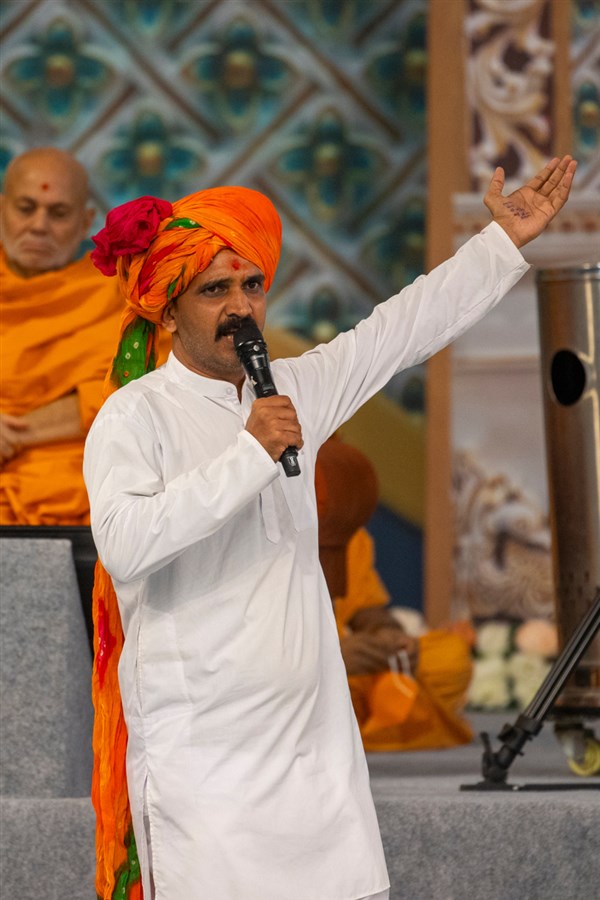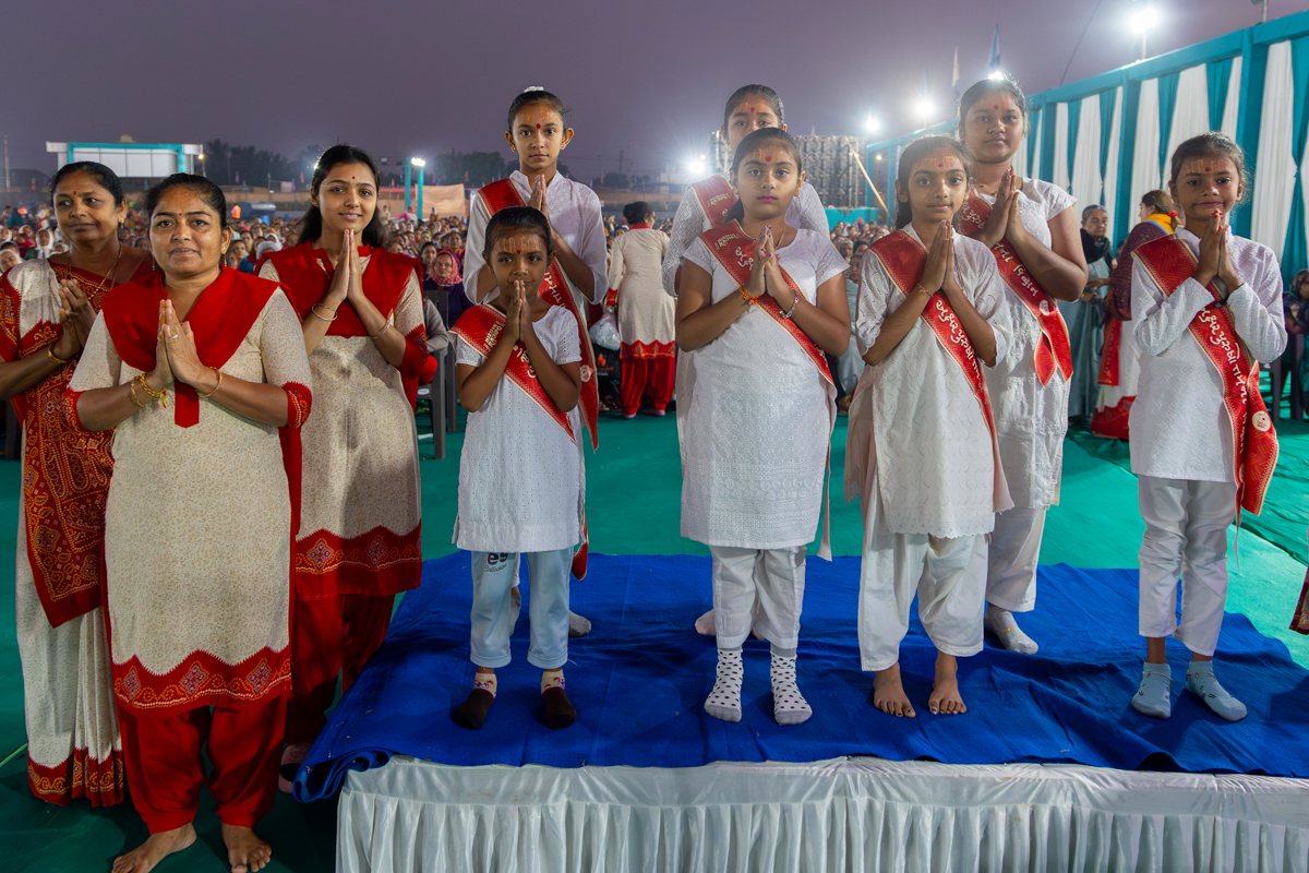 Devotees sing kirtans at the beginning of the evening Bhadra Gramya Din assembly