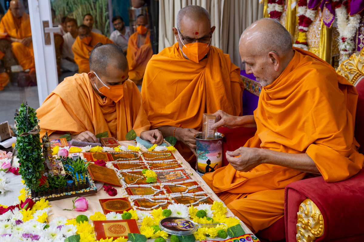 Swamishri sanctifies water with the holy relics of Bhagwan Swaminarayan and the Guru Parampara