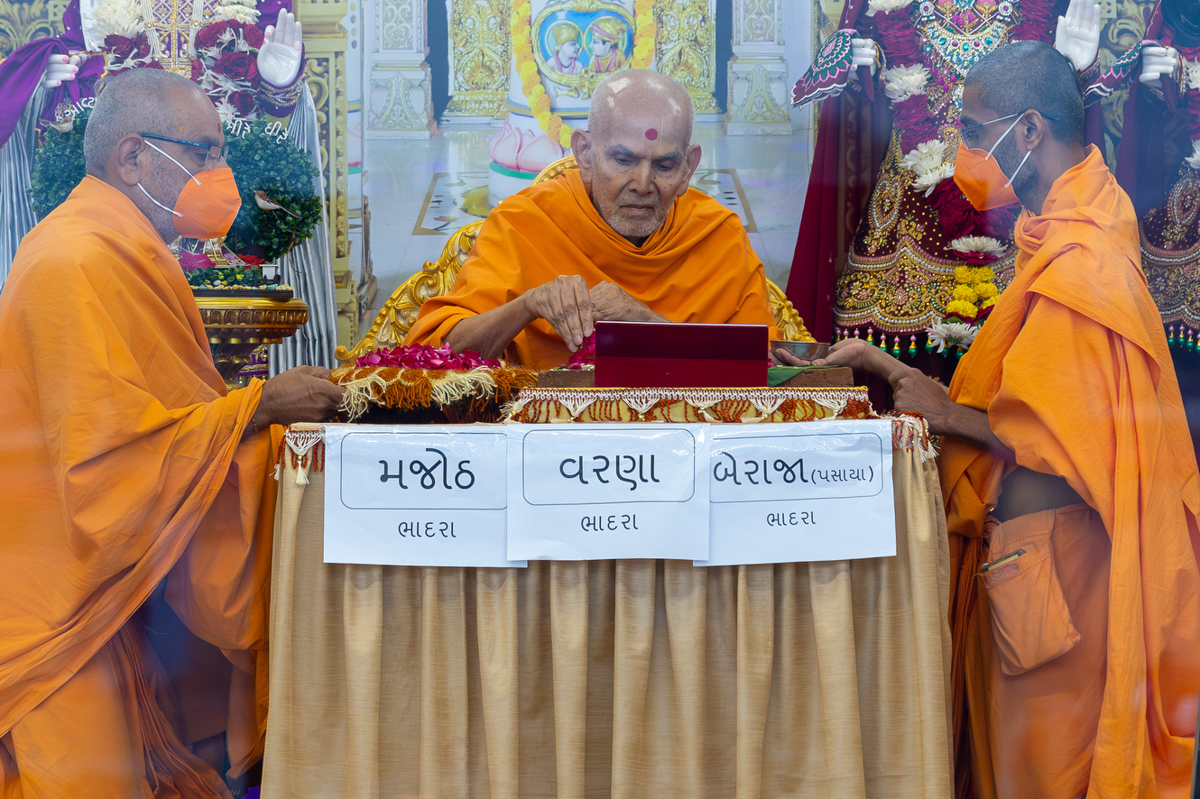 Swamishri sanctifies bricks to start construction at BAPS Shri Swaminarayan Mandirs in Majoth, Varna and Beraja, India