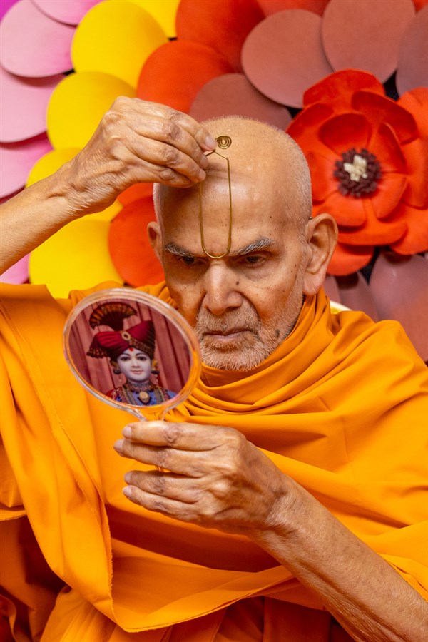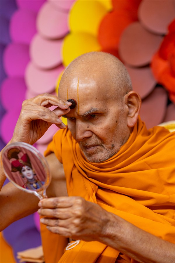 Swamishri applies a tilak on his forehead