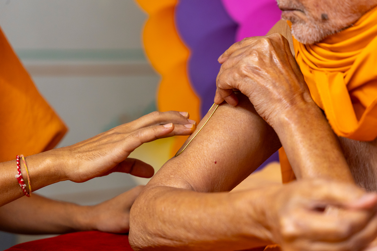 Swamishri applies a tilak on his upper arm