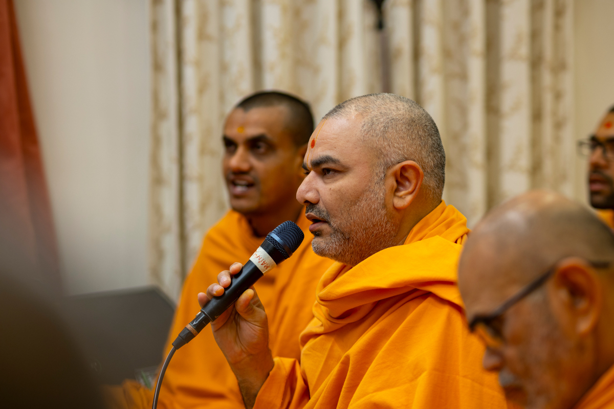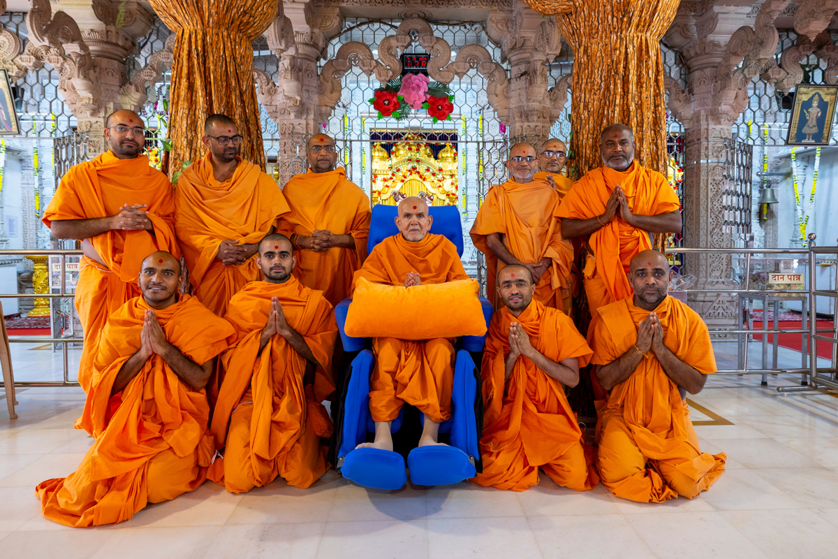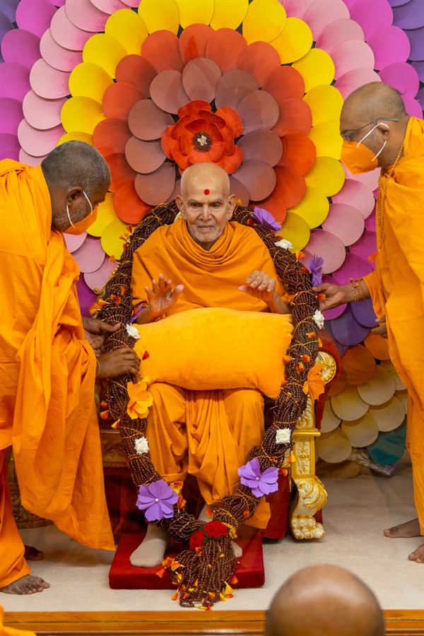 Swamis honor Swamishri with a garland