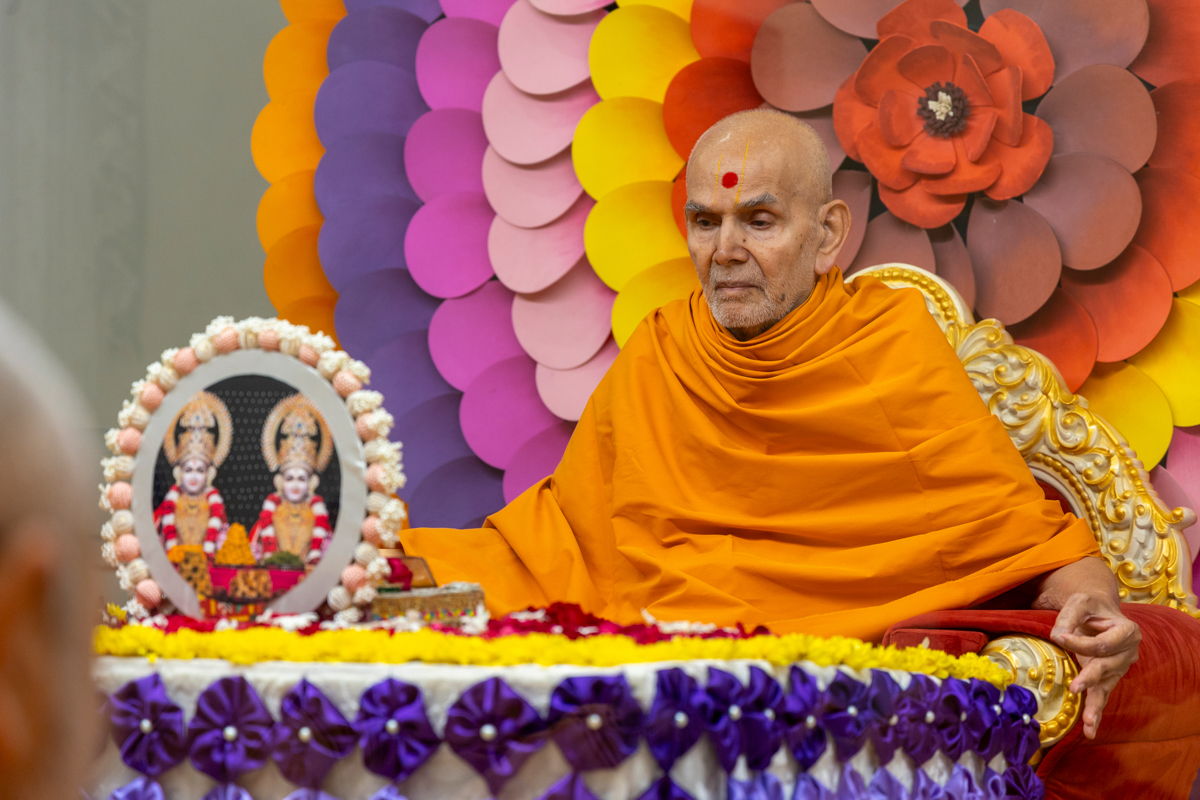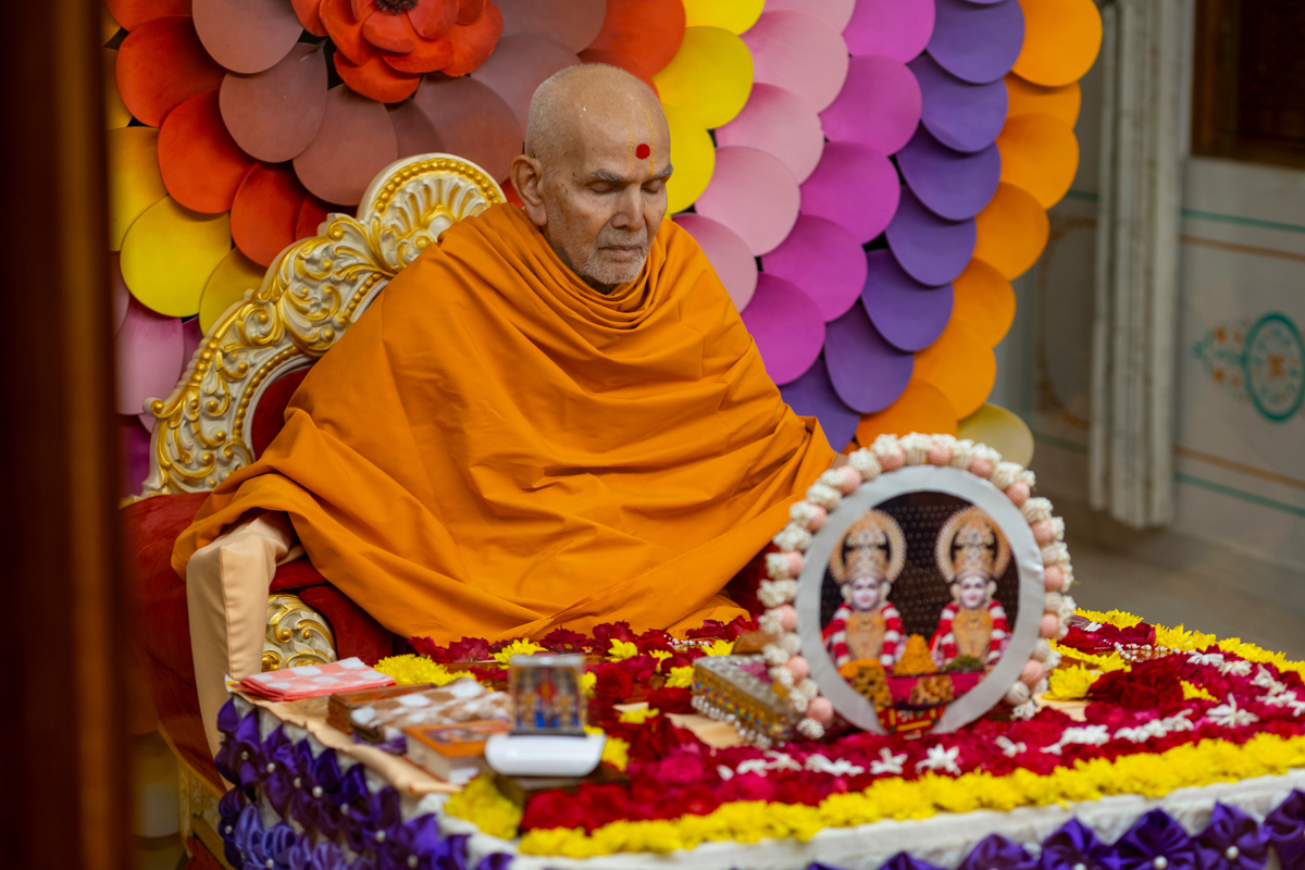 Swamishri engrossed in darshan of Bhagwan Swaminarayan and Aksharbrahma Gunatitanand Swami Maharaj