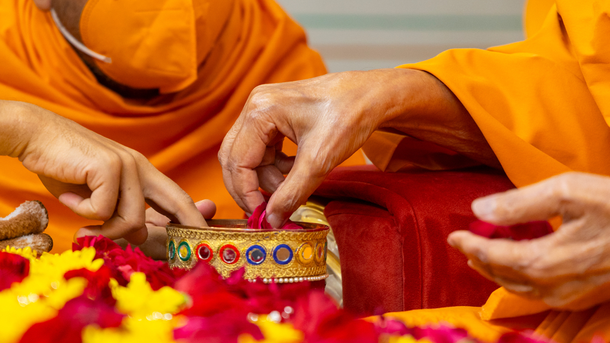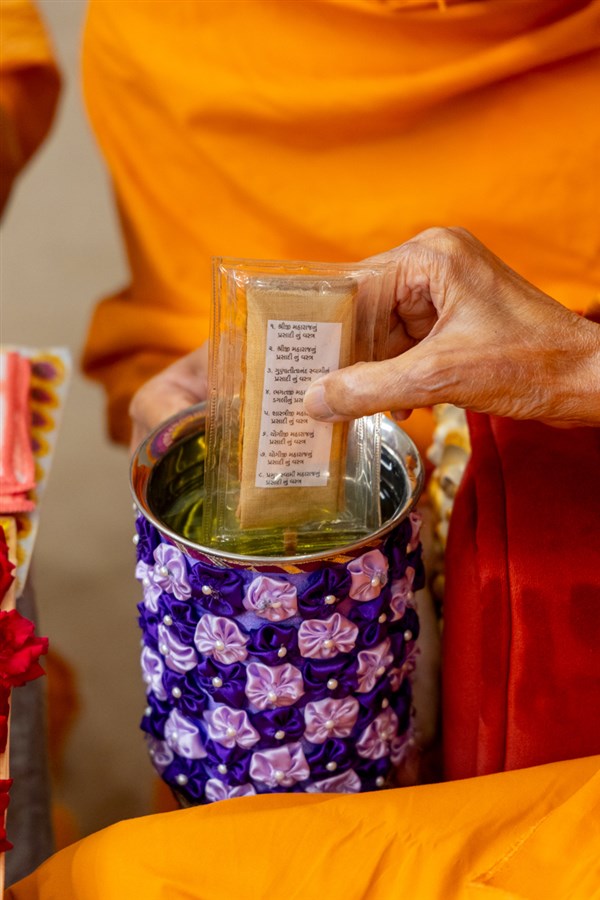 Swamishri adds flowers to the sanctified water