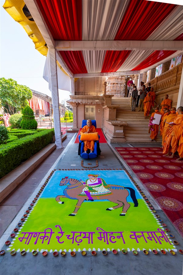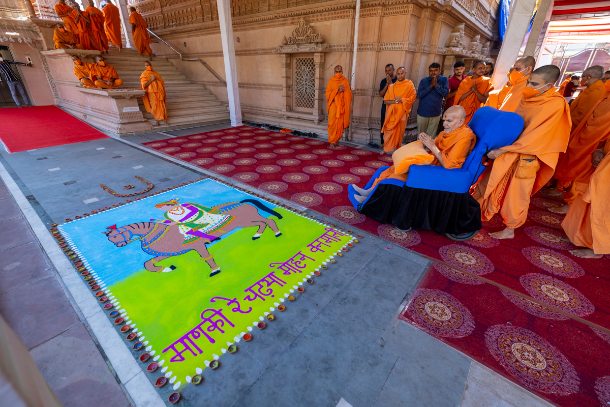 Swamishri observes a rangoli