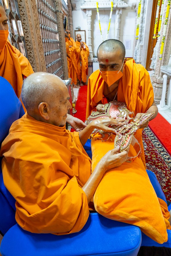 Swamishri observes garments (vagha) for Thakorji