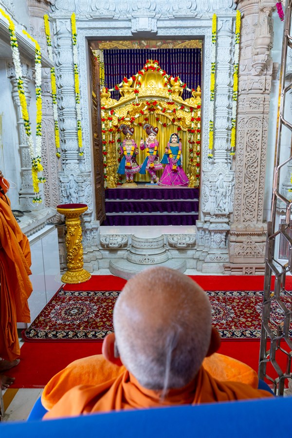 Swamishri engrossed in darshan of Shri Harikrishna Maharaj, Bhagwan Shri Govind Devji and Shri Radhaji