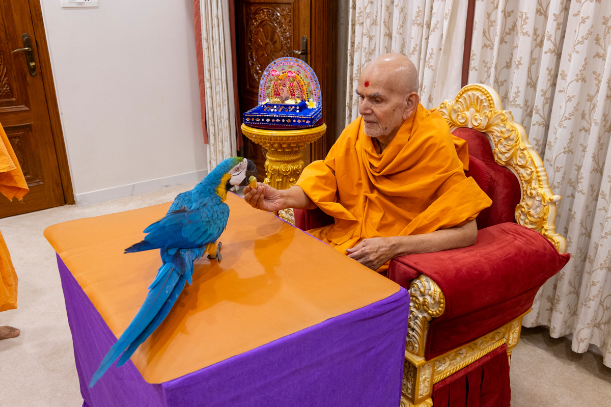 Swamishri offers fruit to a bird