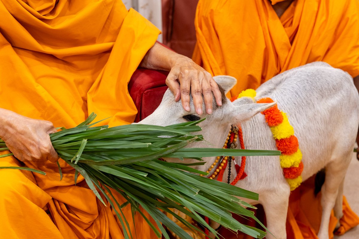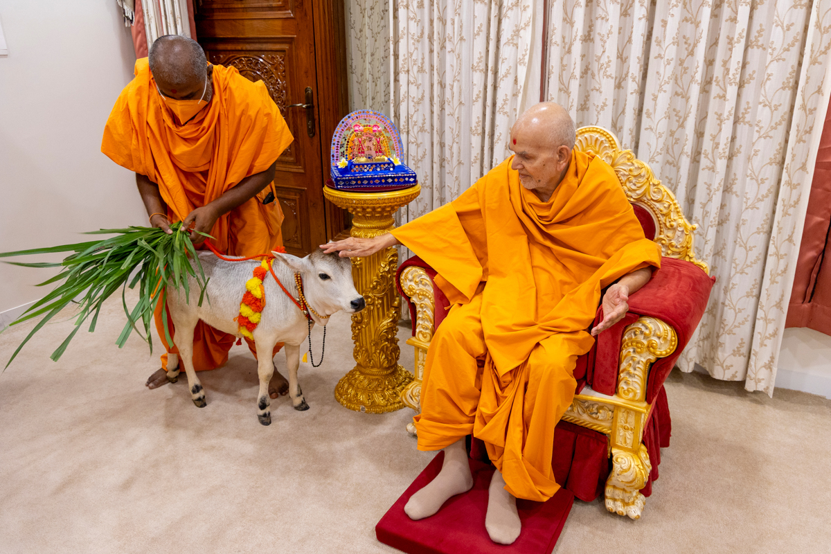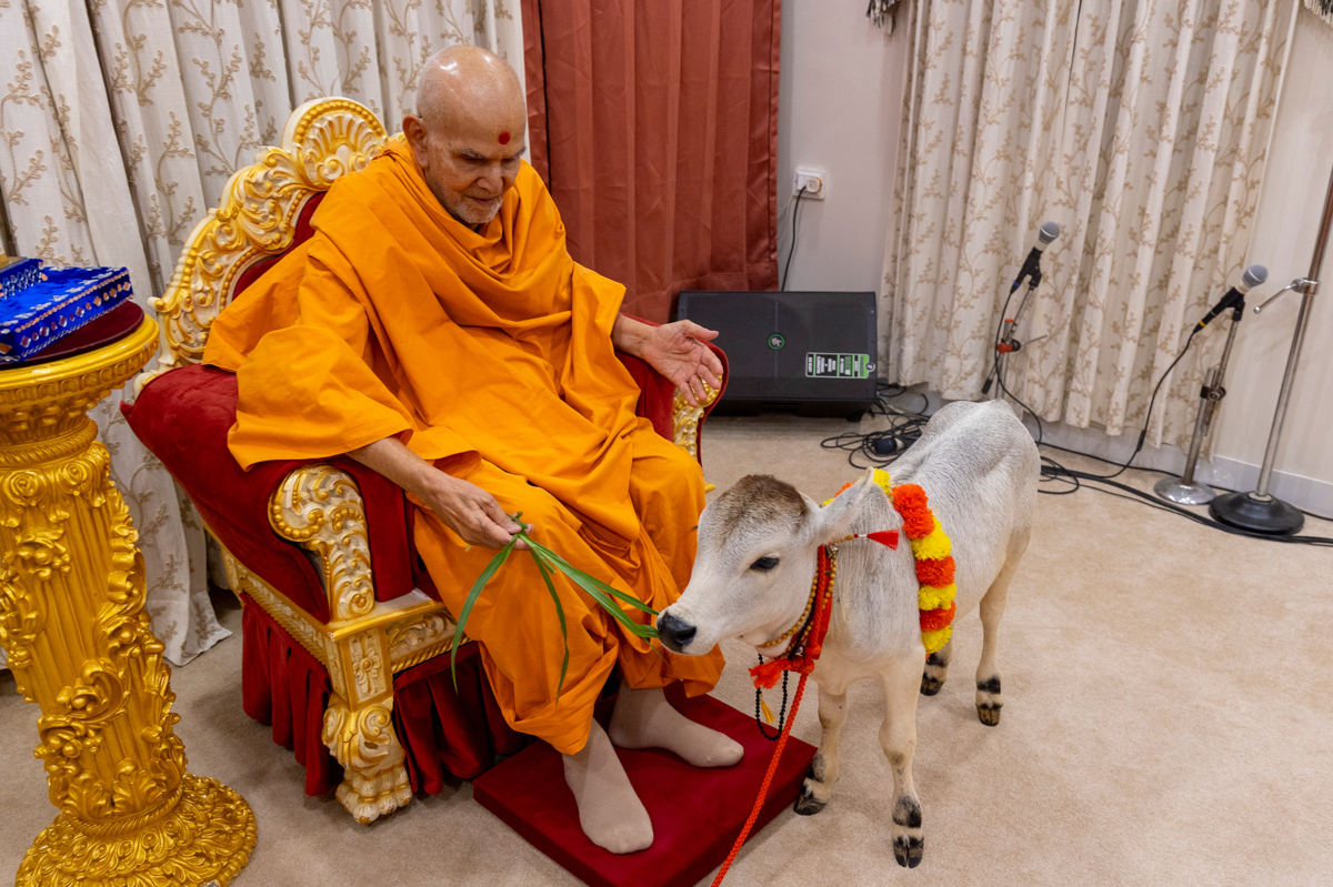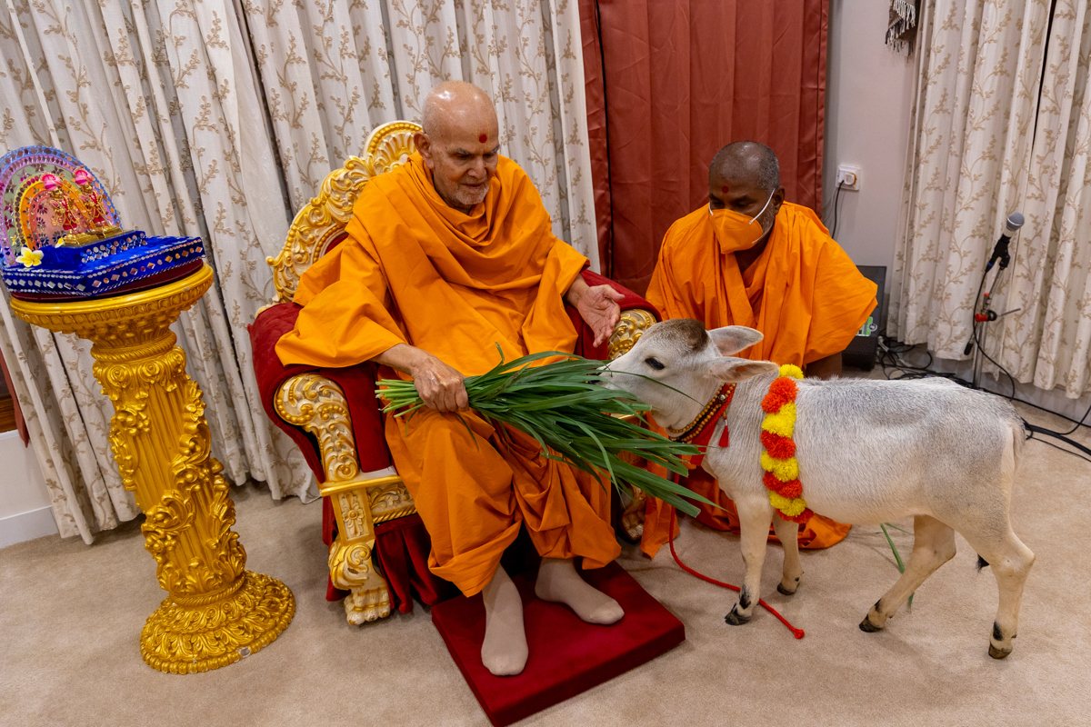 Swamishri offers grass to a calf