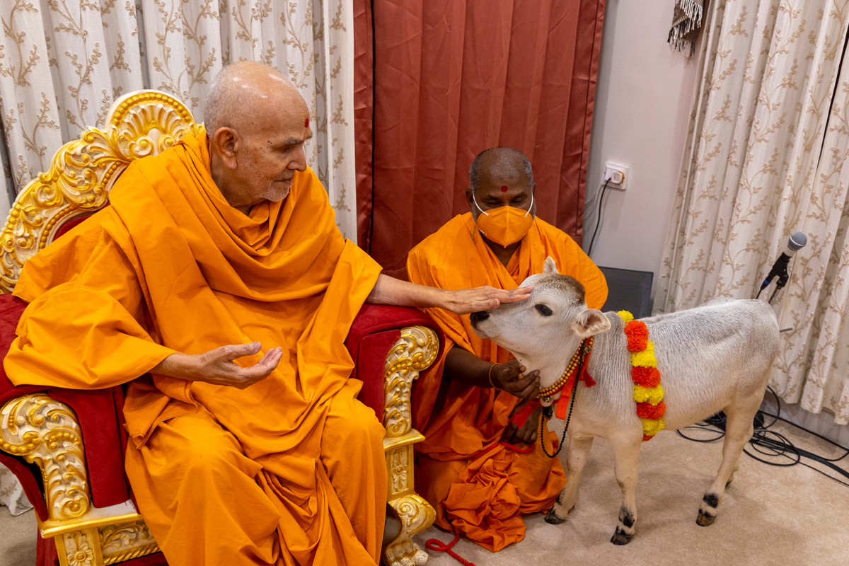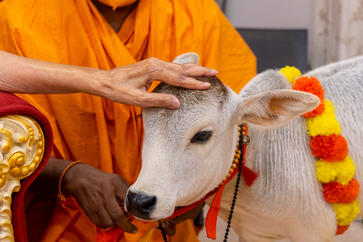 Swamishri performs pujan of a calf