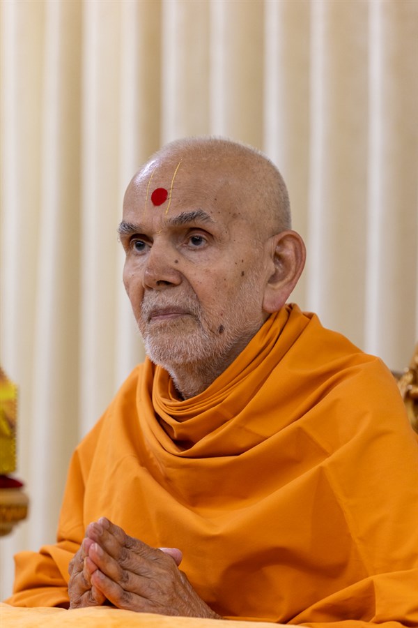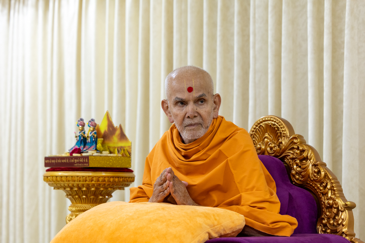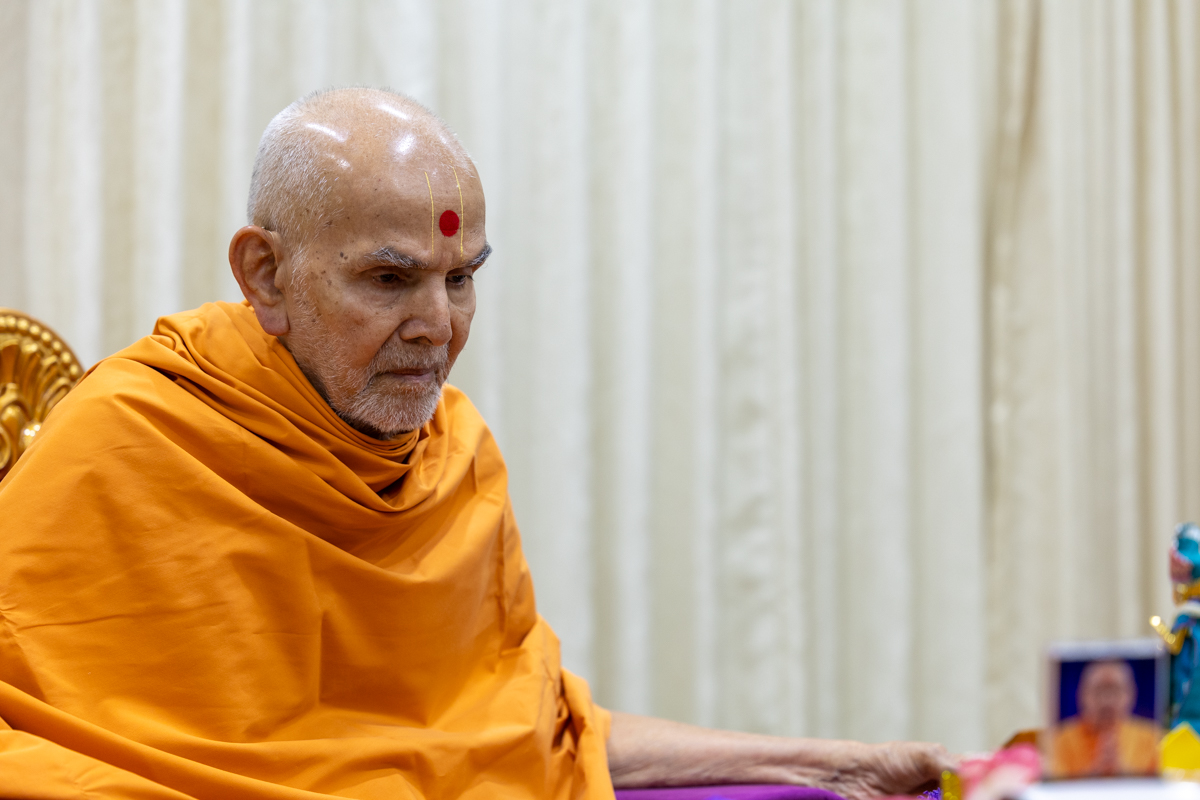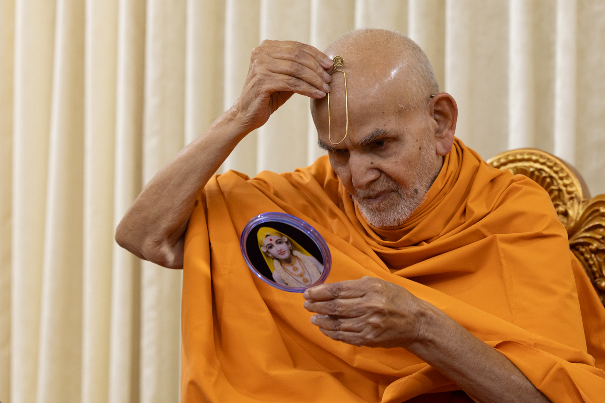 Swamishri engrossed in darshan of Shri Harikrishna Maharaj and Shri Gunatitanand Swami Maharaj