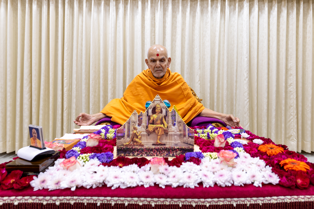 Param Pujya Mahant Swami Maharaj engrossed in darshan of Shri Harikrishna Maharaj and Shri Gunatitanand Swami Maharaj