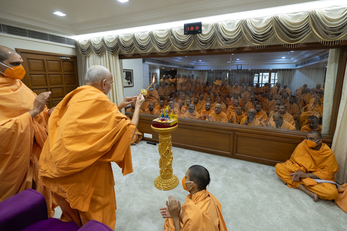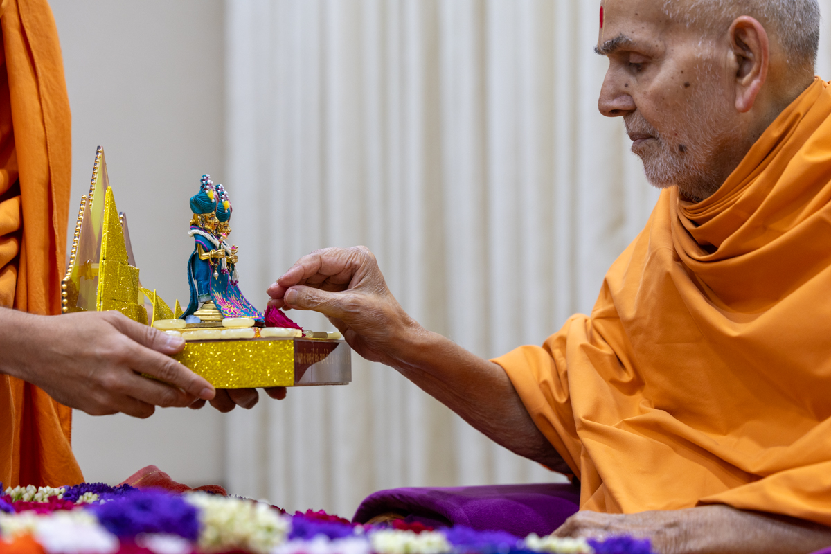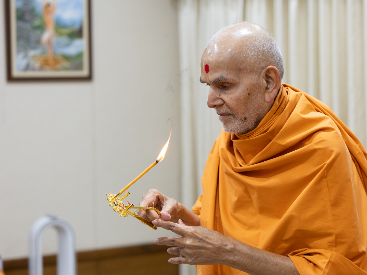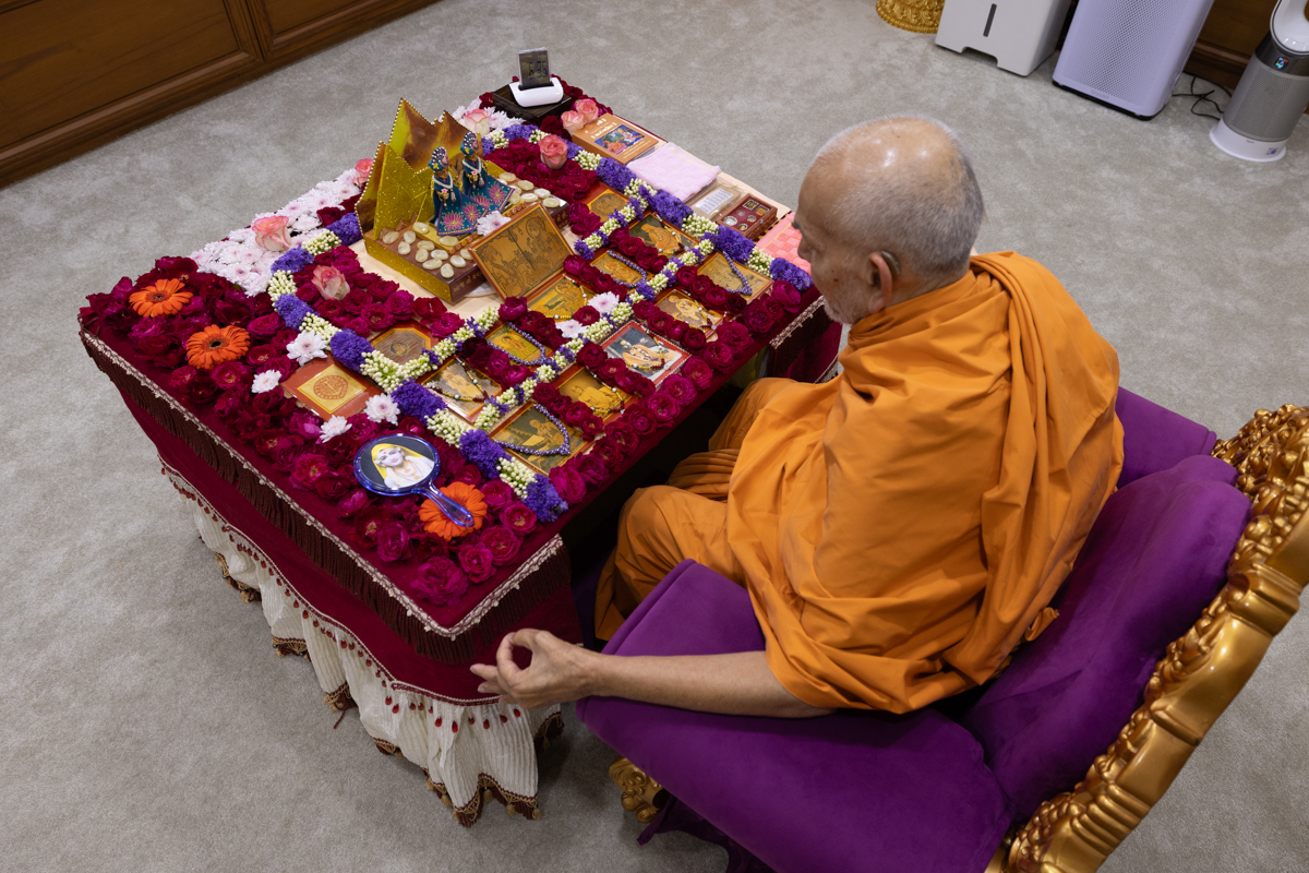 Pujya Ishwarcharan Swami doing Swamishri's puja darshan