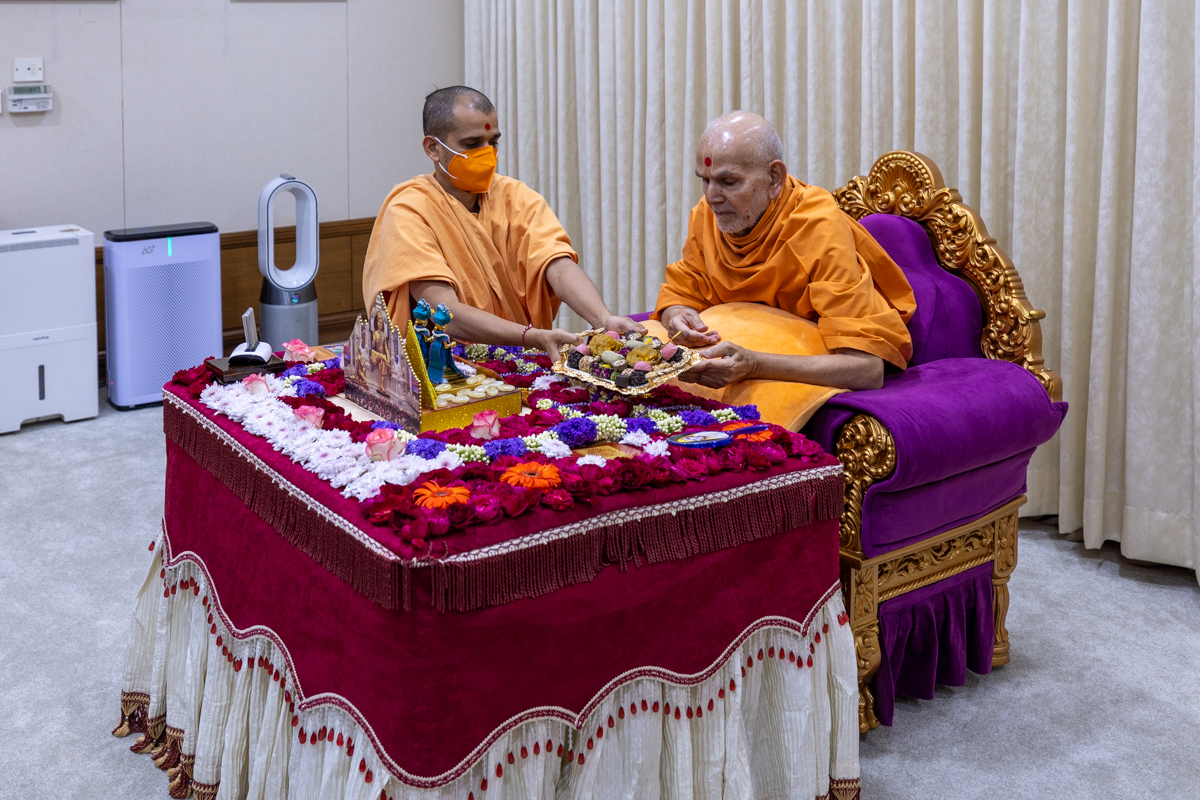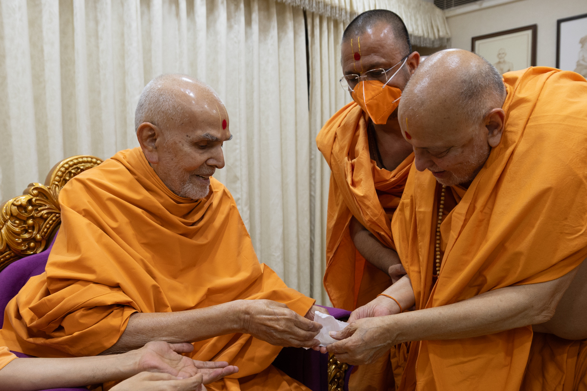 Swamishri gives prasad to Pujya Ishwarcharan Swami