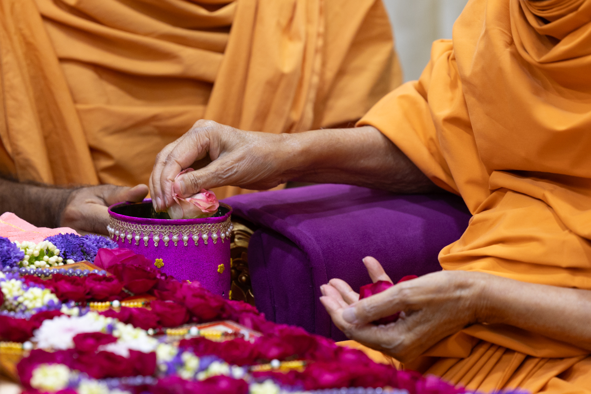 Swamishri places a flower at the feet of Shri Harikrishna Maharaj and Shri Gunatitanand Swami Maharaj