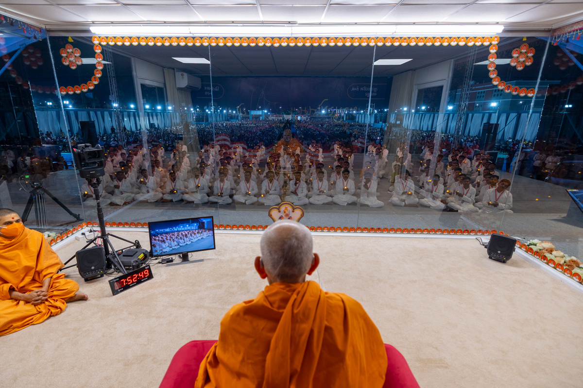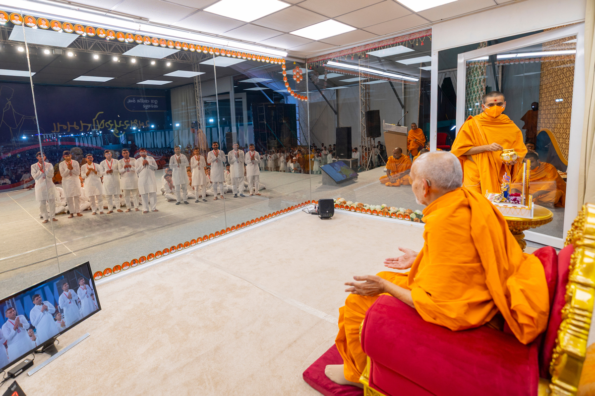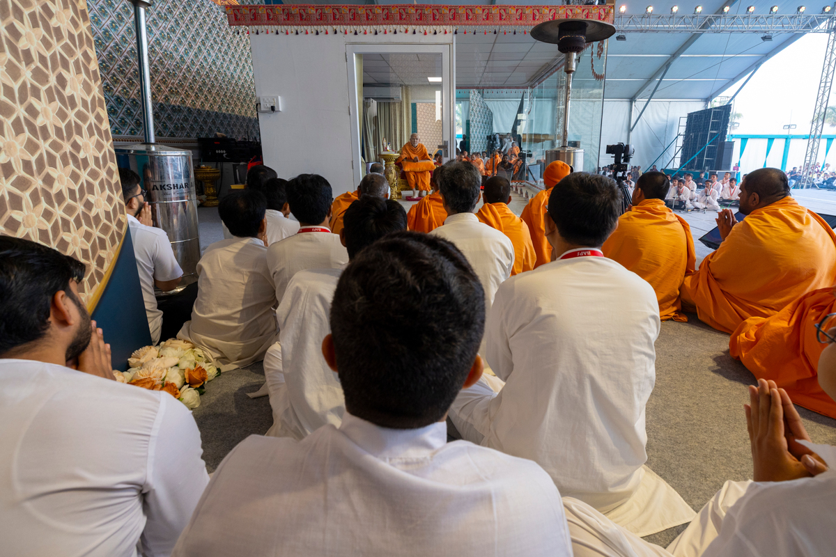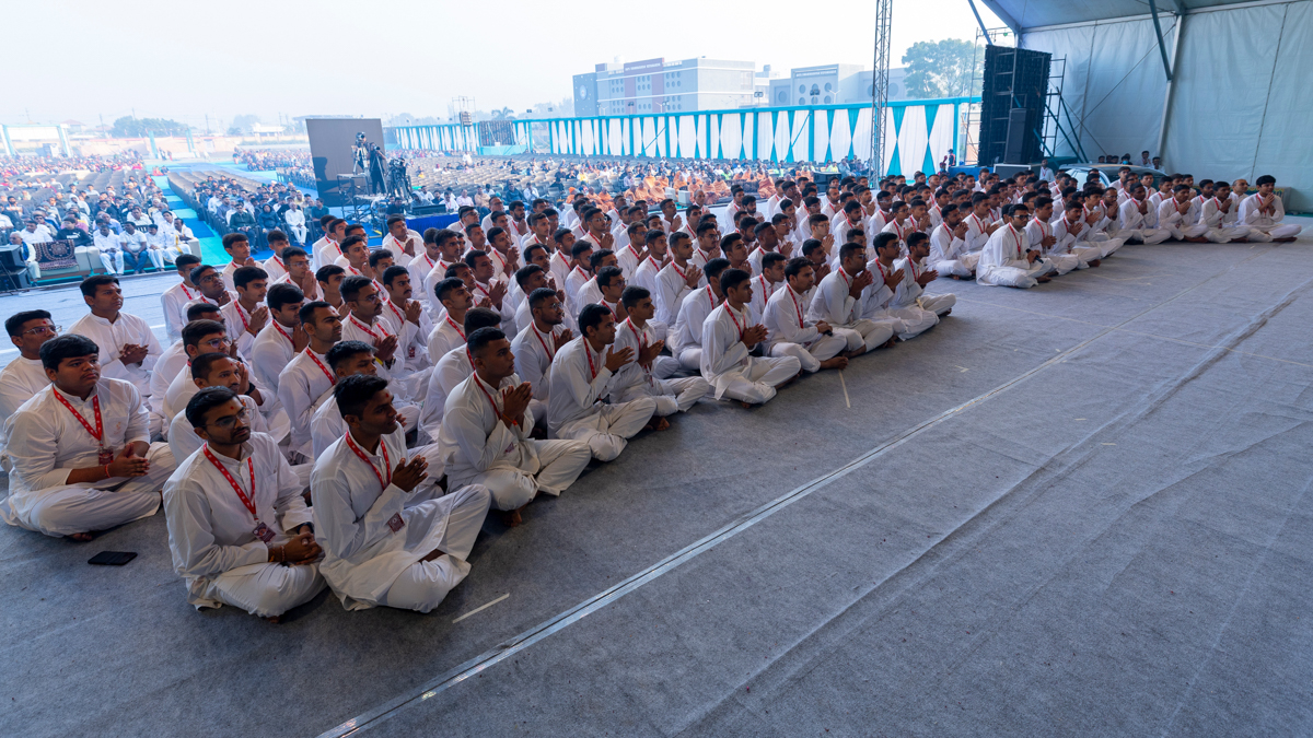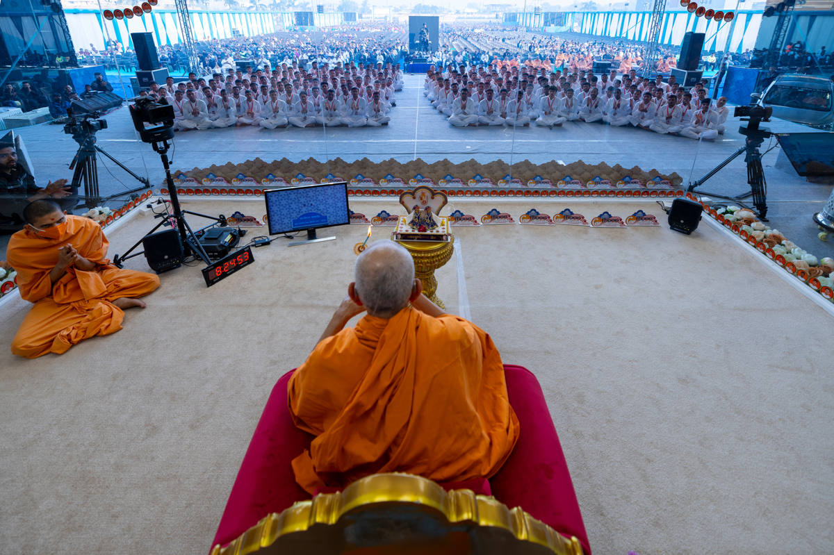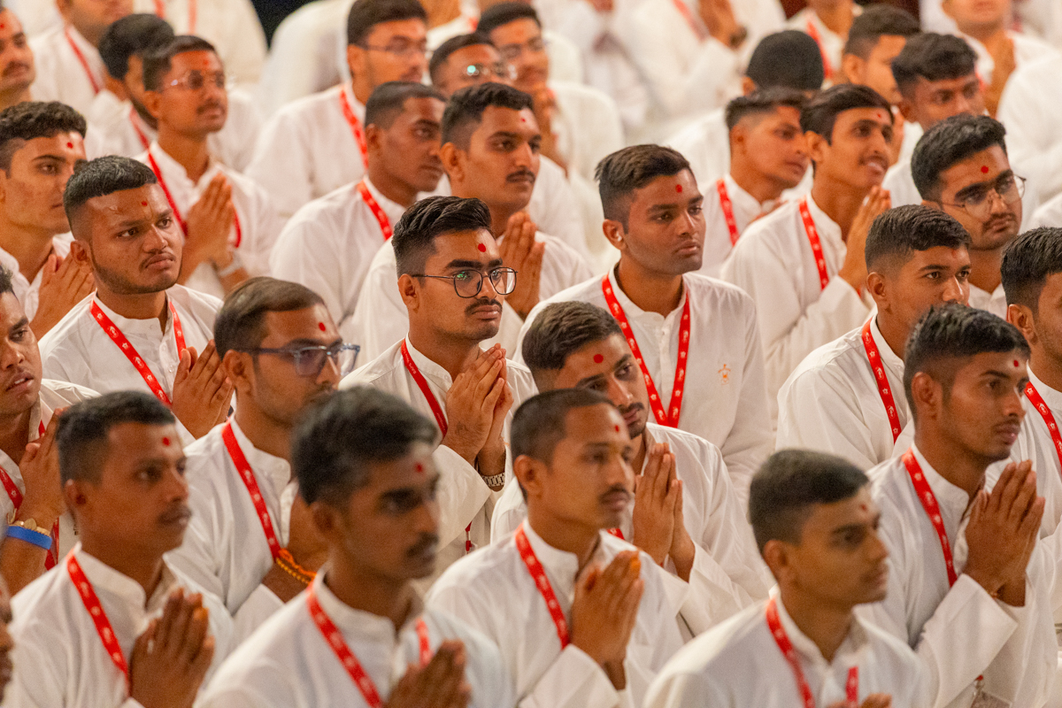 Yuvaks lead everyone in reciting the sadhana mantra and daily prayer in Swamishri's puja