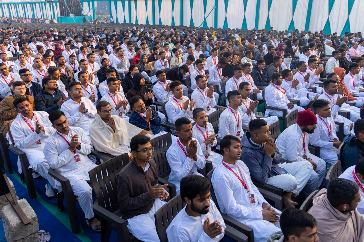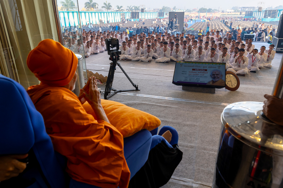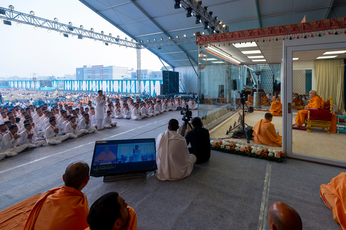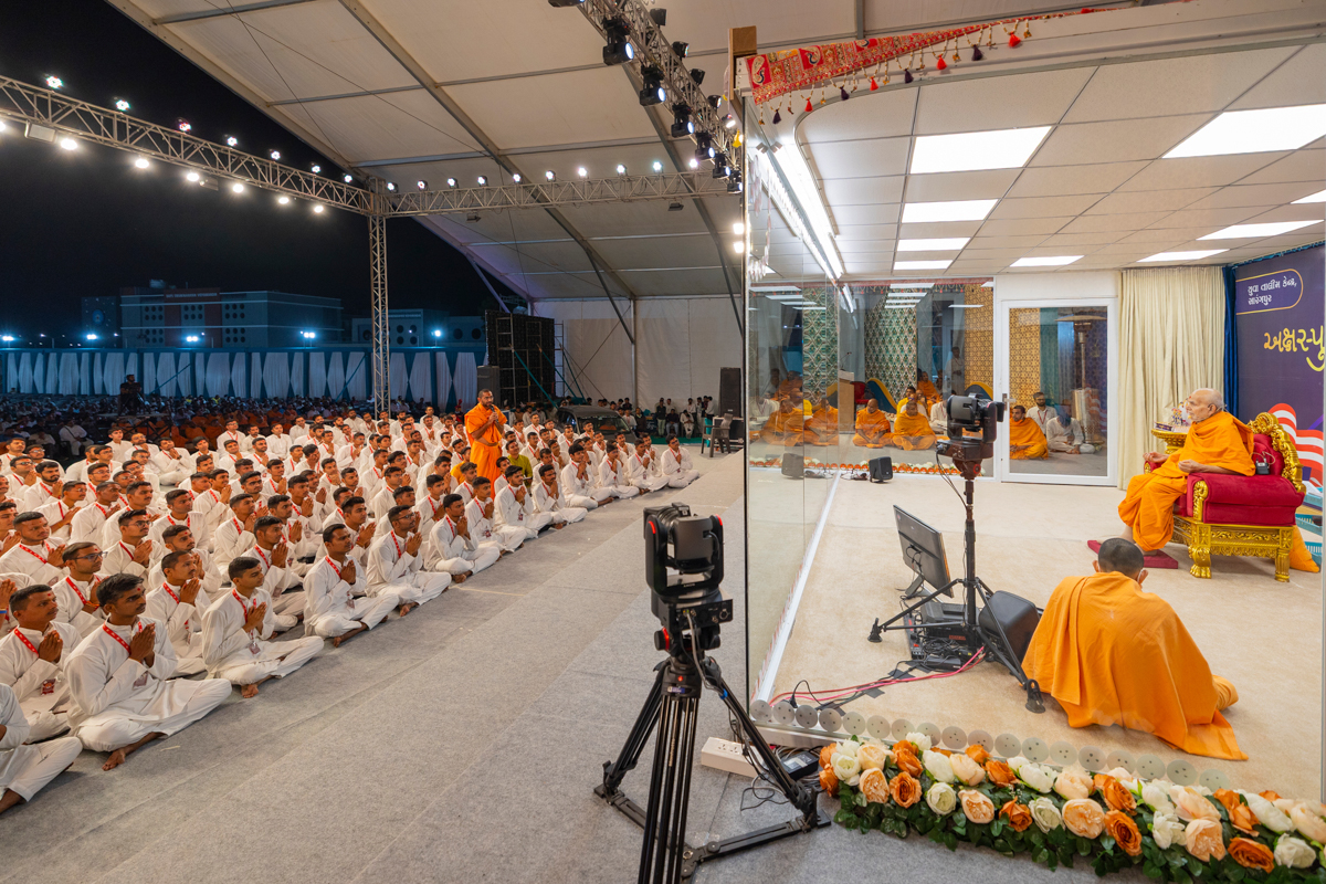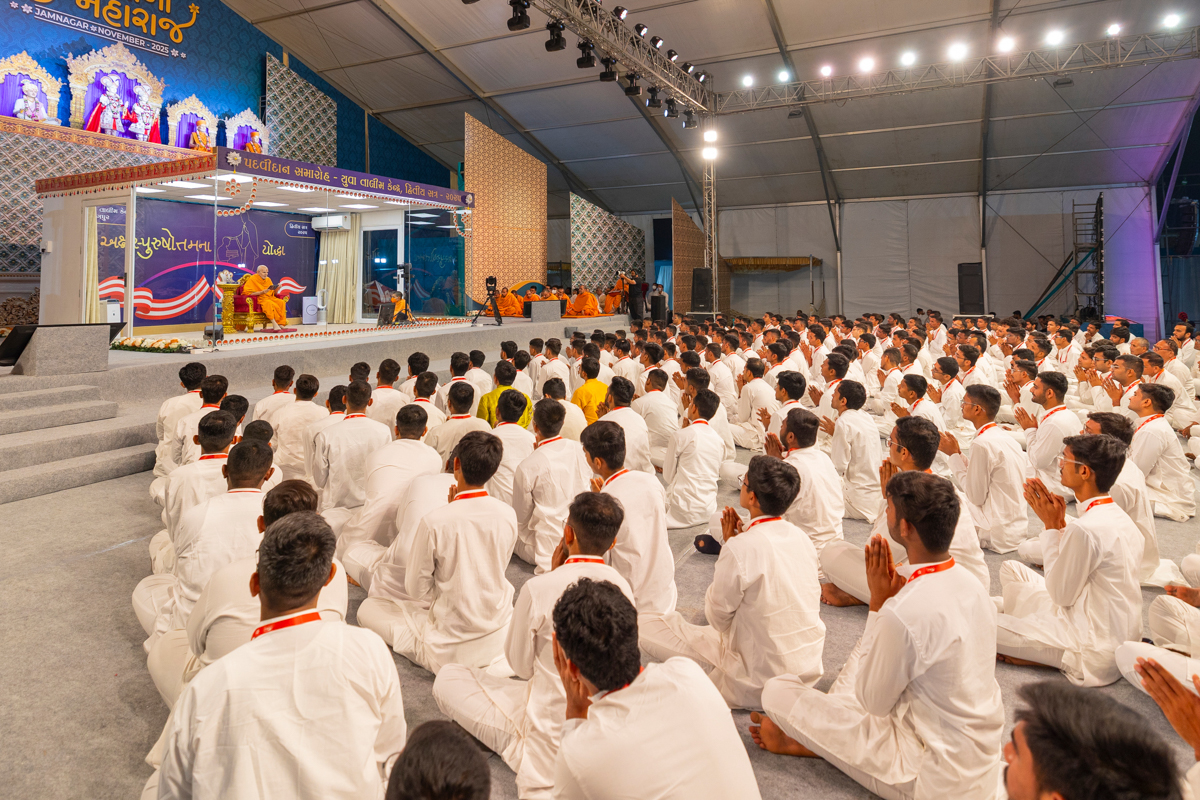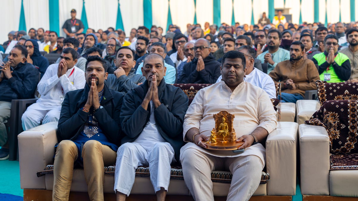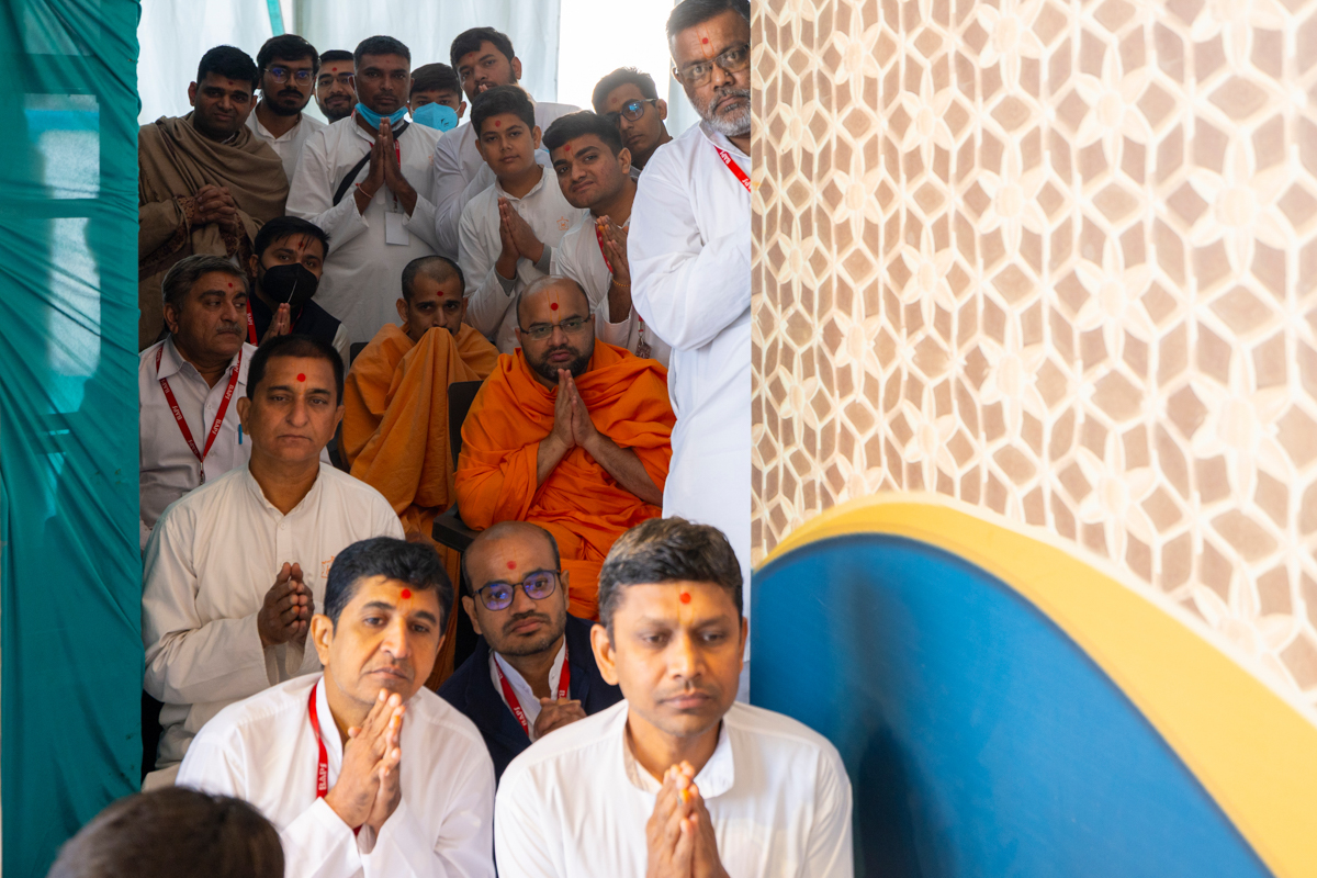 Yuvaks lead everyone in reciting the sadhana mantra and daily prayer in Swamishri's puja