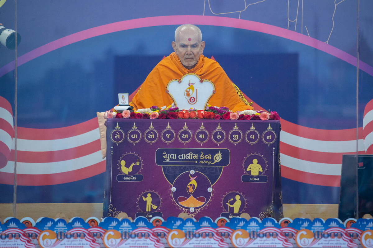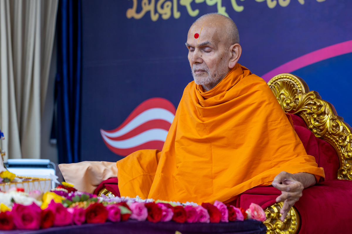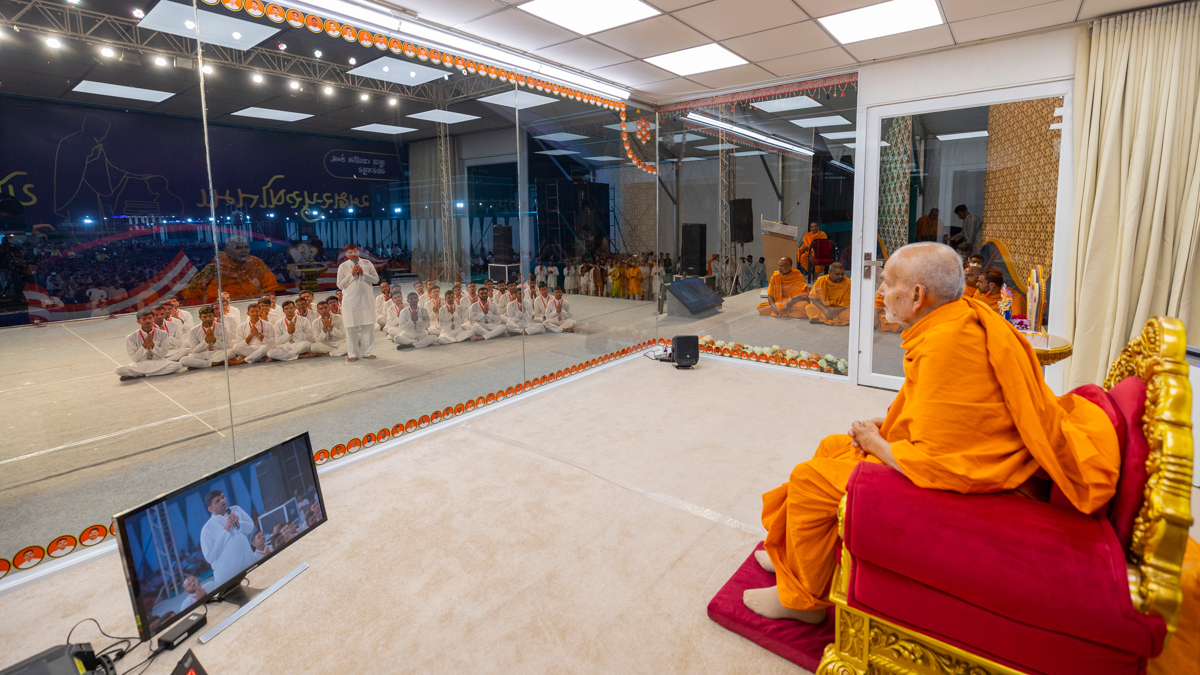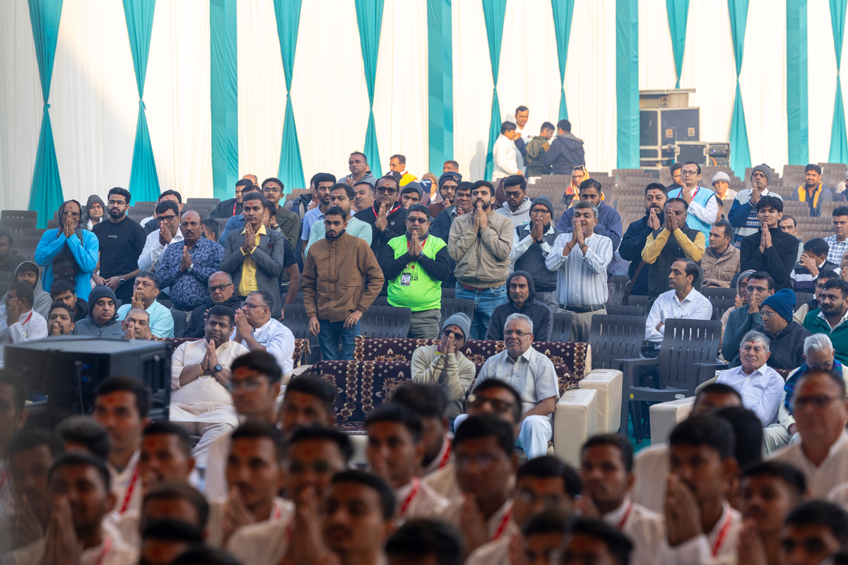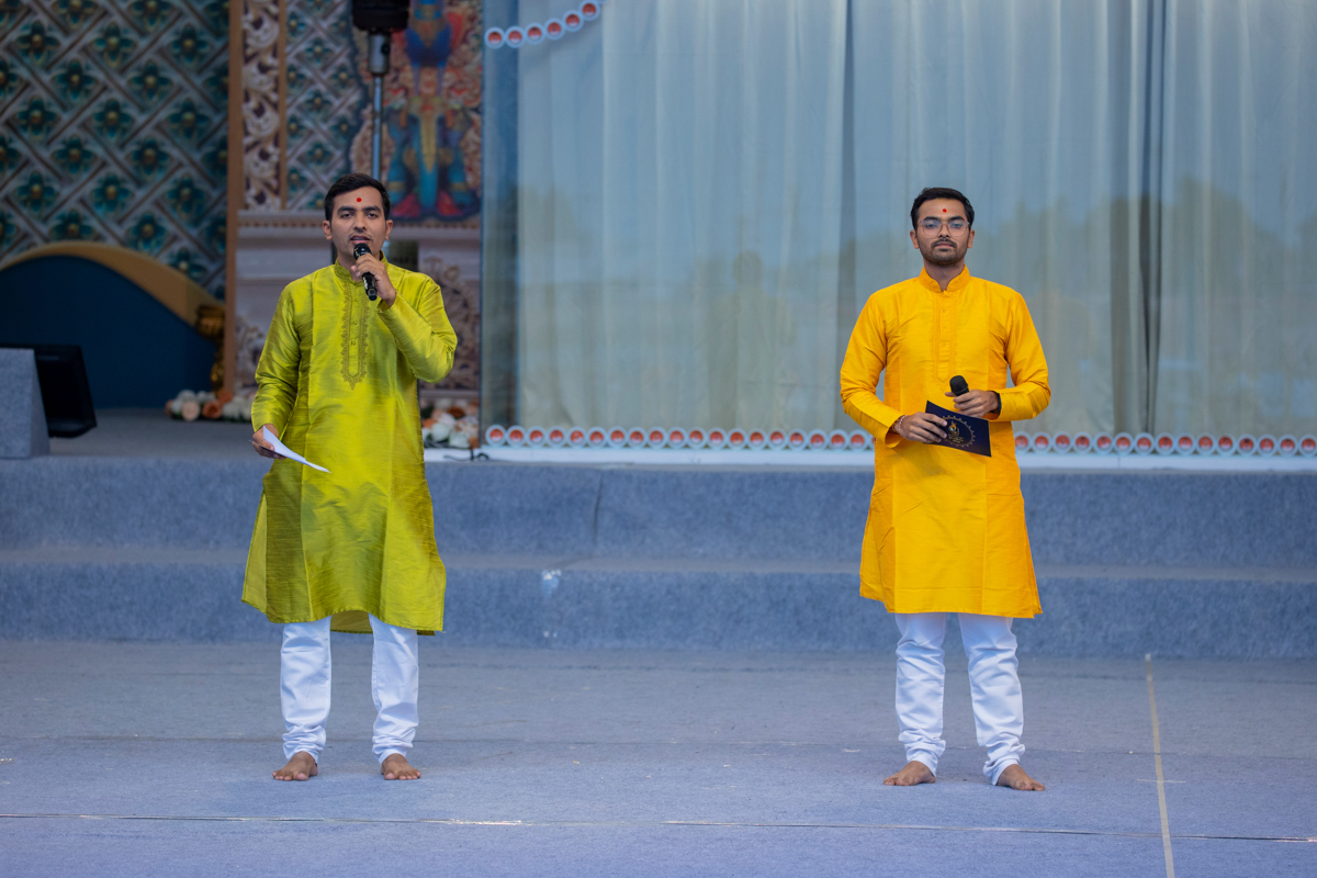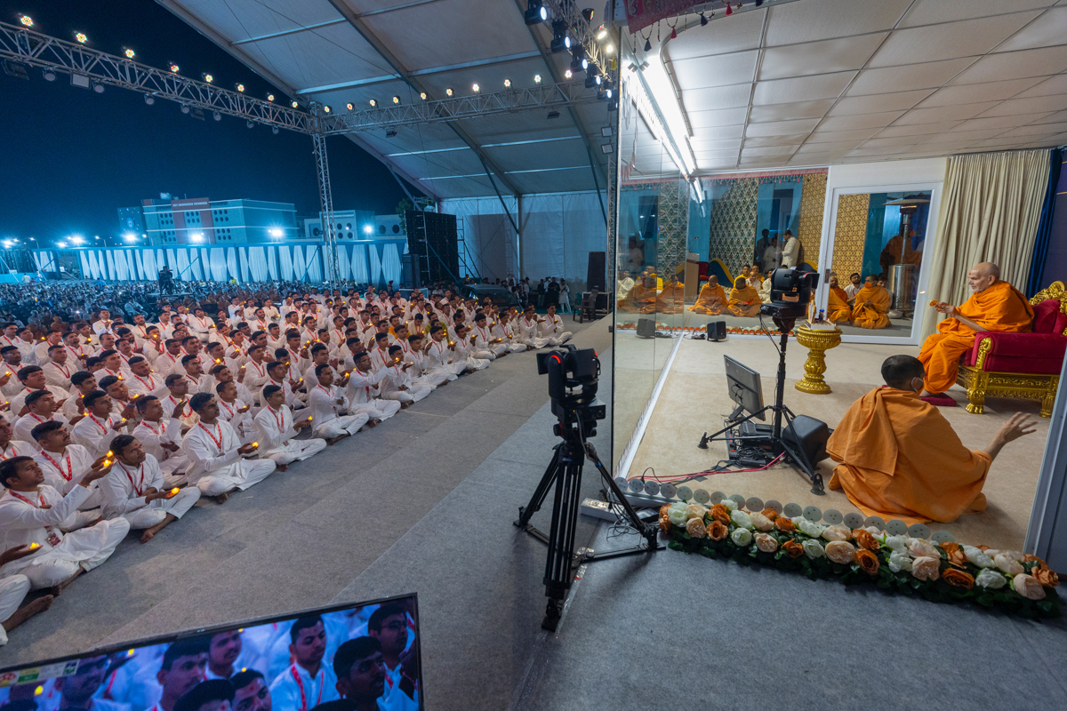 Yuvaks lead everyone in reciting the sadhana mantra and daily prayer in Swamishri's puja
