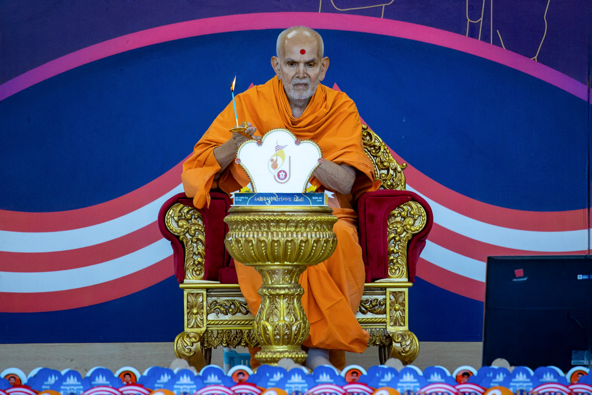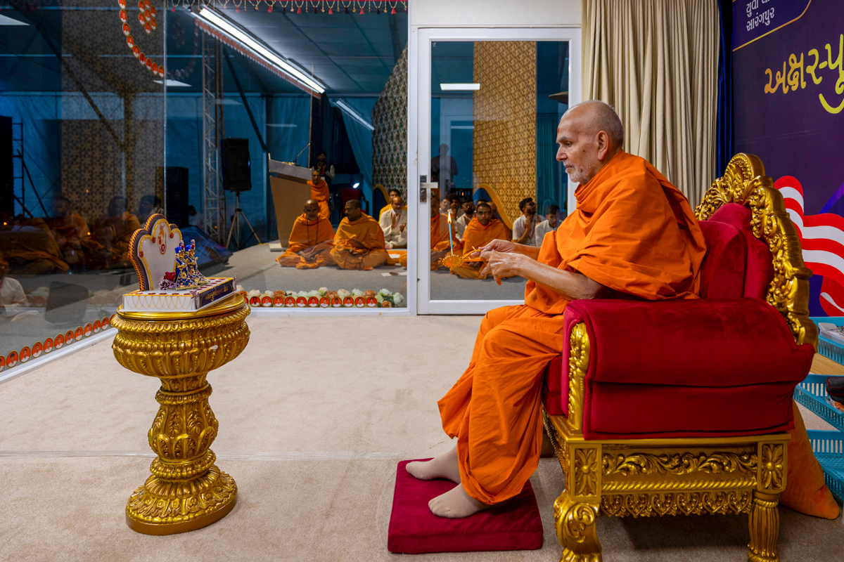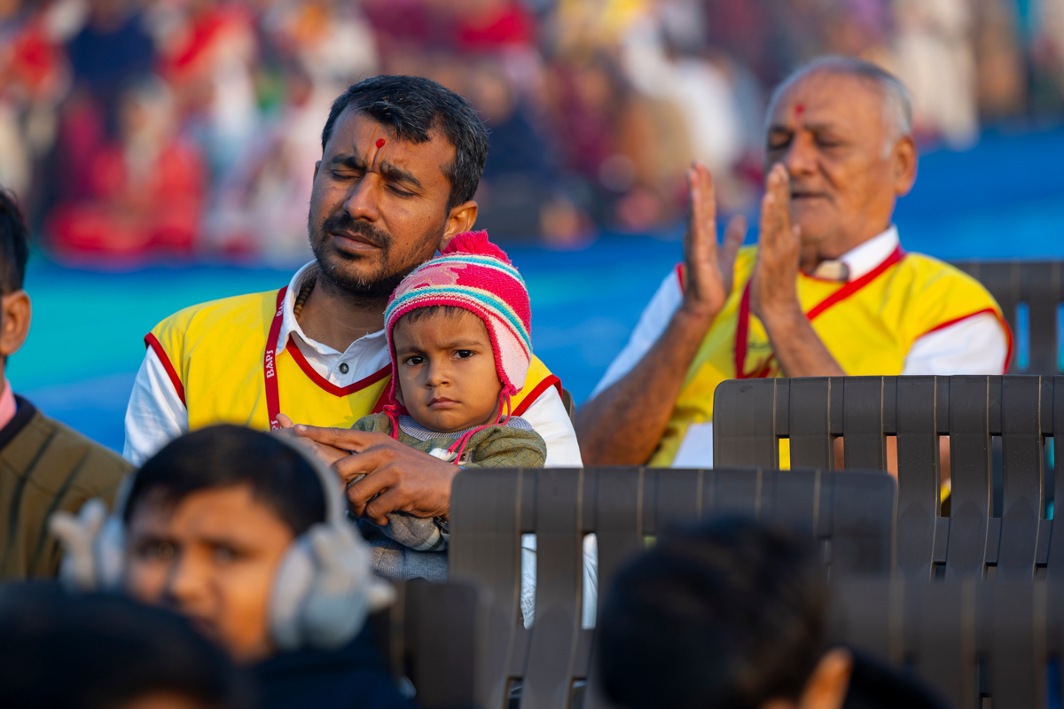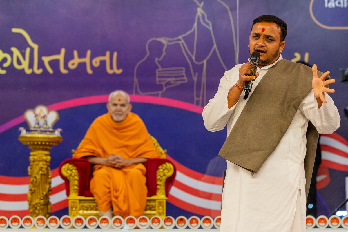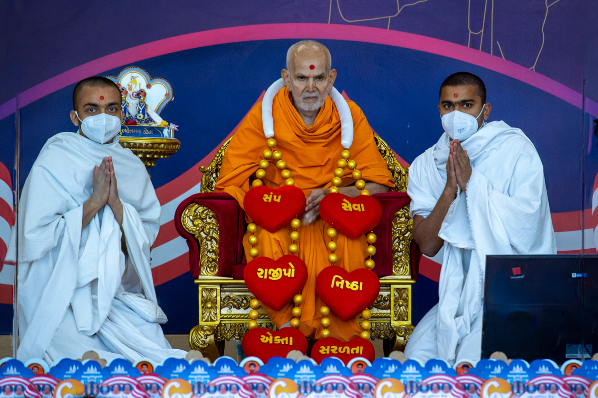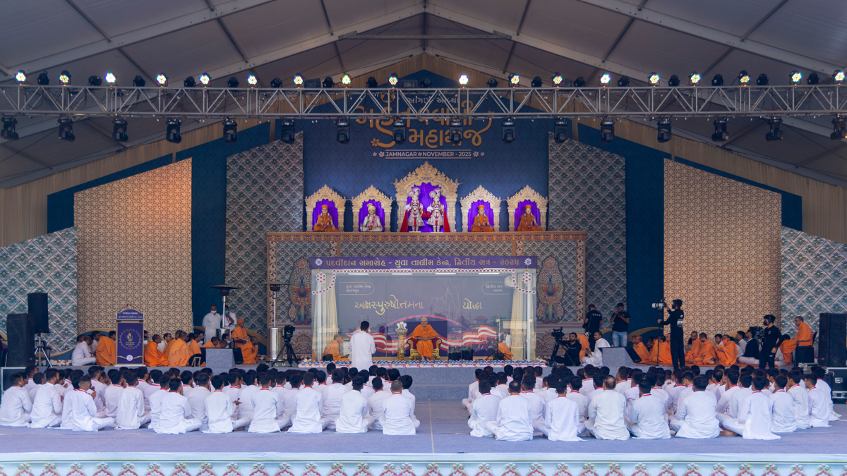 Yuvaks lead everyone in reciting the sadhana mantra and daily prayer in Swamishri's puja