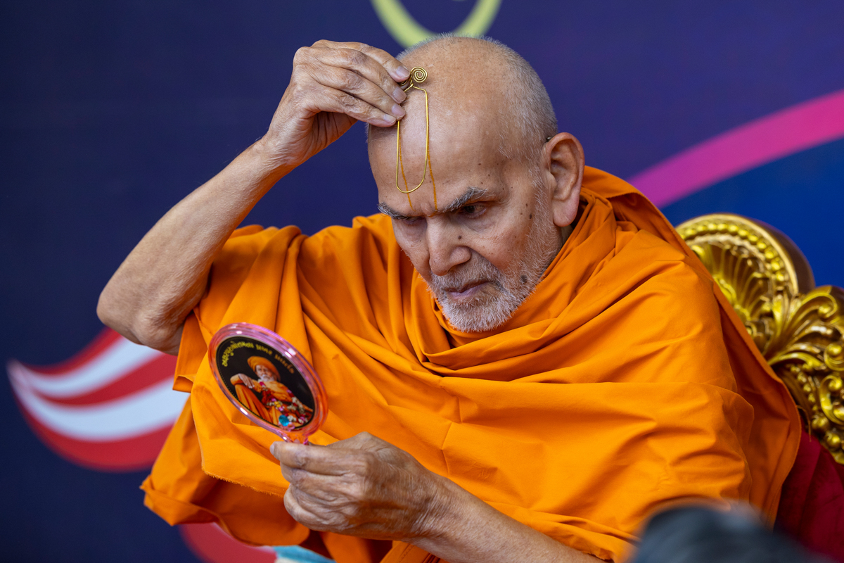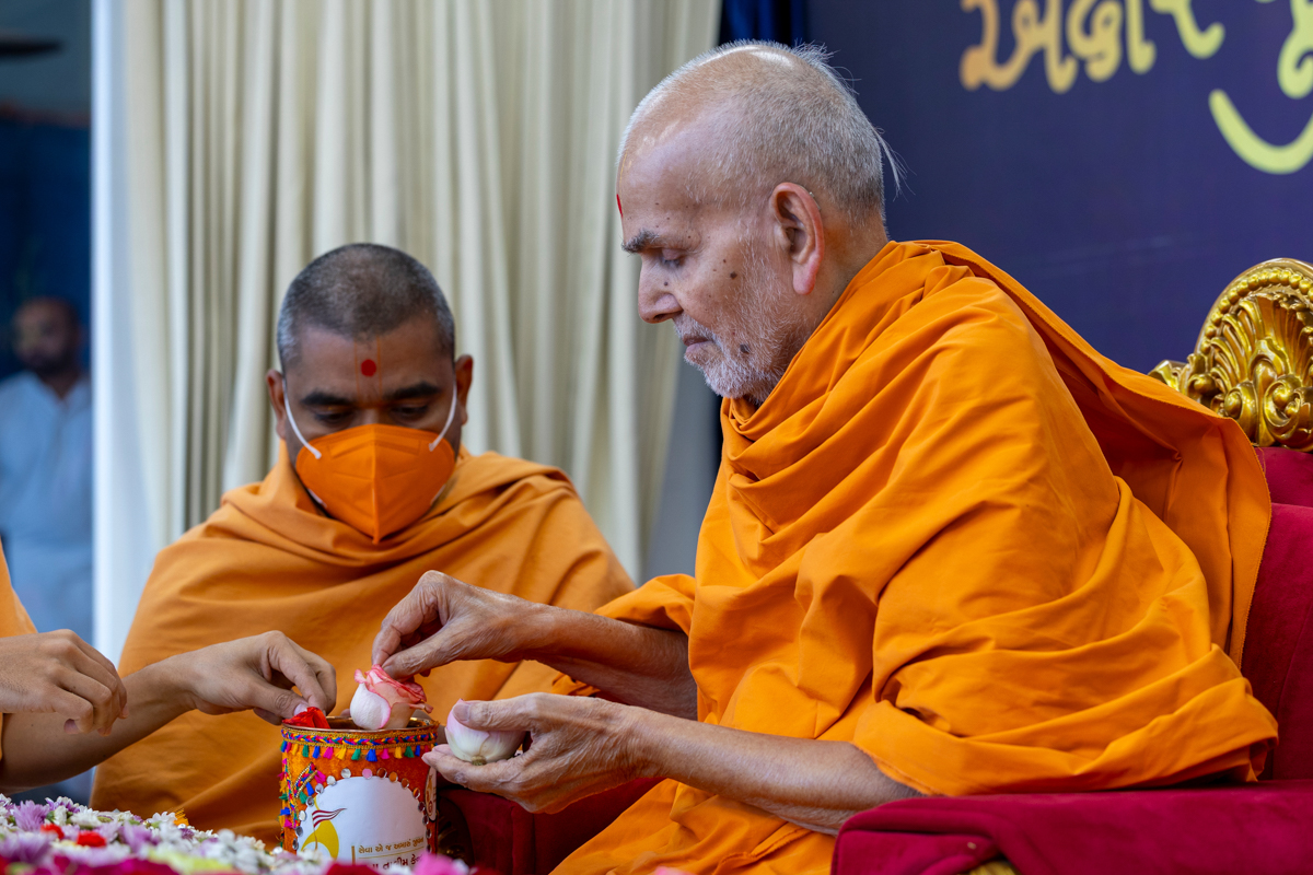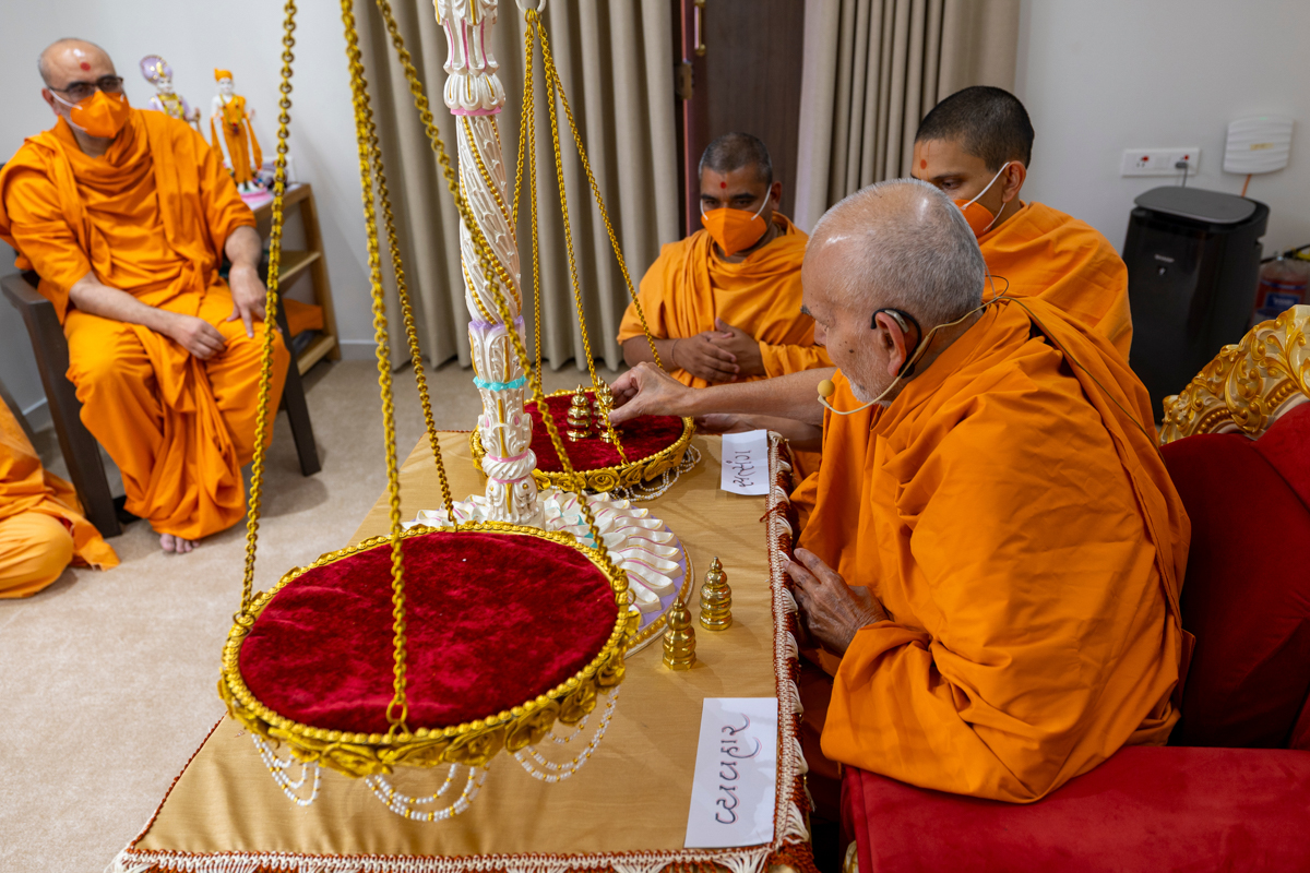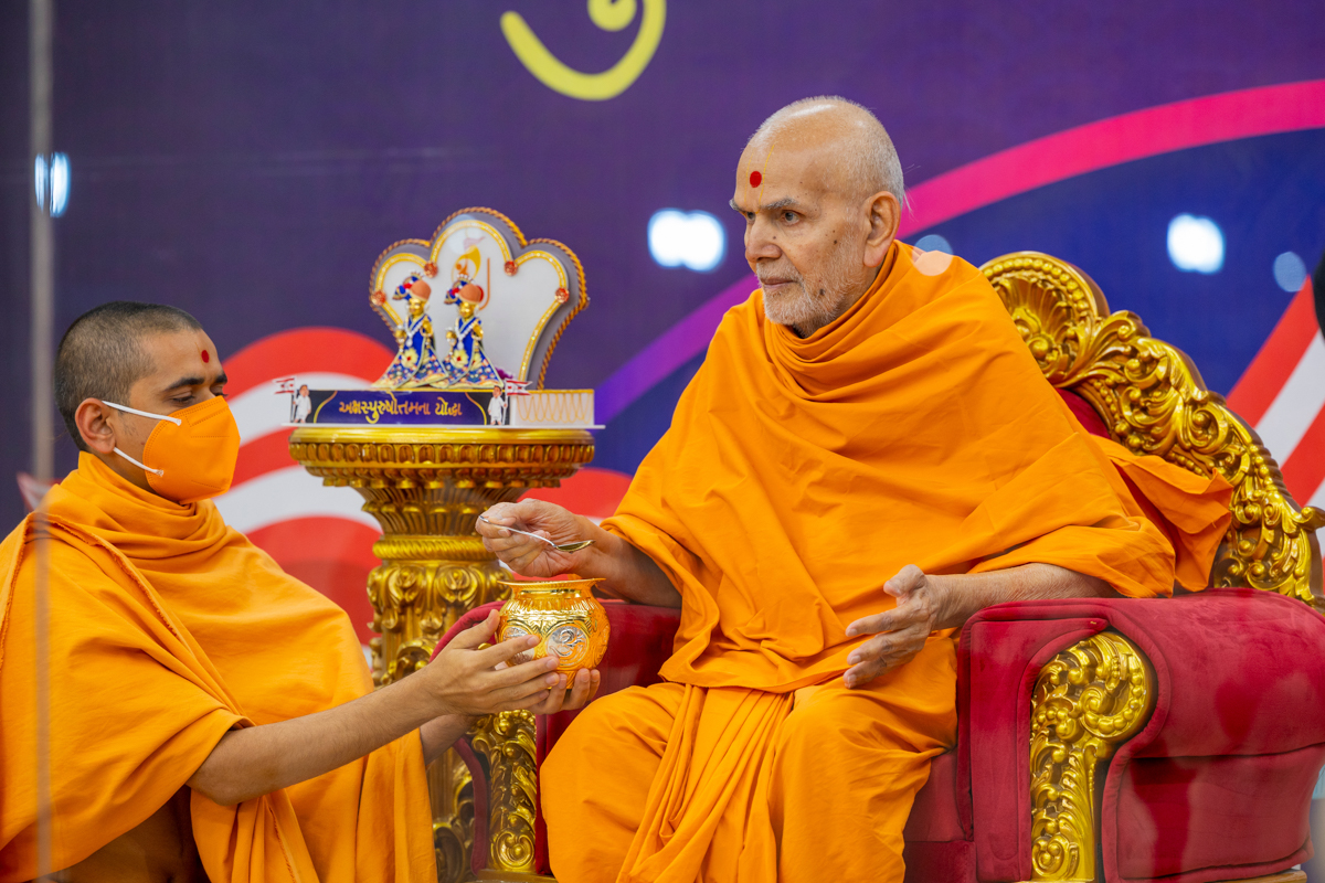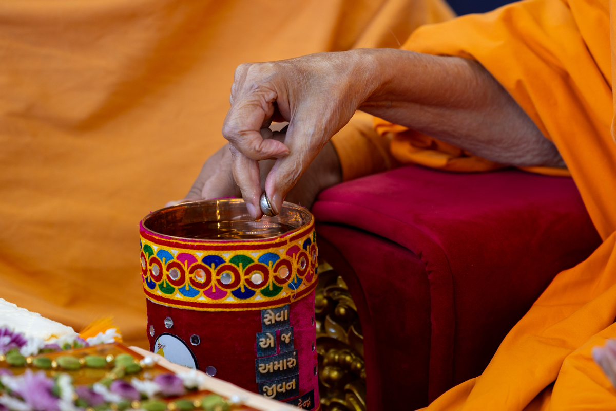 Swamishri sanctifies water with the holy relics of Bhagwan Swaminarayan and the Guru Parampara