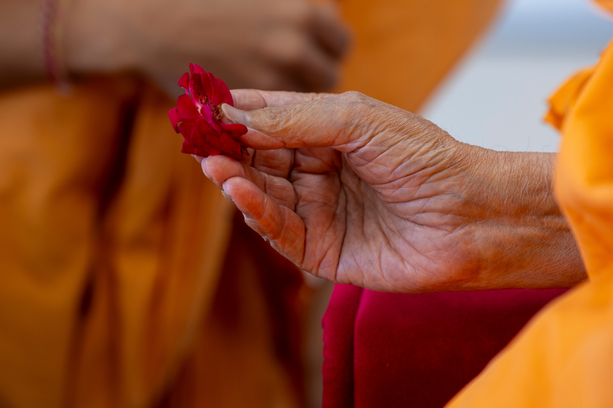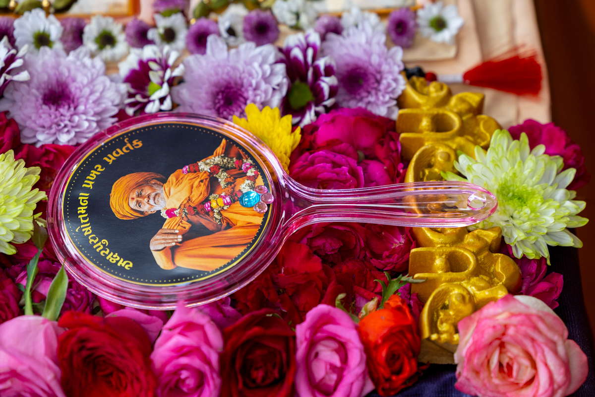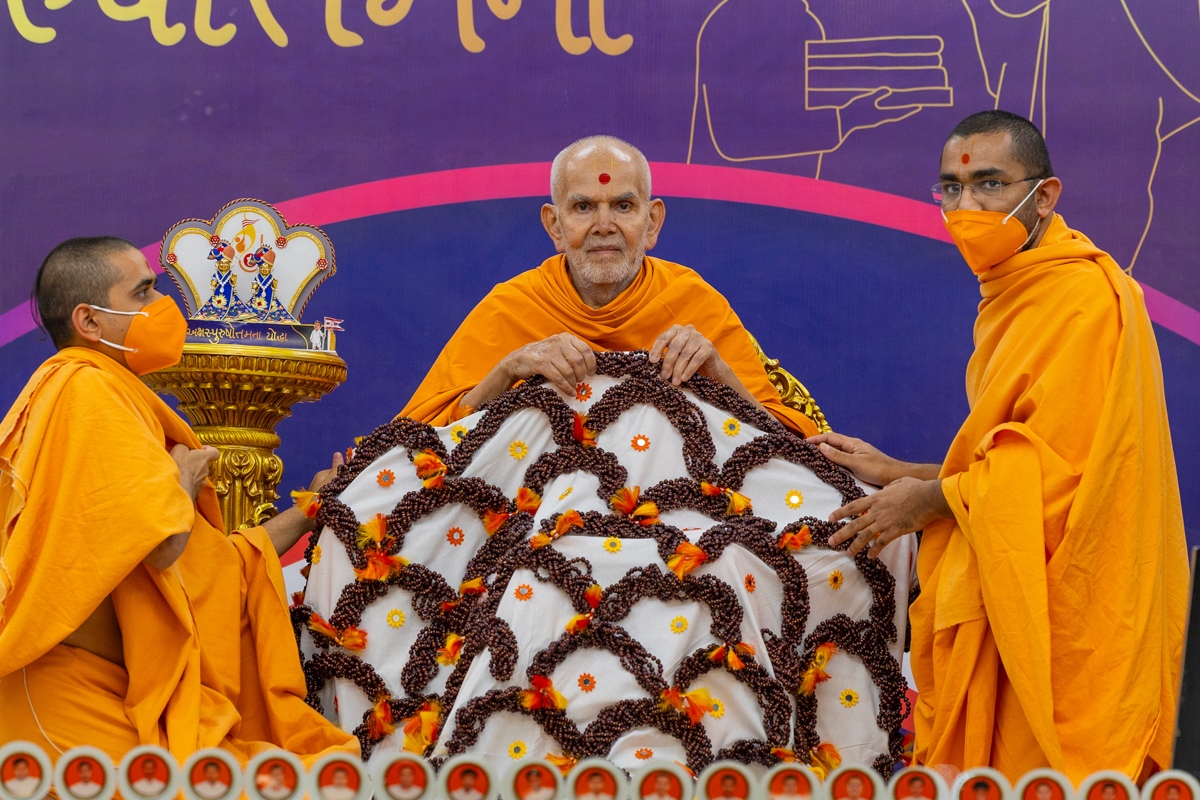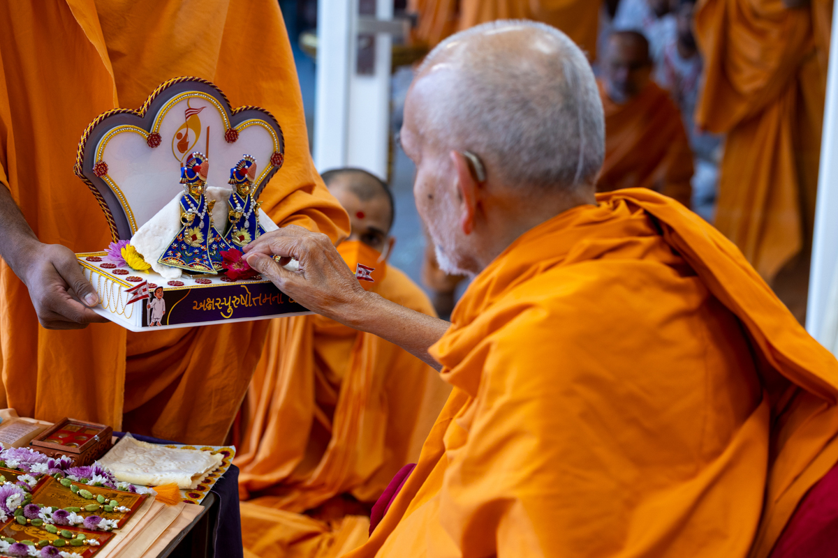 Swamishri places a flower at the feet of Shri Harikrishna Maharaj and Shri Gunatitanand Swami Maharaj