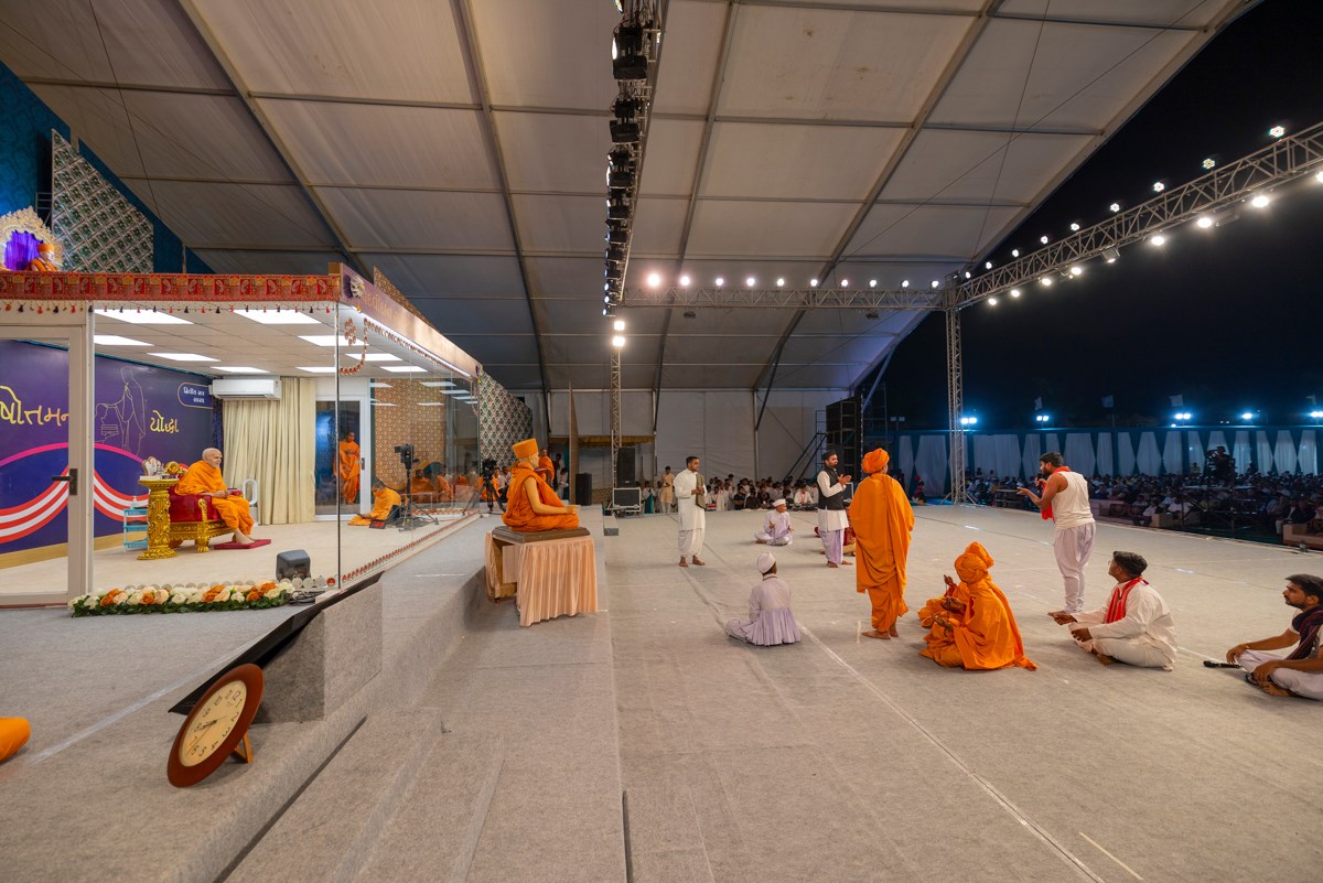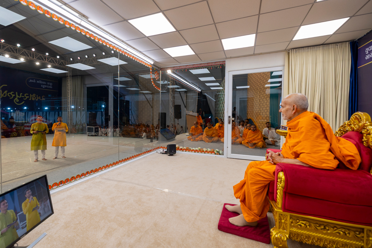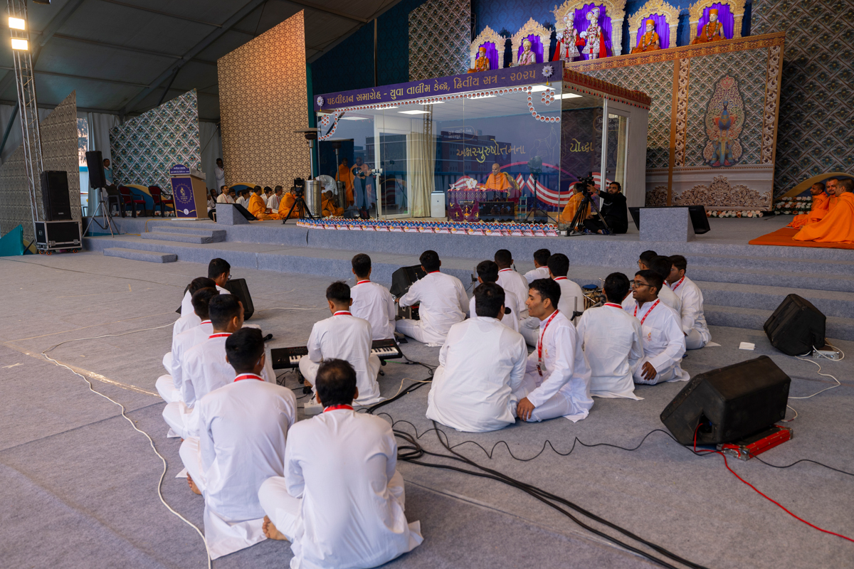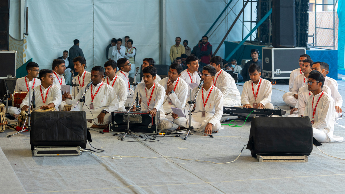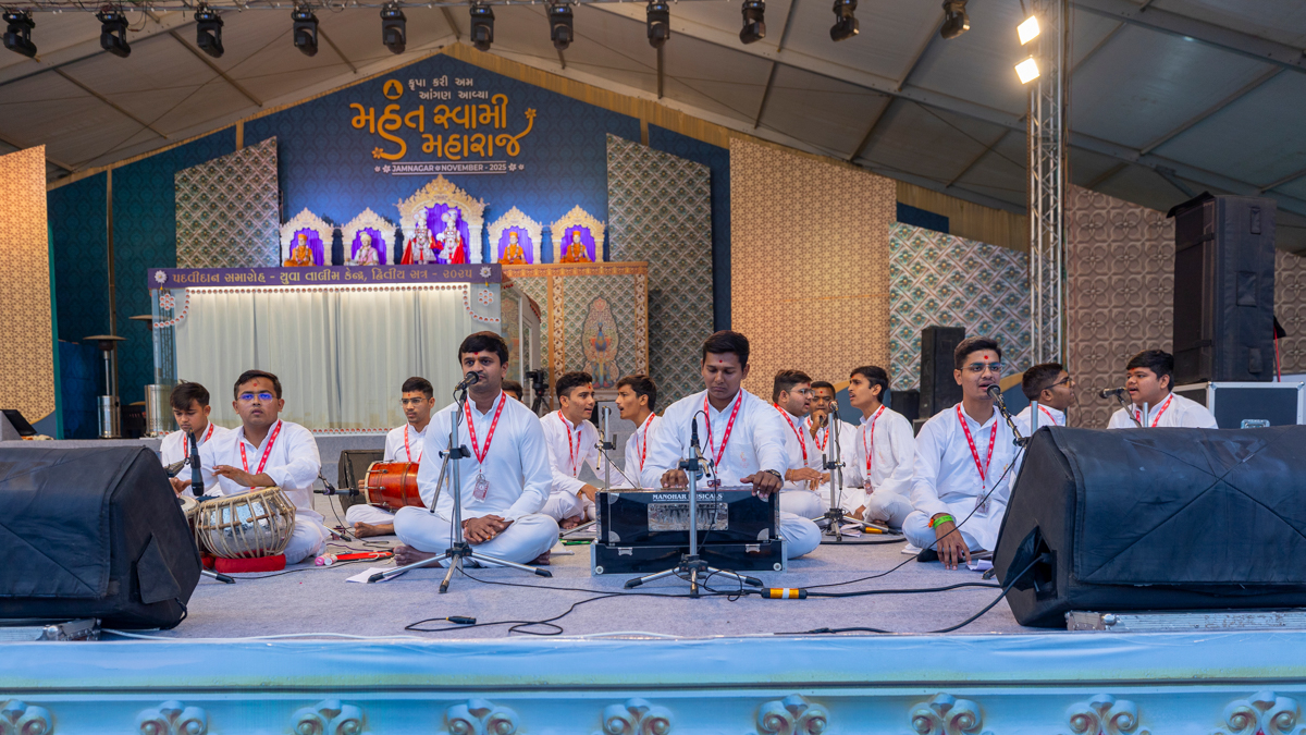 Yuvaks from Yuva Talim Kendra, Sarangpur, sing kirtans in Swamishri's daily puja