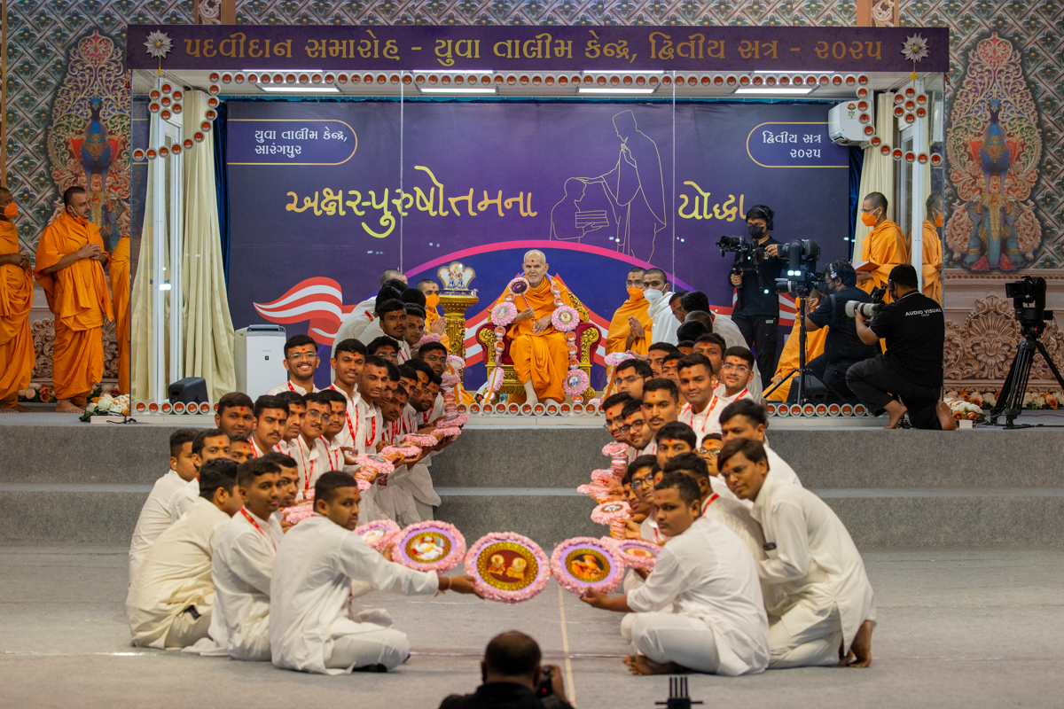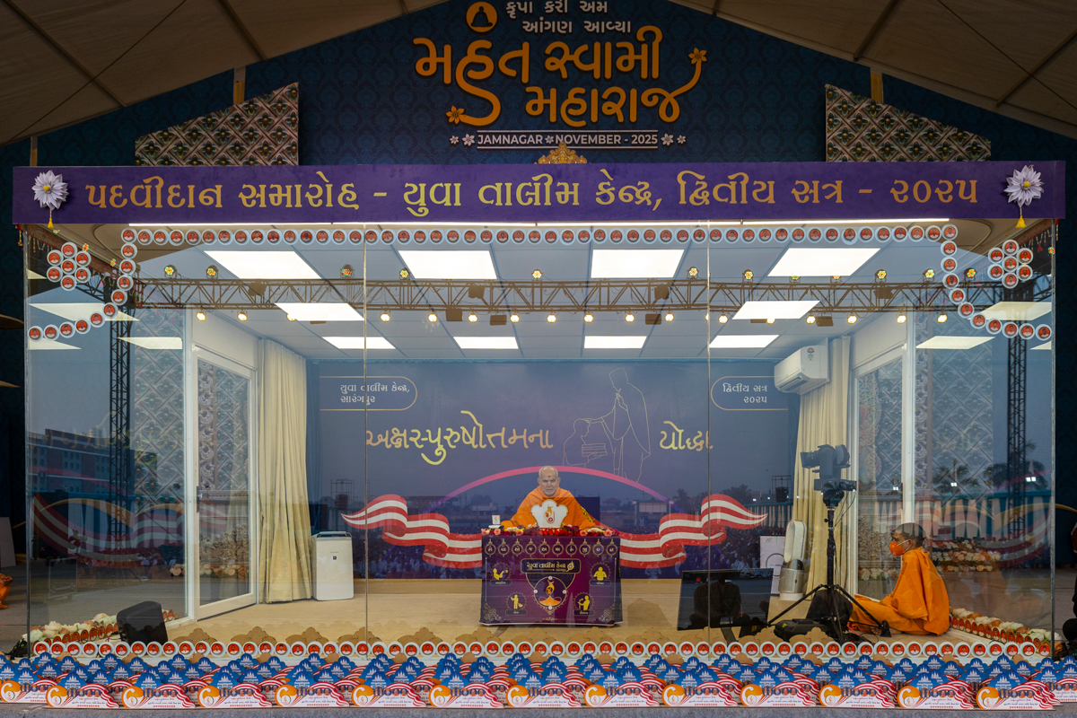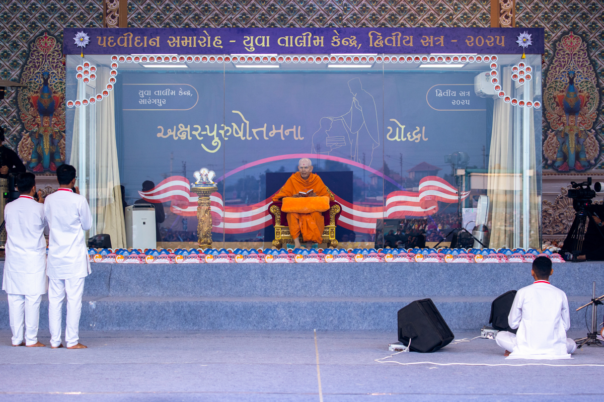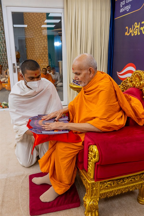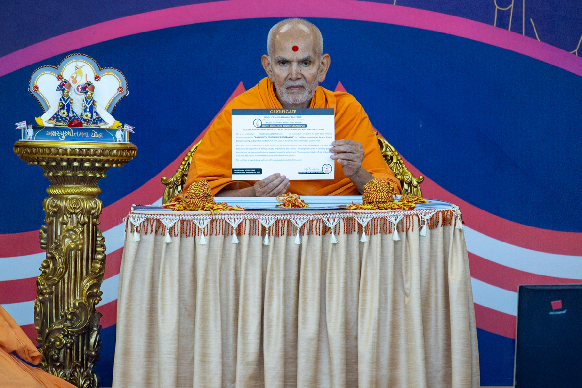 Swamishri sanctifies certificates for yuvaks of the Yuva Talim Kendra