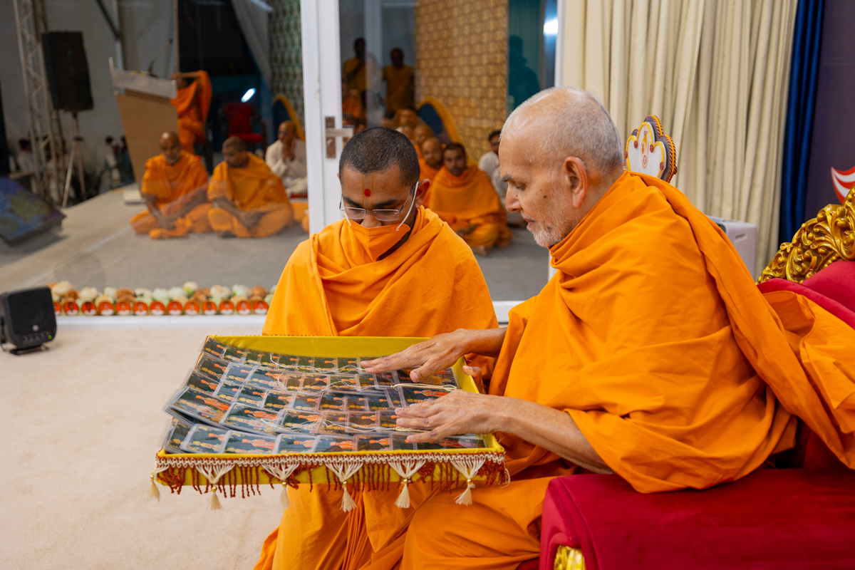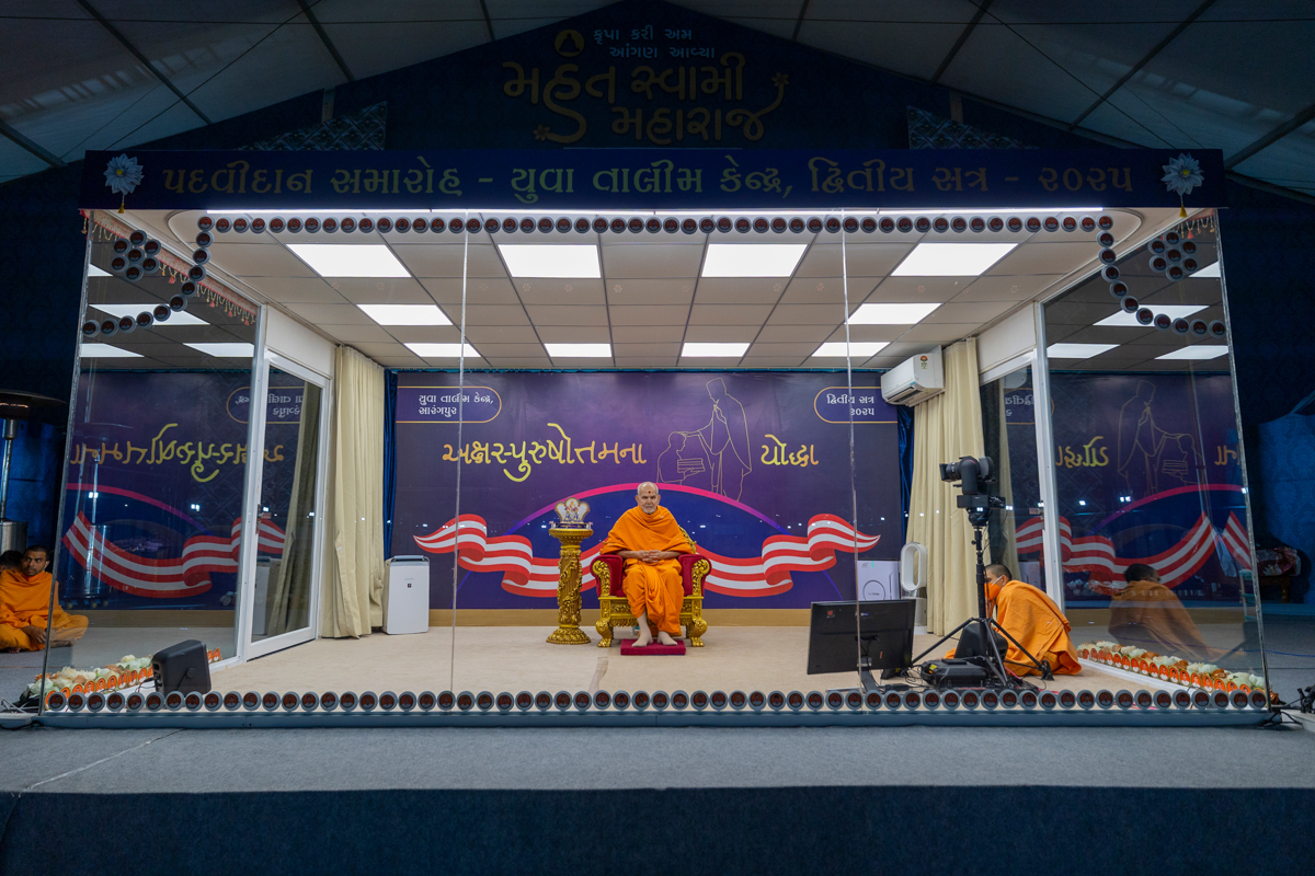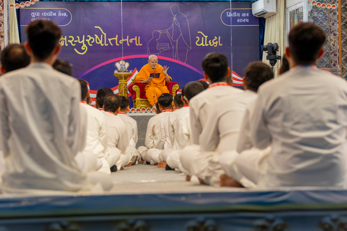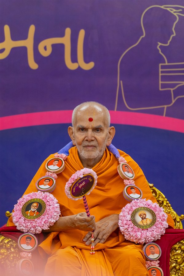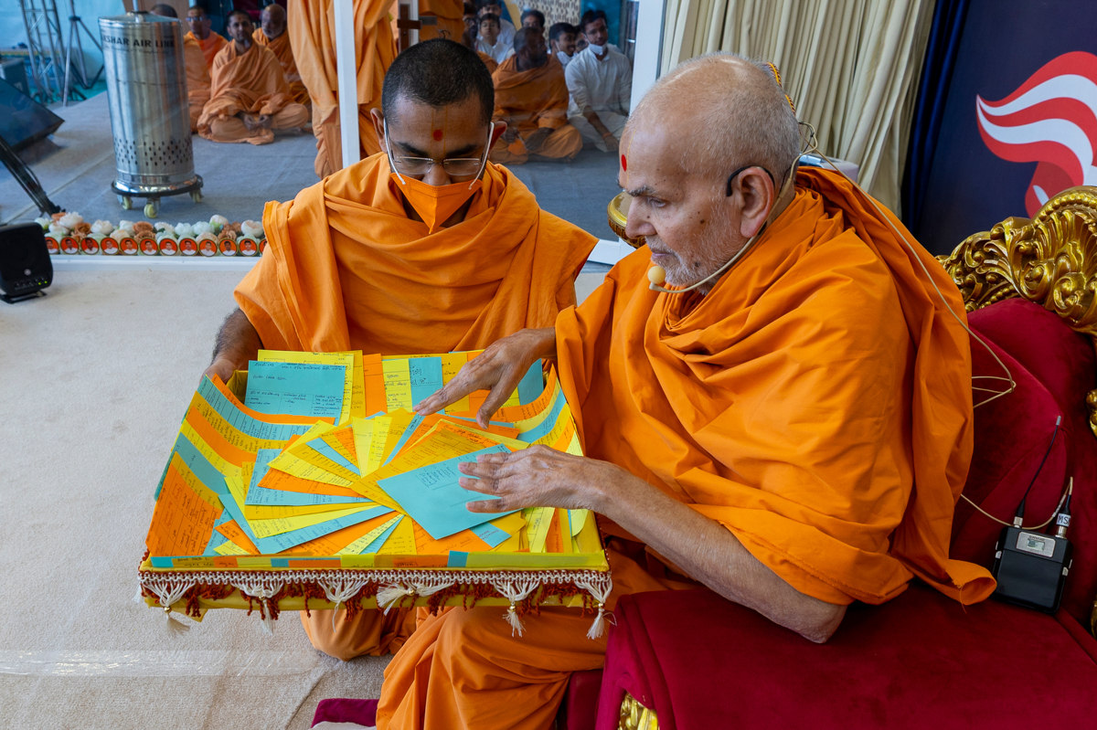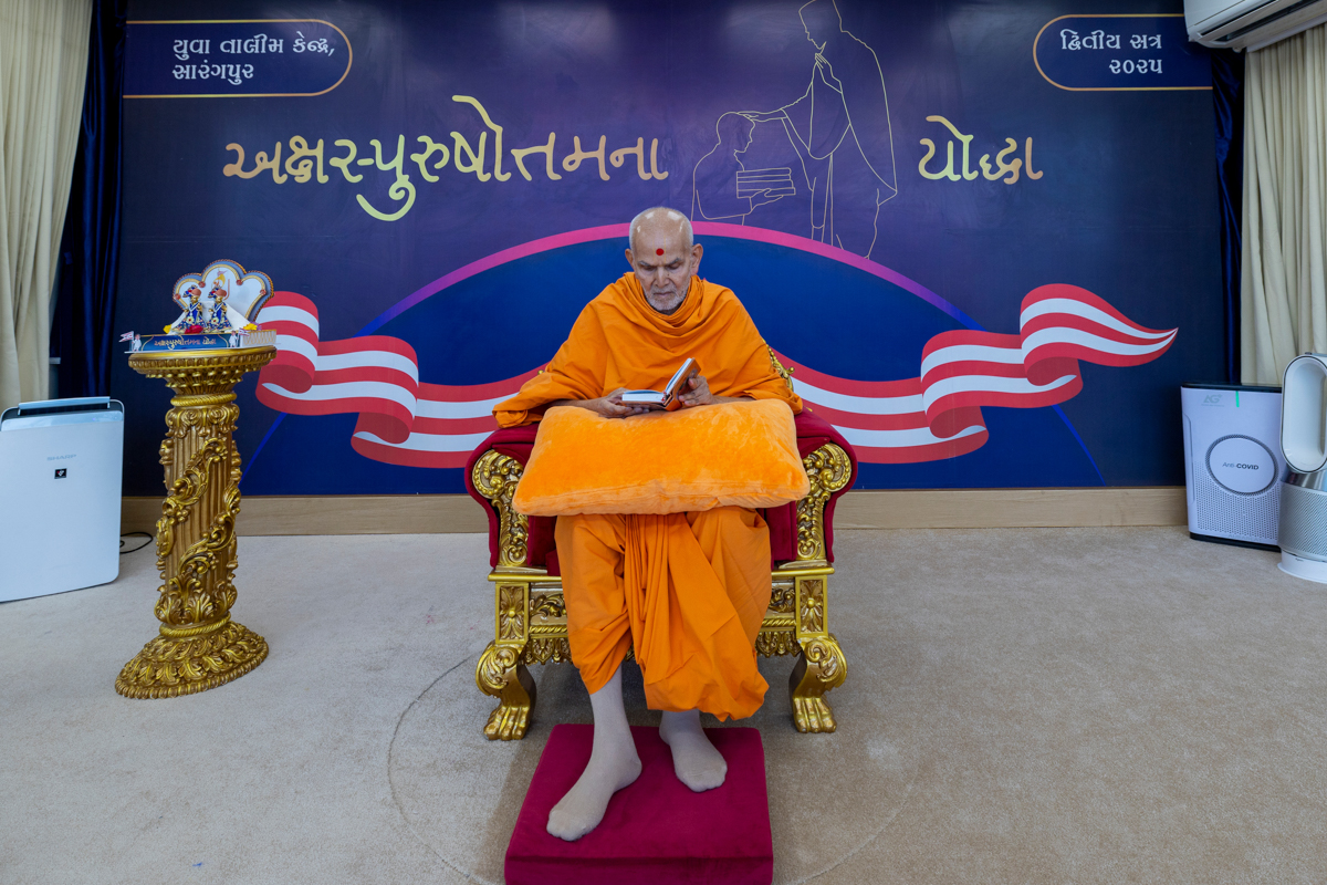 Swamishri sanctifies certificates for yuvaks of the Yuva Talim Kendra