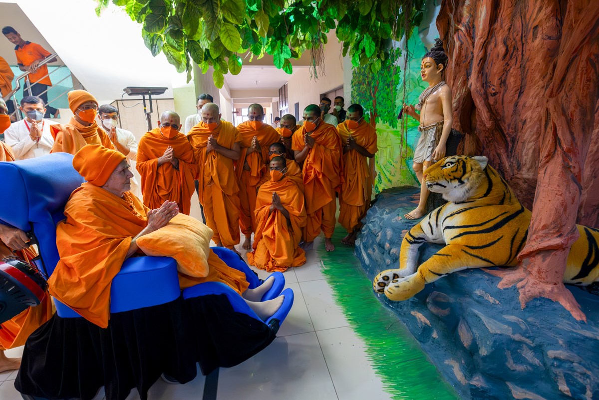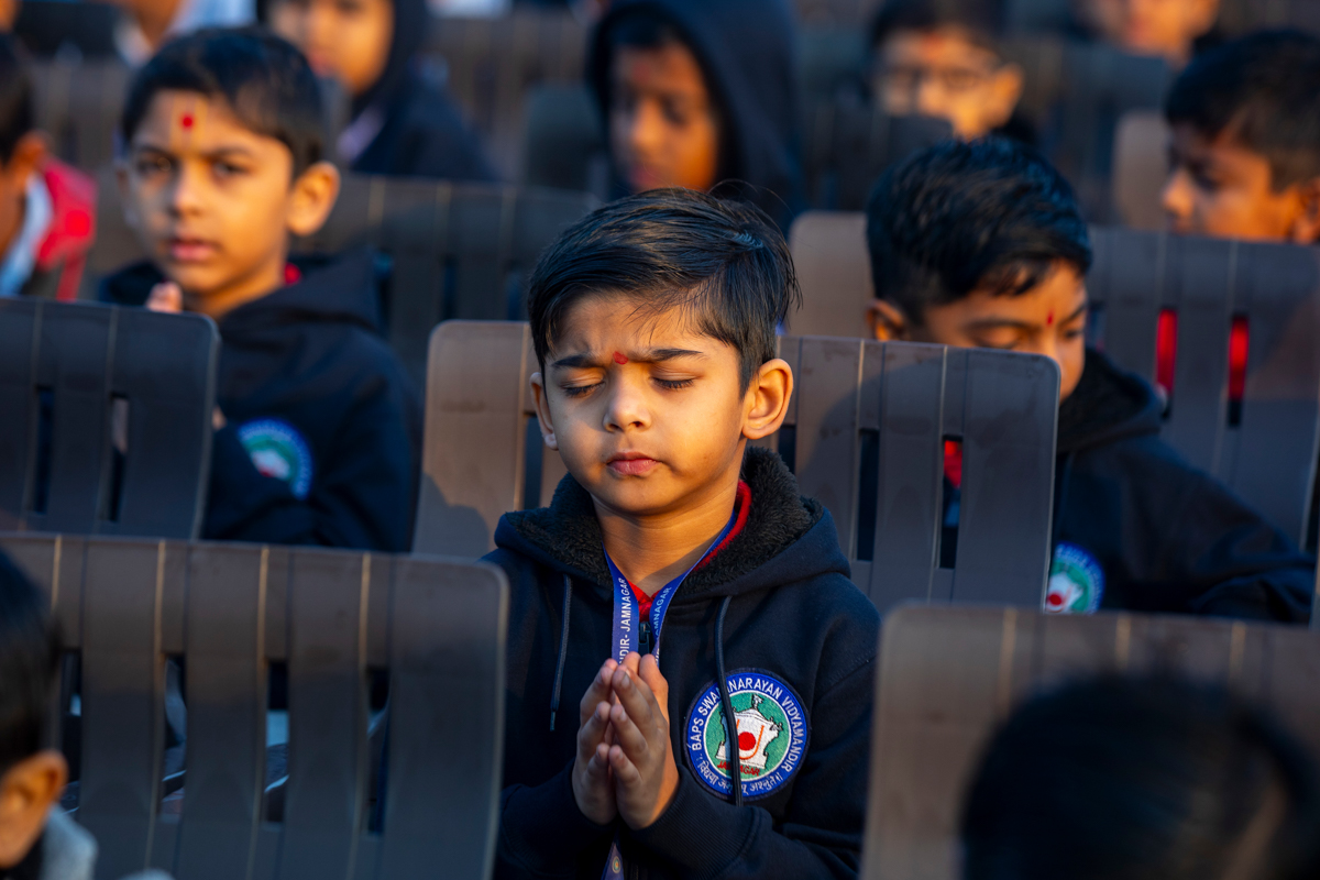 Students from BAPS Swaminarayan Vidyamandir, Jamnagar, doing Swamishri's puja darshan