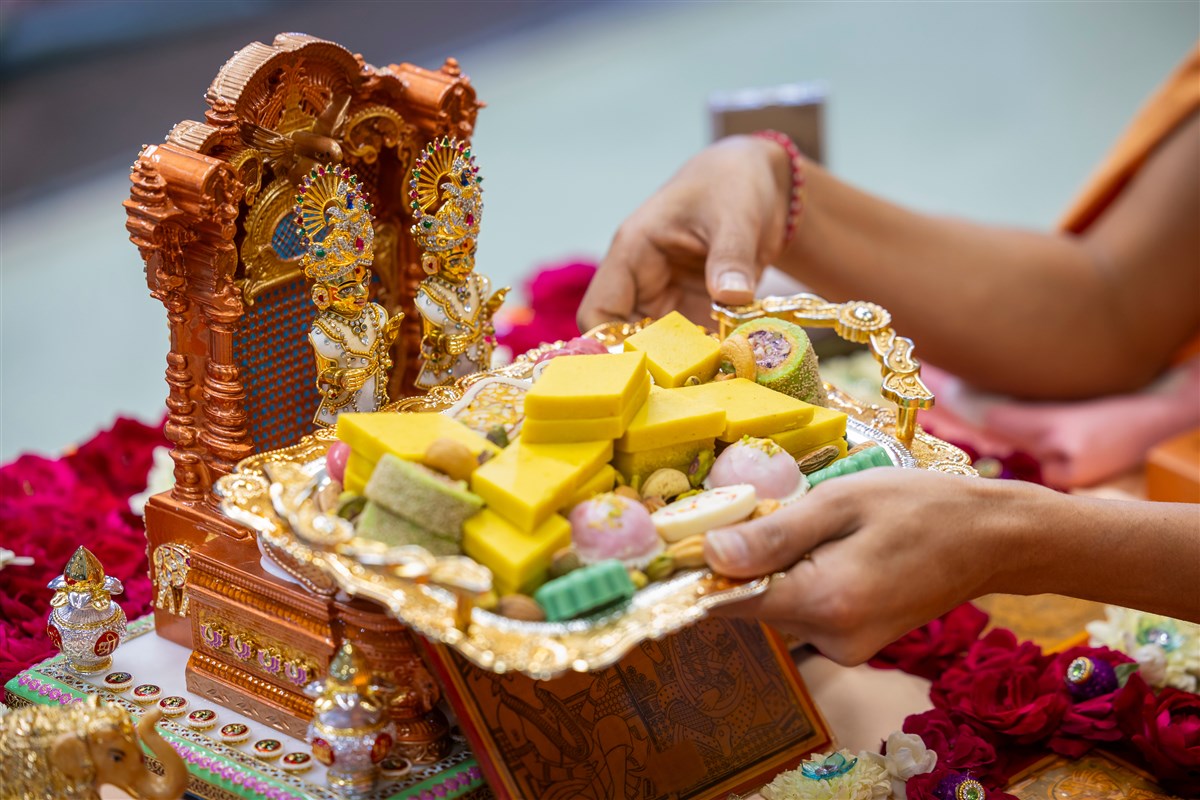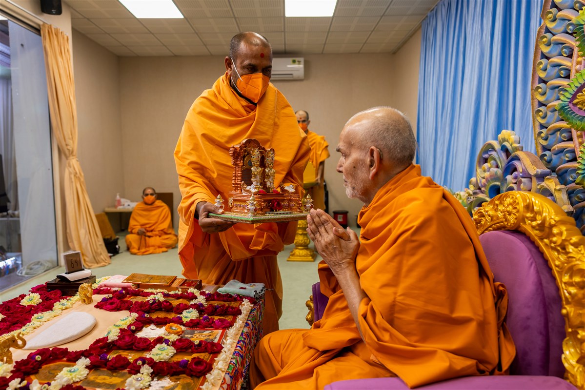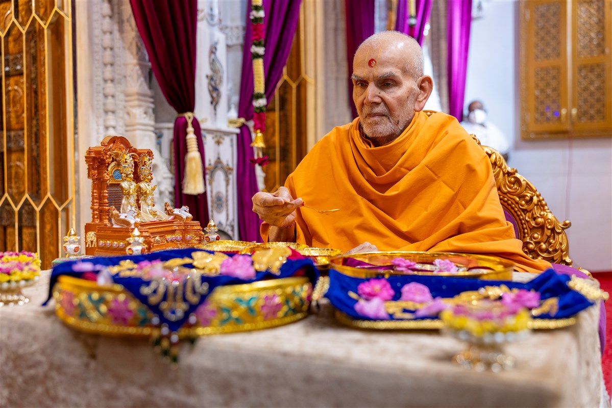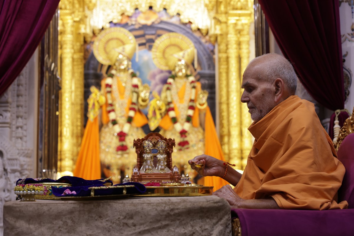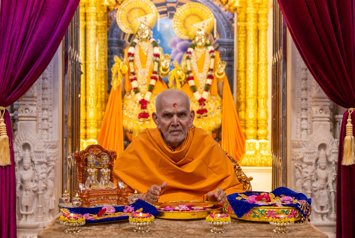 Swamishri offers thal to Shri Harikrishna Maharaj and Shri Gunatitanand Swami Maharaj