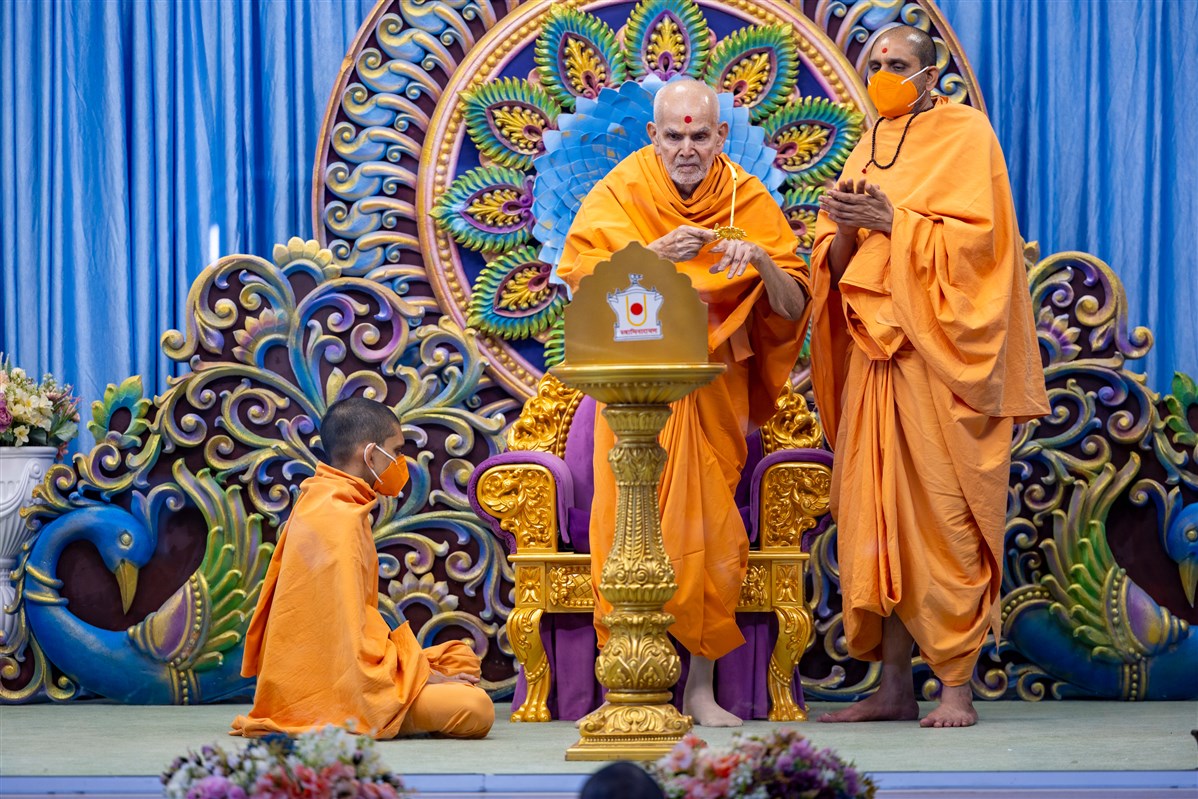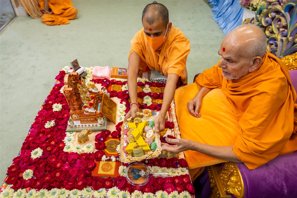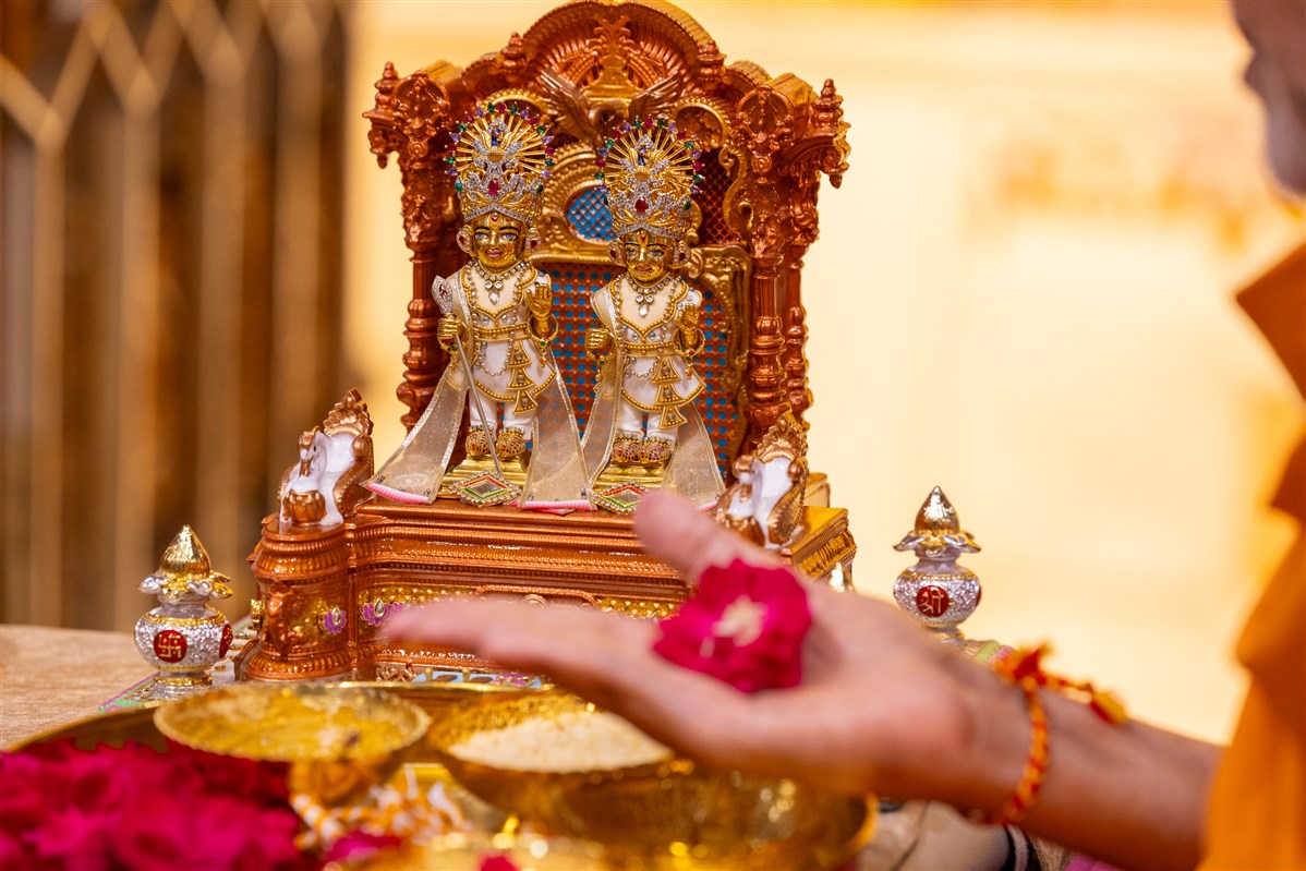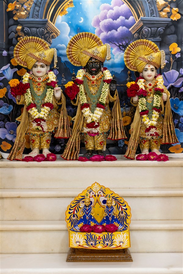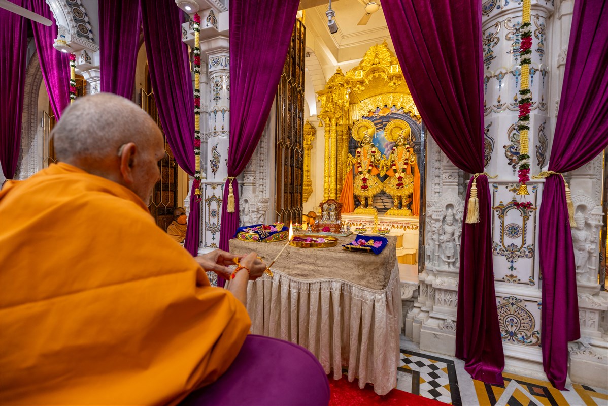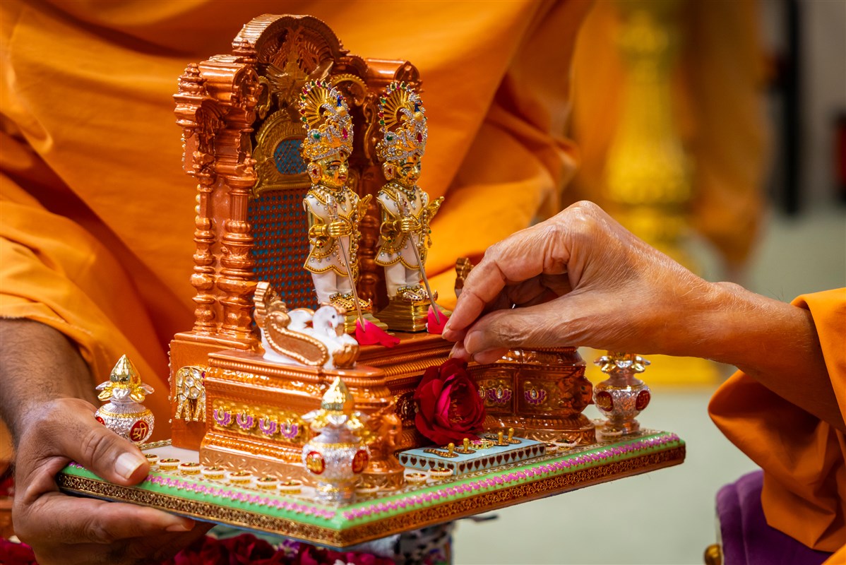 Swamishri offers thal to Shri Harikrishna Maharaj and Shri Gunatitanand Swami Maharaj