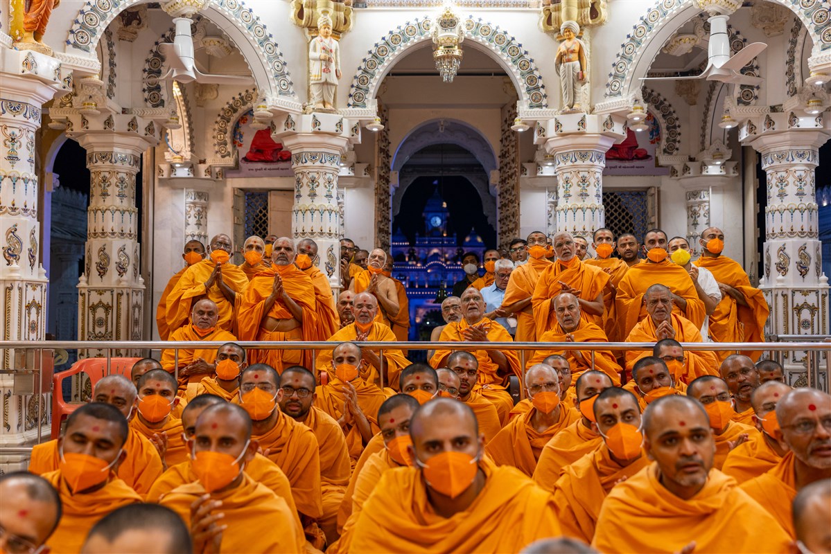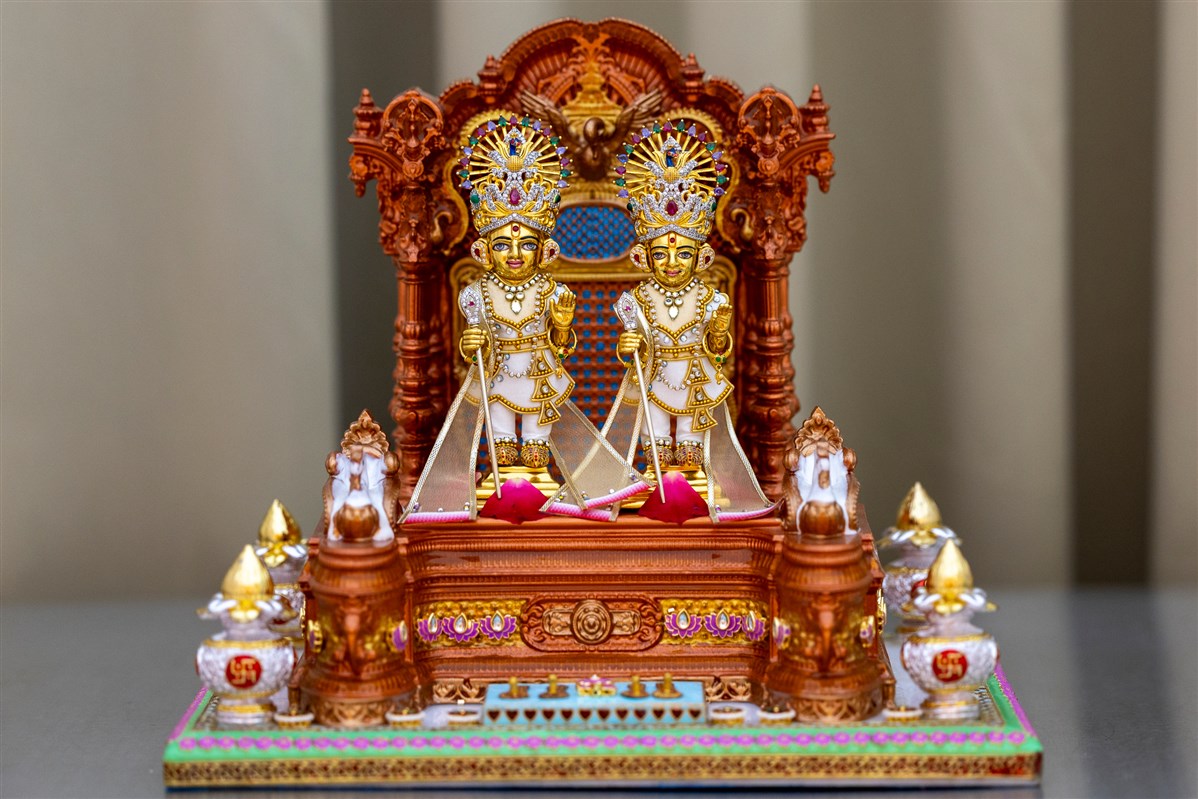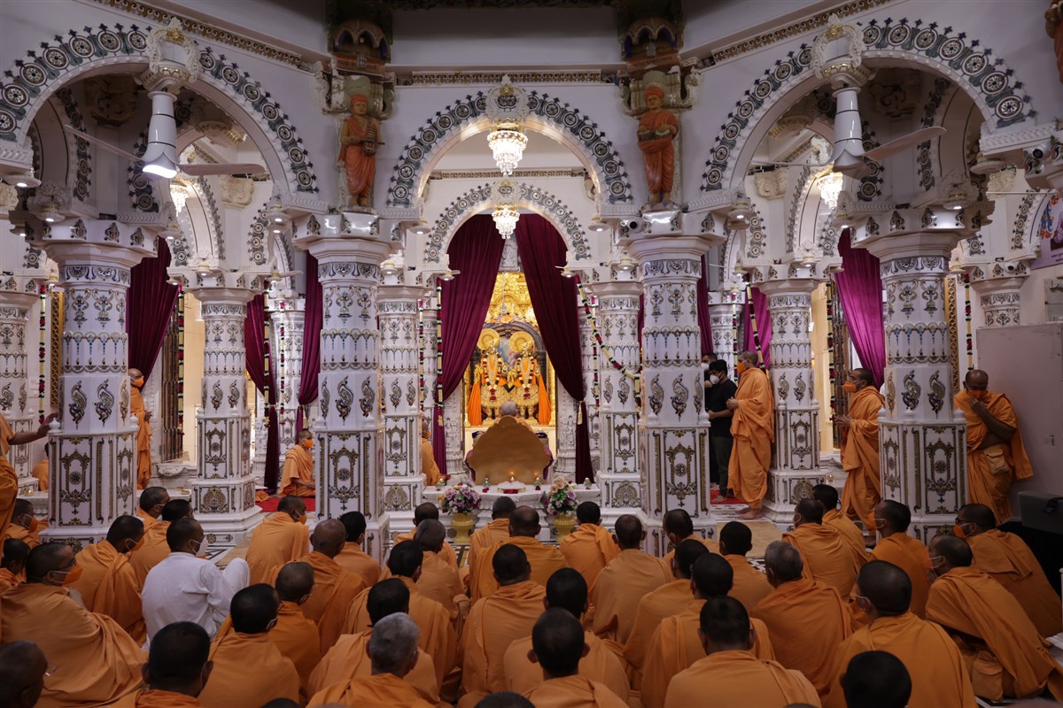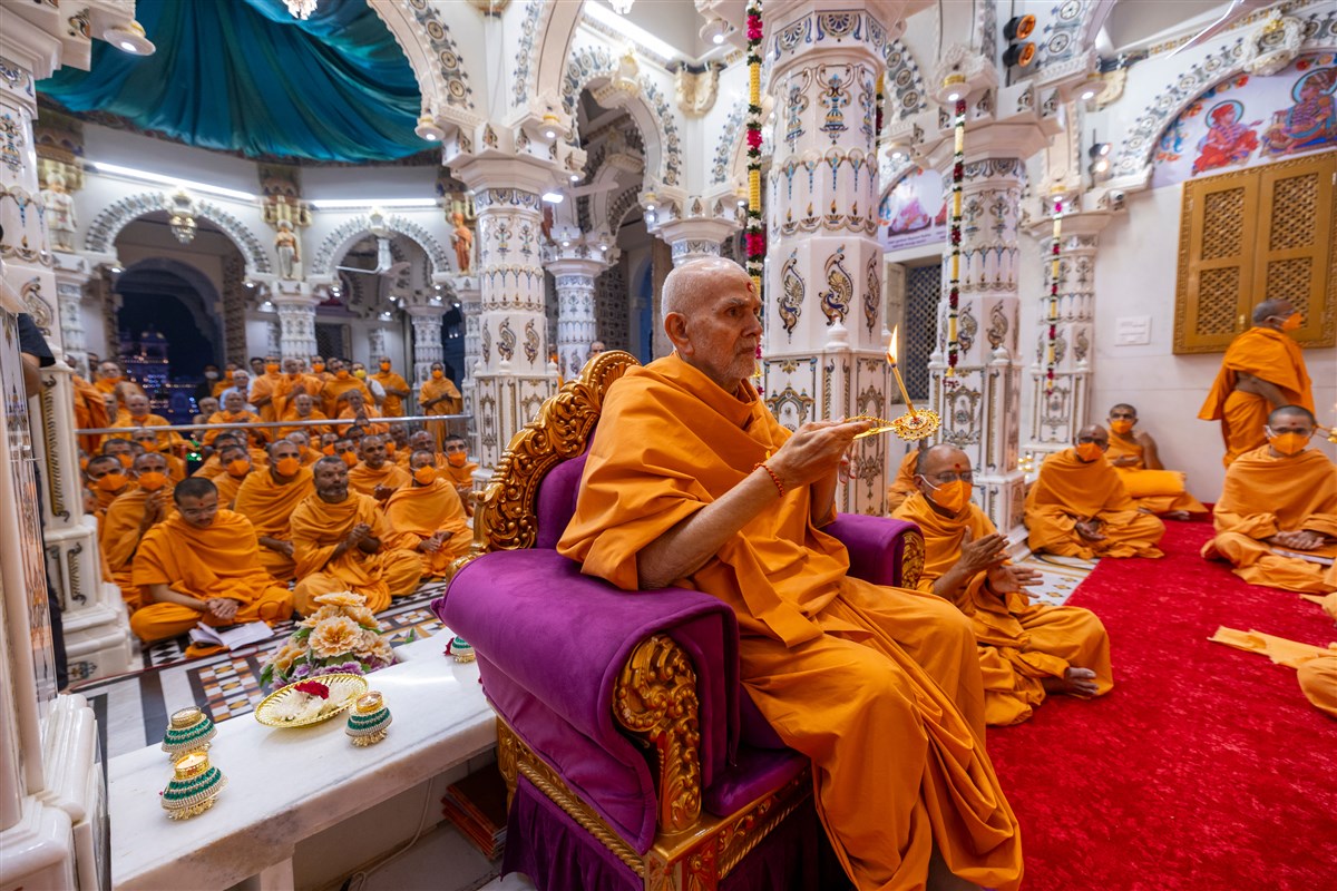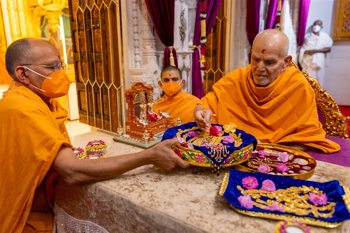 Swamishri offers thal to Shri Harikrishna Maharaj and Shri Gunatitanand Swami Maharaj
