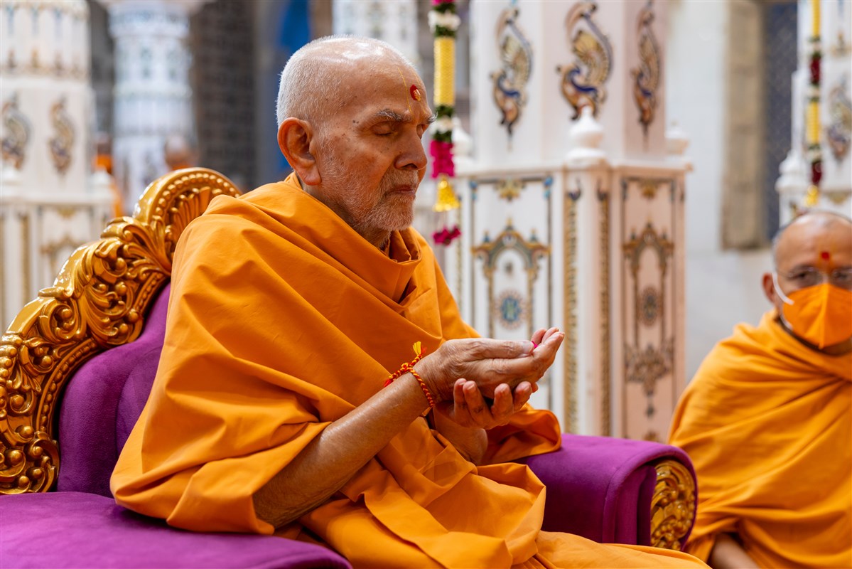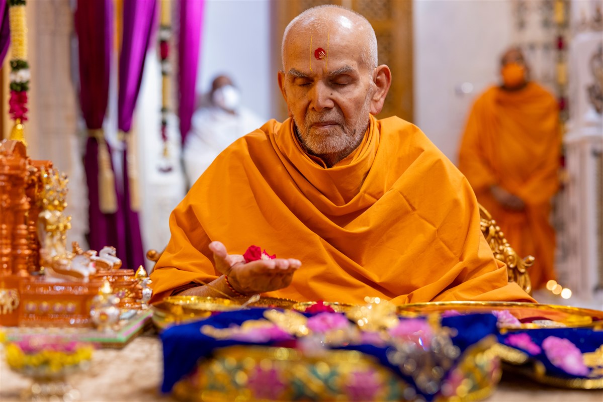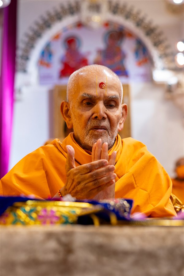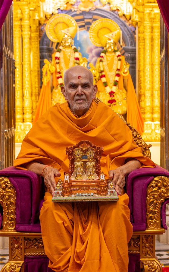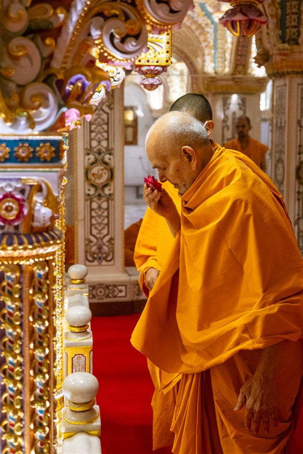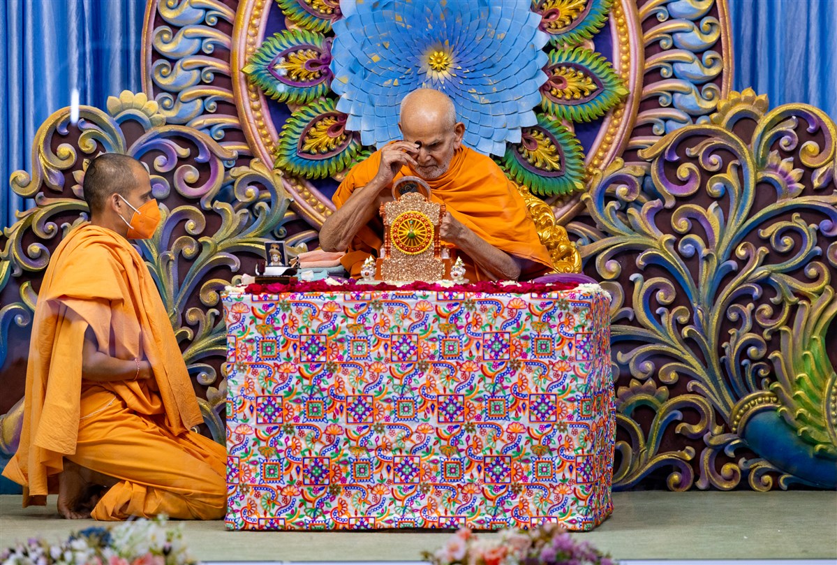 Swamishri engrossed in darshan of Bhagwan Swaminarayan and Aksharbrahma Gunatitanand Swami