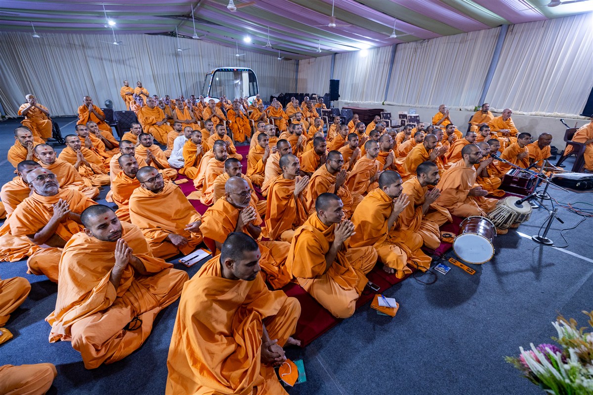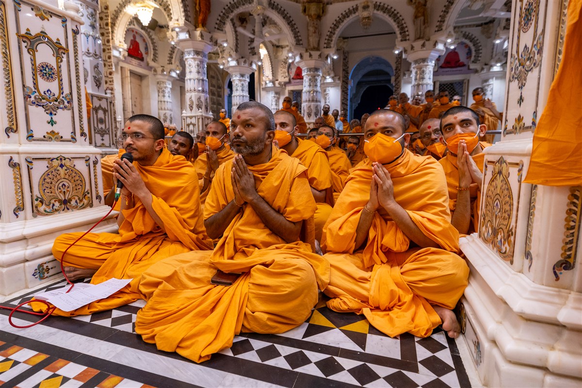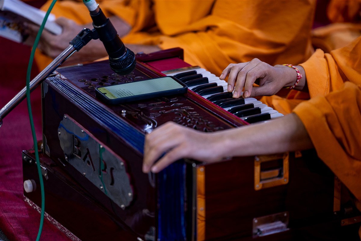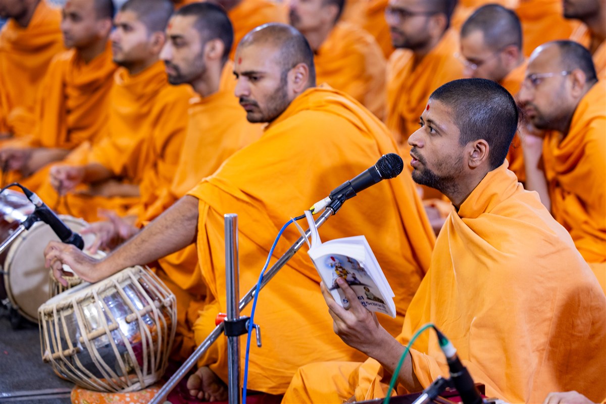 Aksharcharan Swami sings a kirtan in Swamishri's daily puja