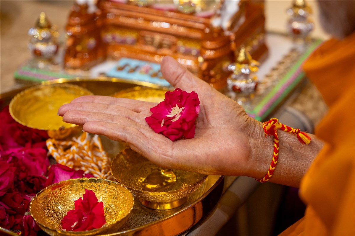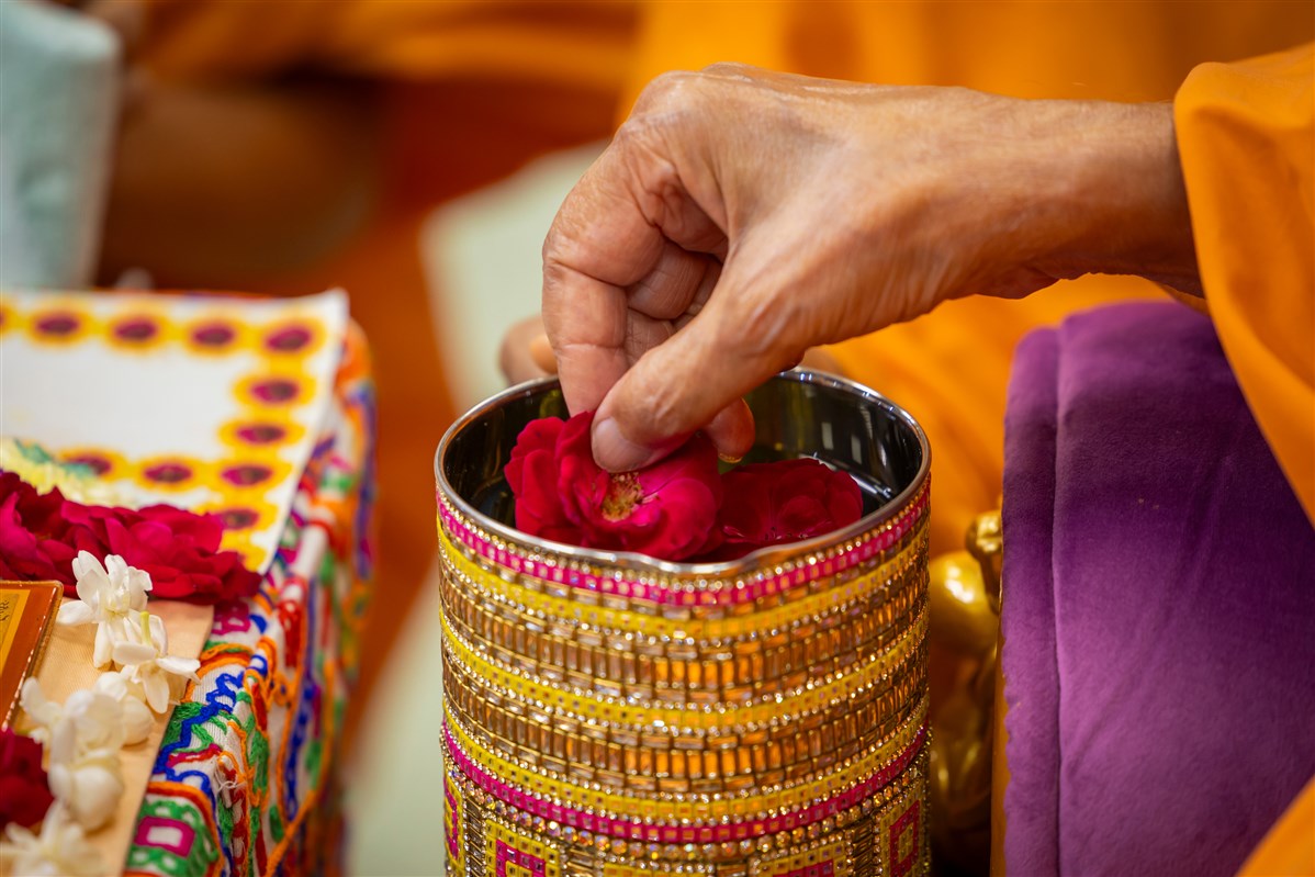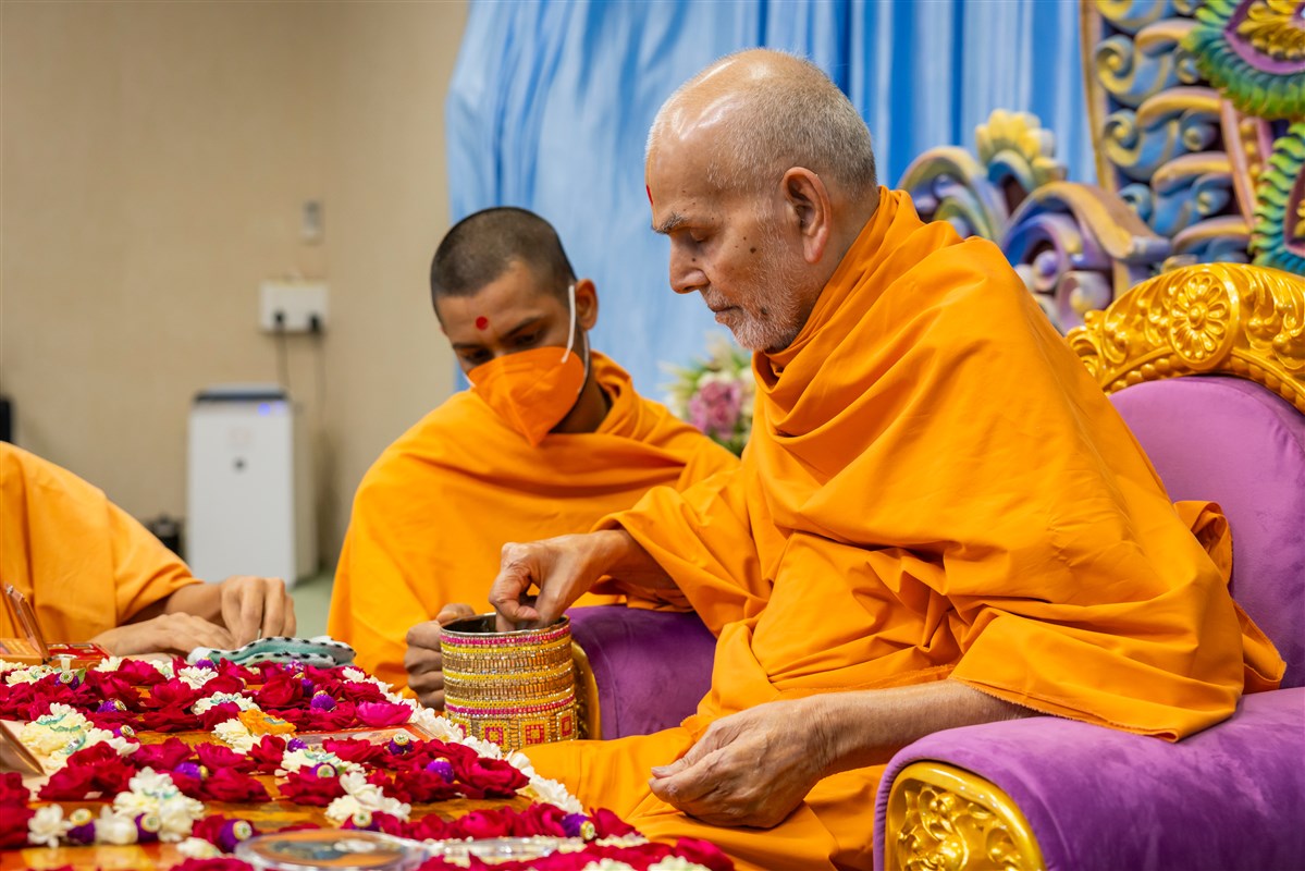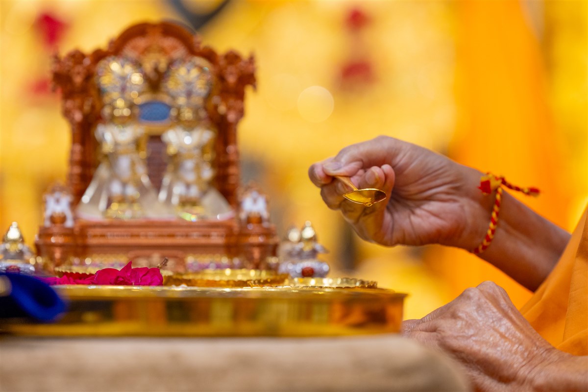 Swamishri sanctifies water with the holy relics of Bhagwan Swaminarayan and the Guru Parampara