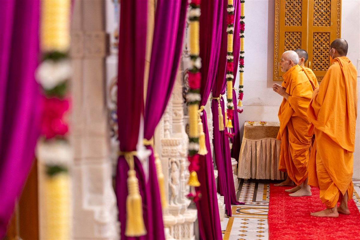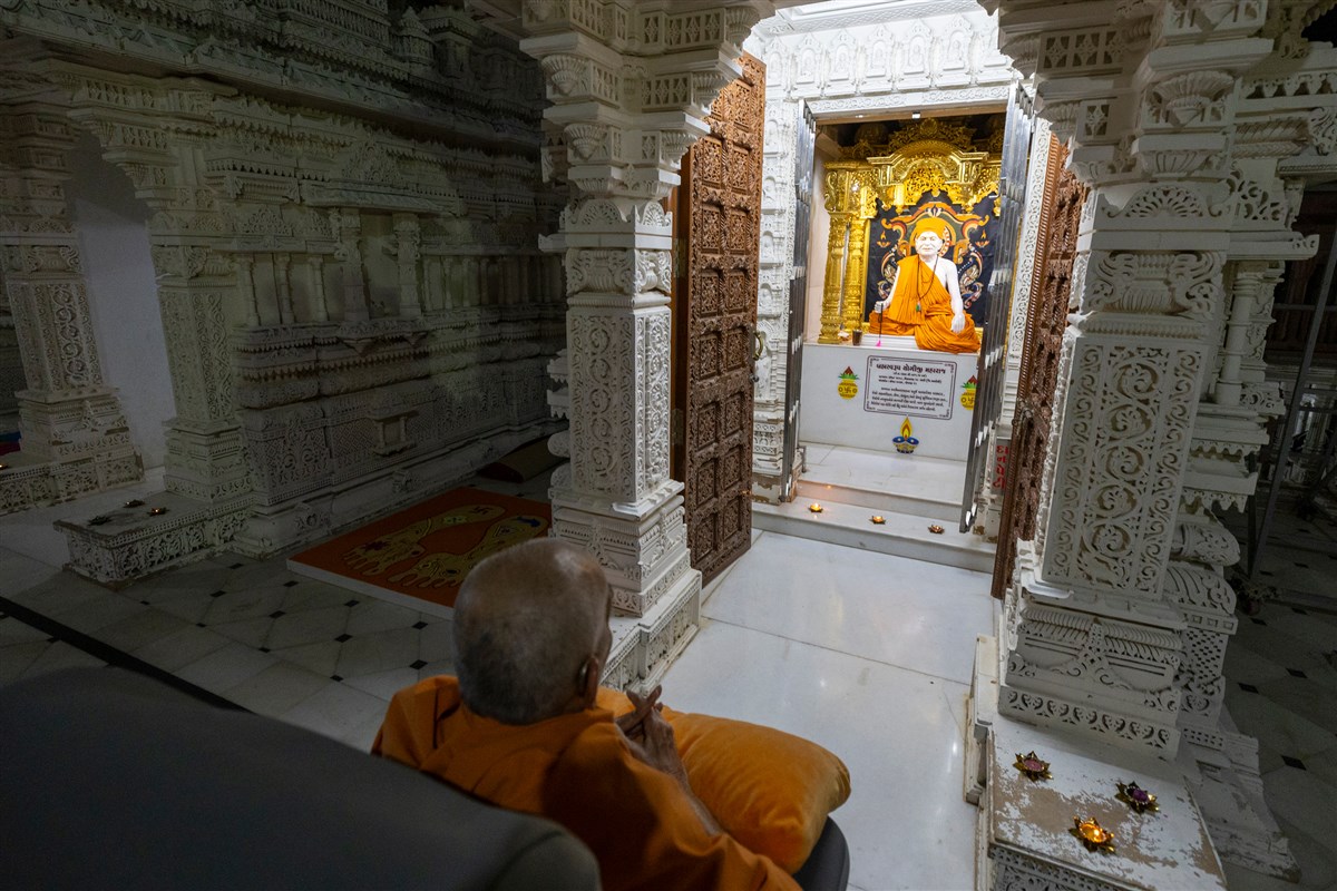 Swamishri engrossed in darshan of Shri Harikrishna Maharaj and Shri Gunatitanand Swami Maharaj