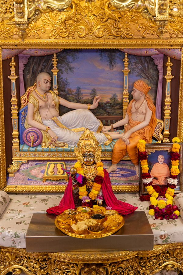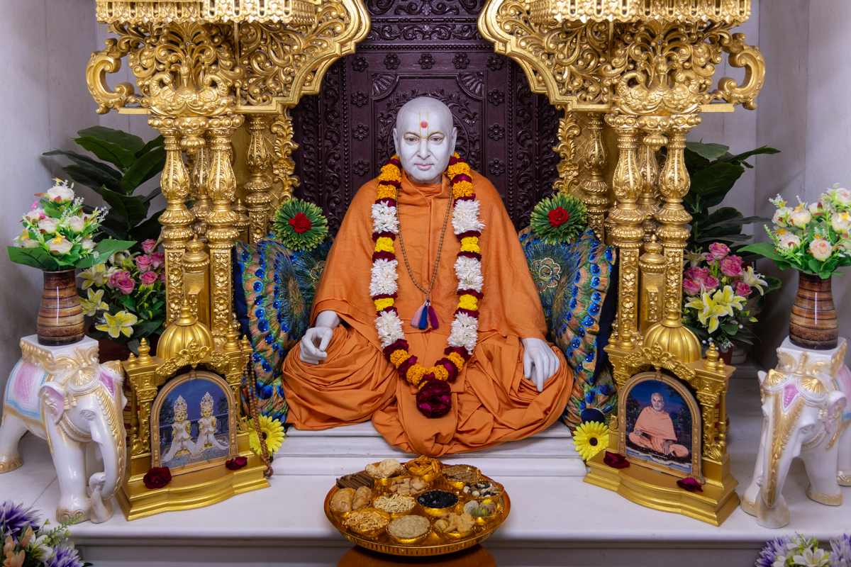 Swamishri offers thal to Shri Akshar-Purushottam Maharaj