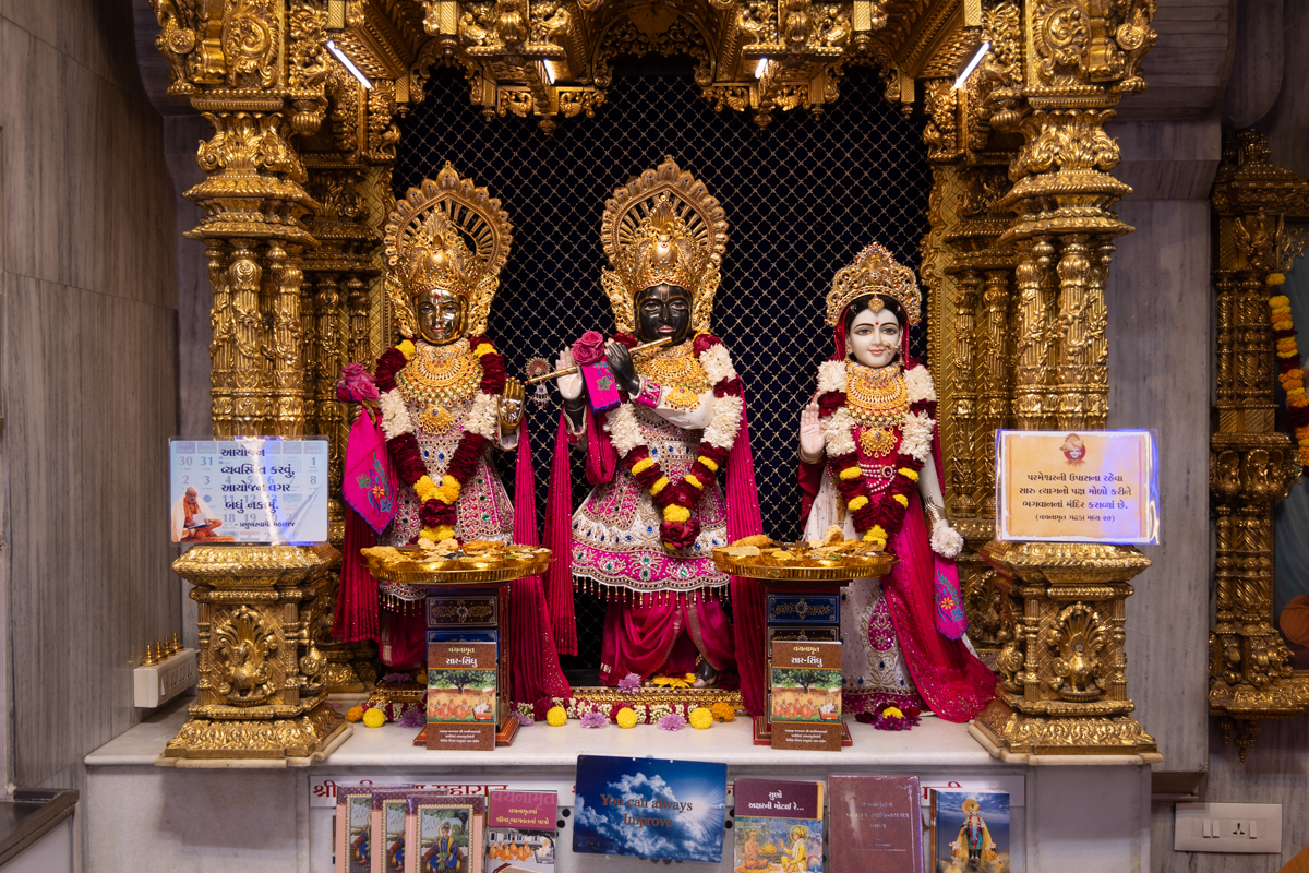 Swamishri engrossed in darshan of Shri Harikrishna Maharaj, Bhagwan Shri Krishna and Shri Radhaji
