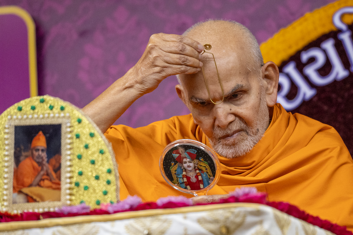 Swamishri applies a tilak on his forehead