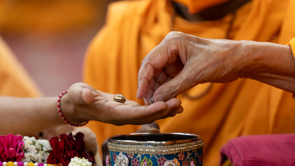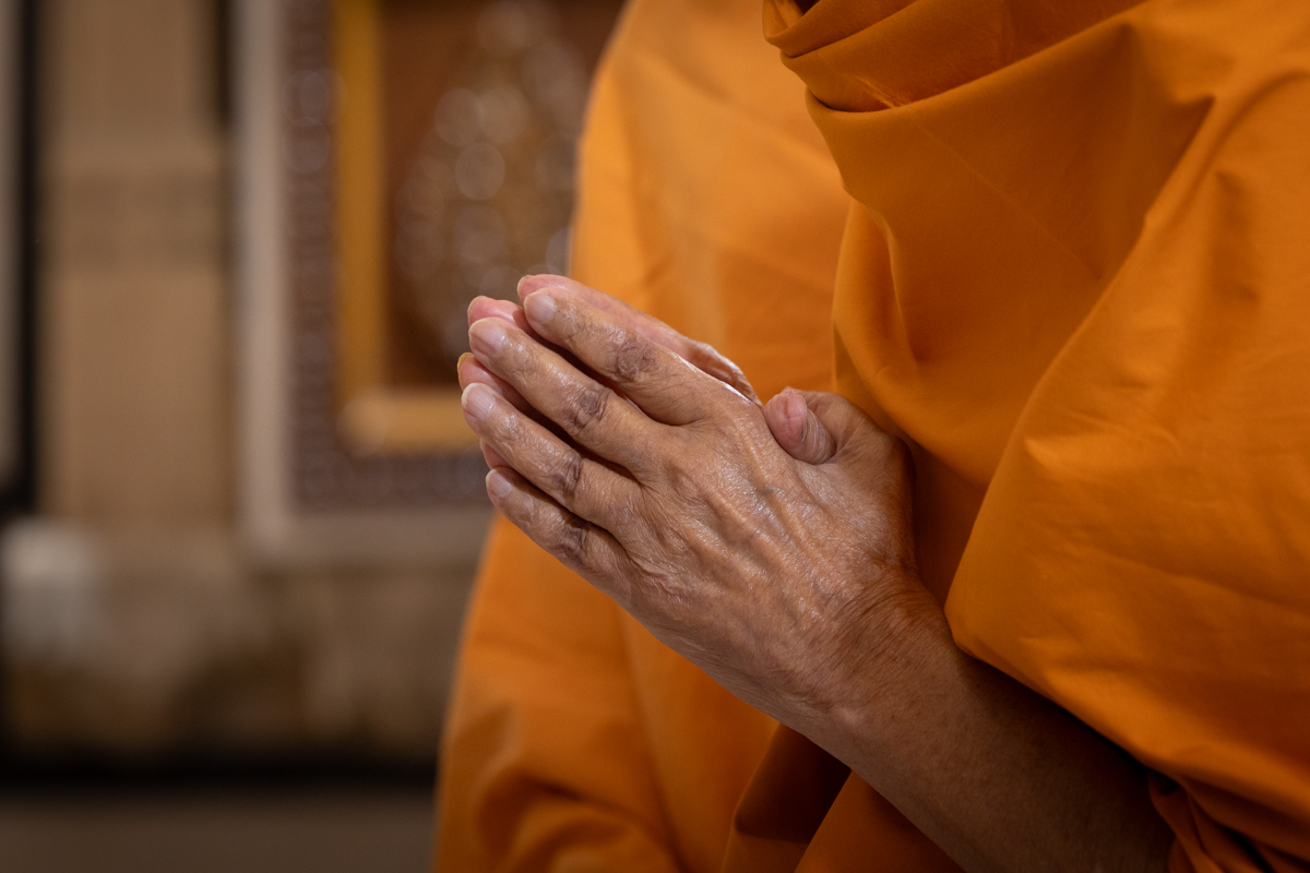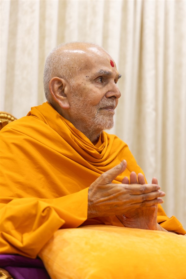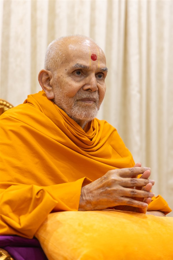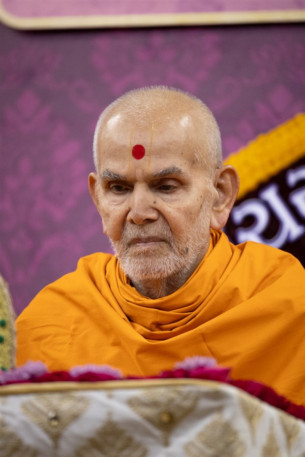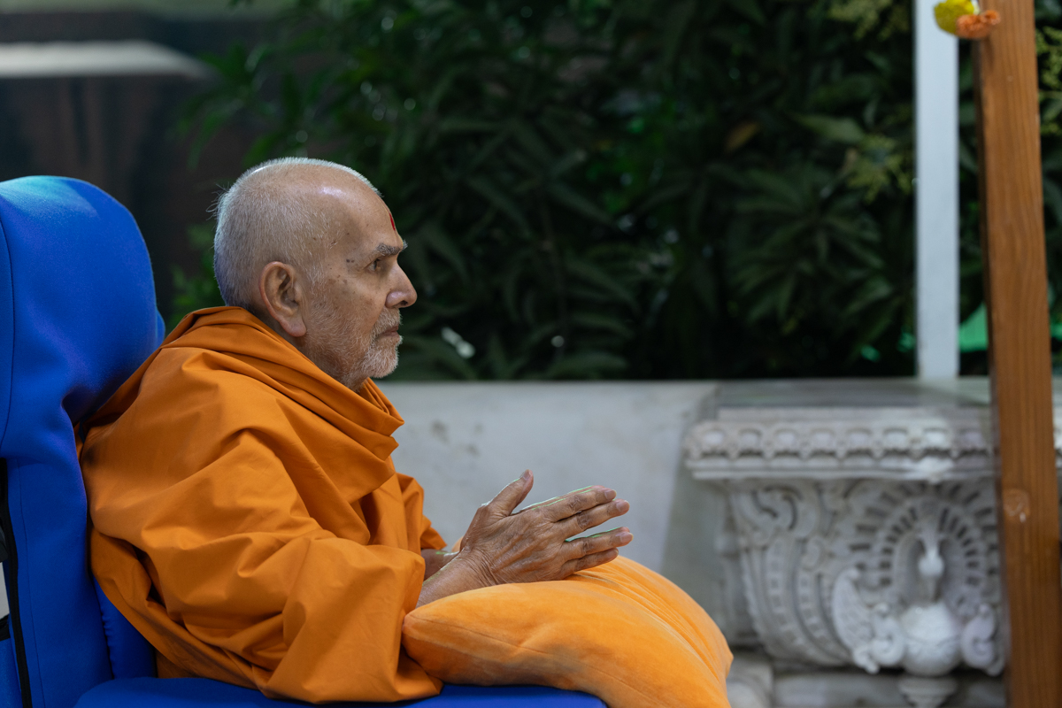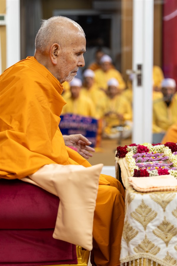 Swamishri listens to the sadhana mantra and daily prayer