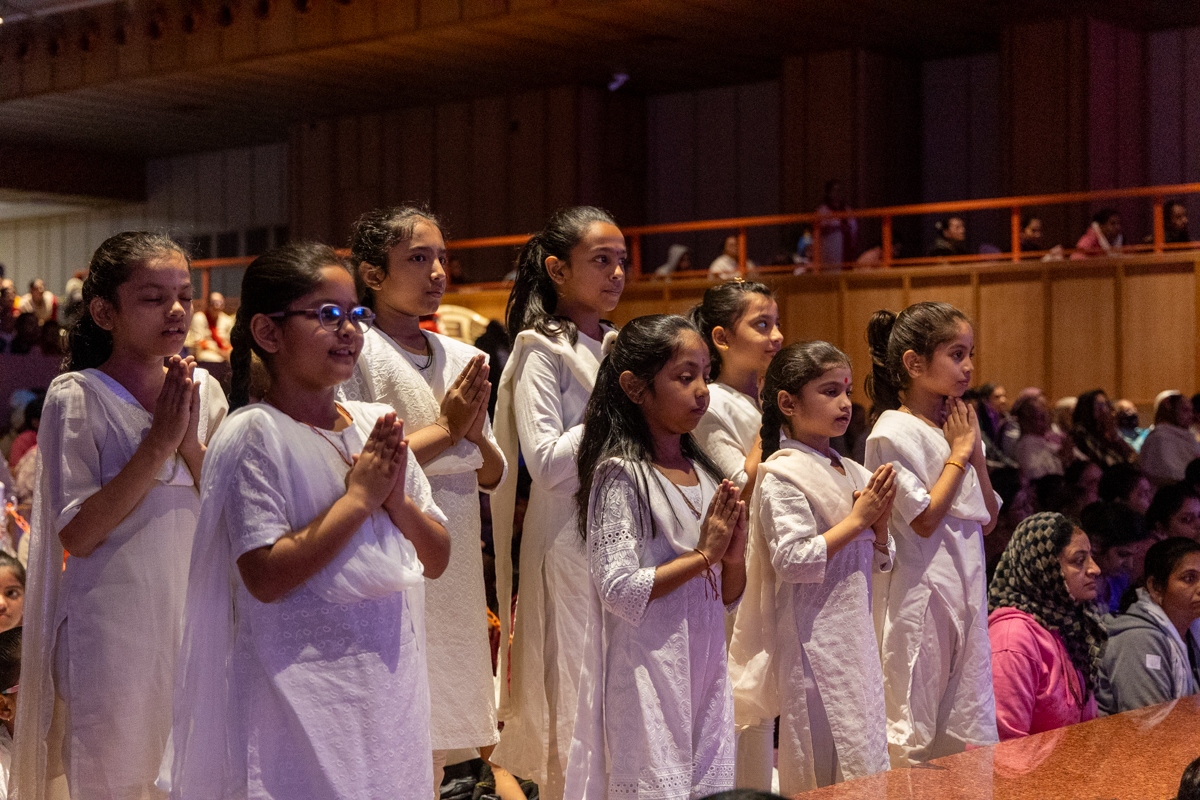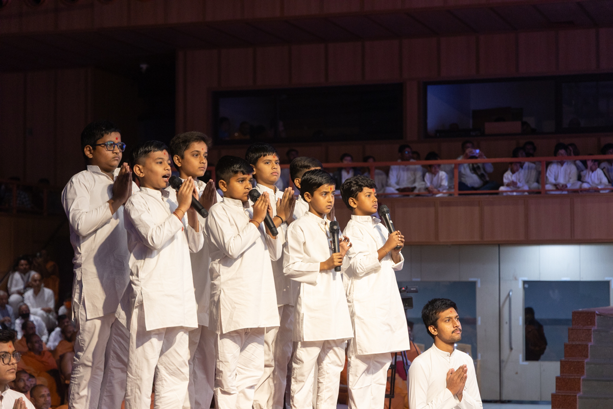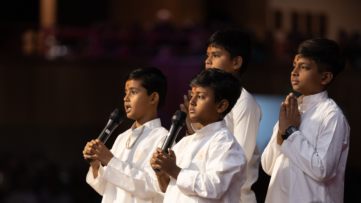 Children lead everyone in reciting the sadhana mantra and daily prayer in Swamishri's puja