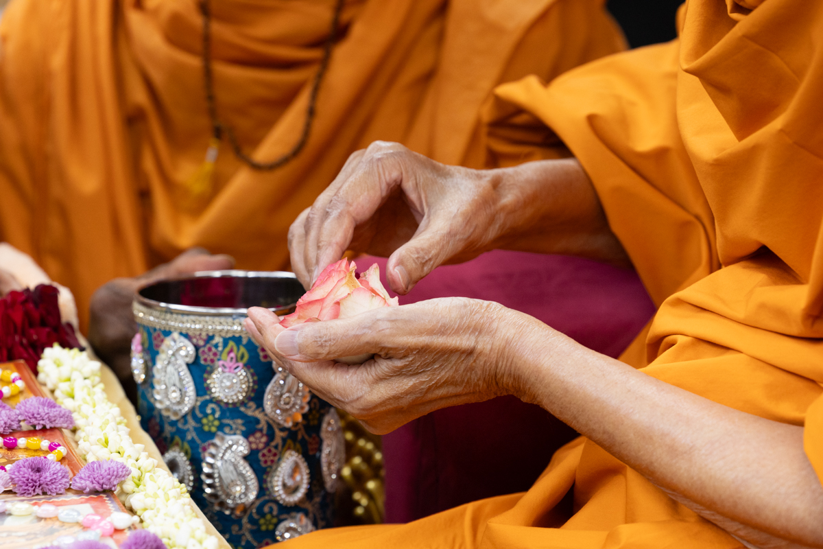 Swamishri adds flowers to the sanctified water