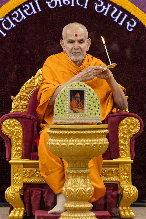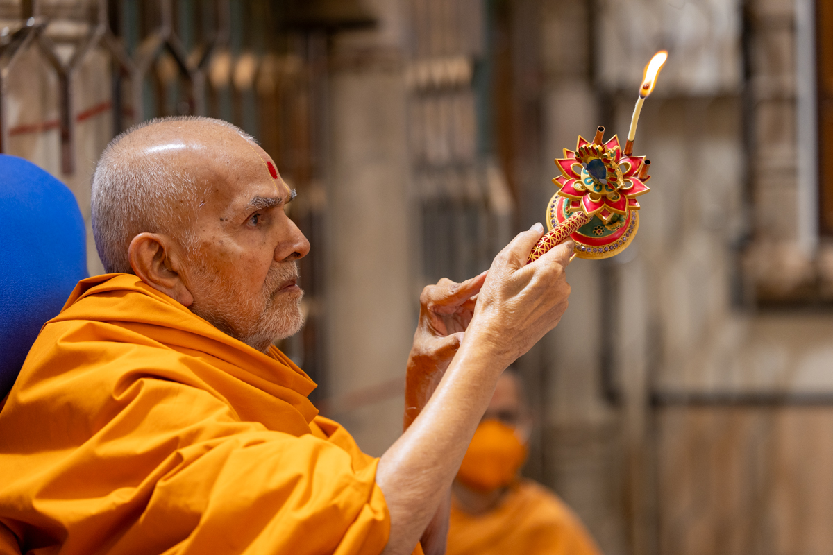Swamishri performs the morning arti