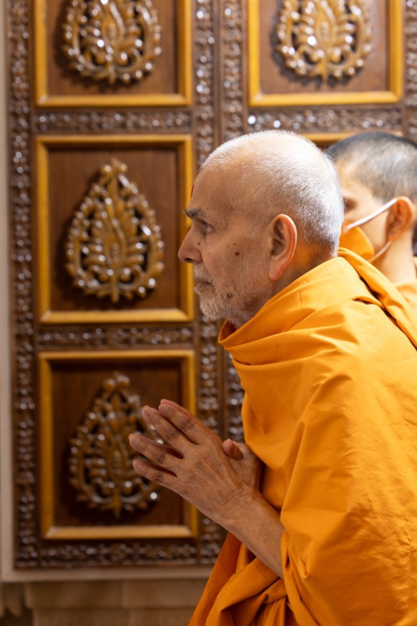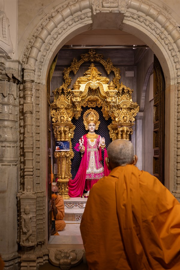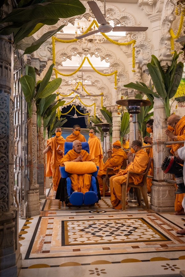 Param Pujya Mahant Swami Maharaj arrives to perform his daily puja