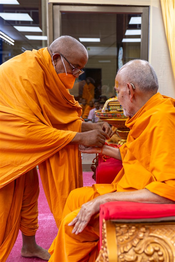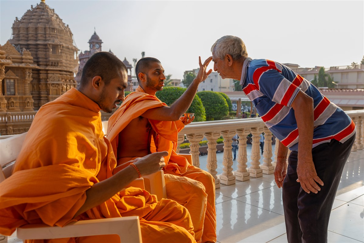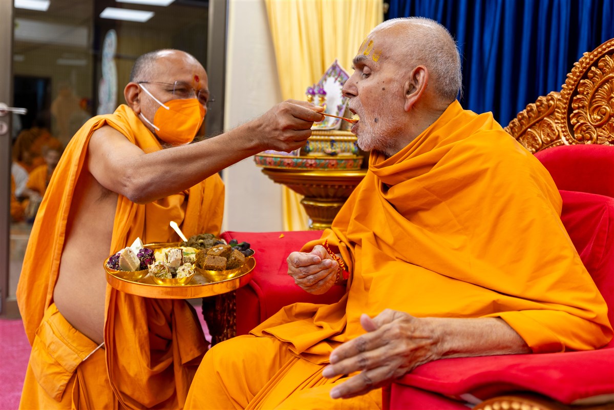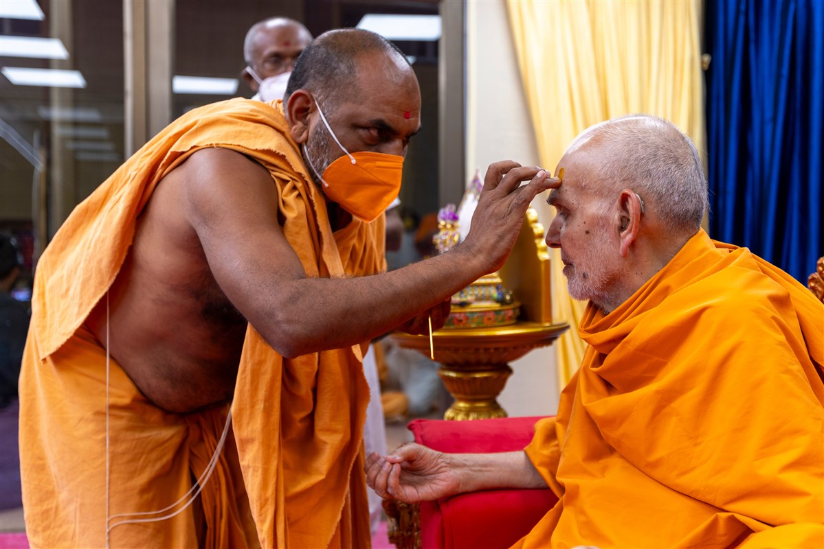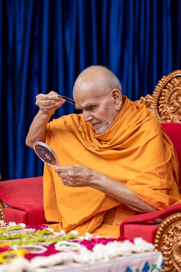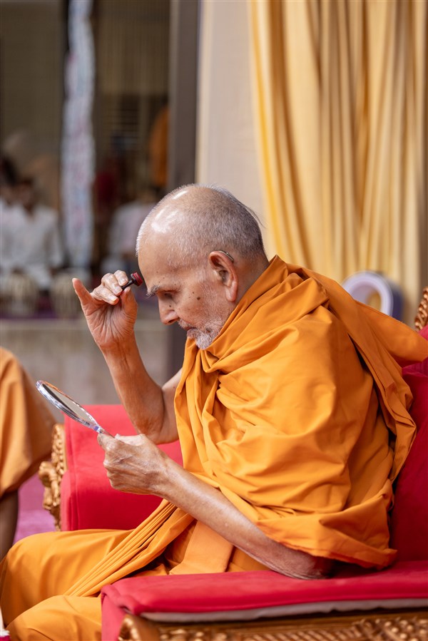 Param Pujya Mahant Swami Maharaj applies a tilak on his forehead