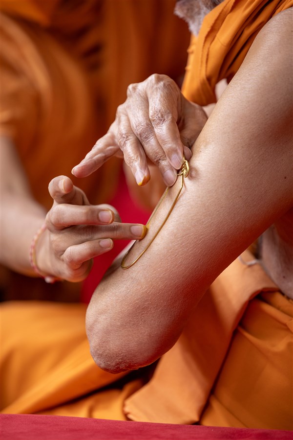 Swamishri applies a tilak on his upper arm