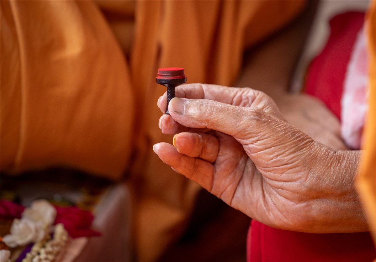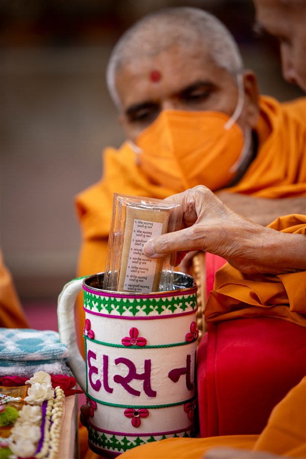 Swamishri sanctifies water with the holy relics of Bhagwan Swaminarayan and the Guru Parampara