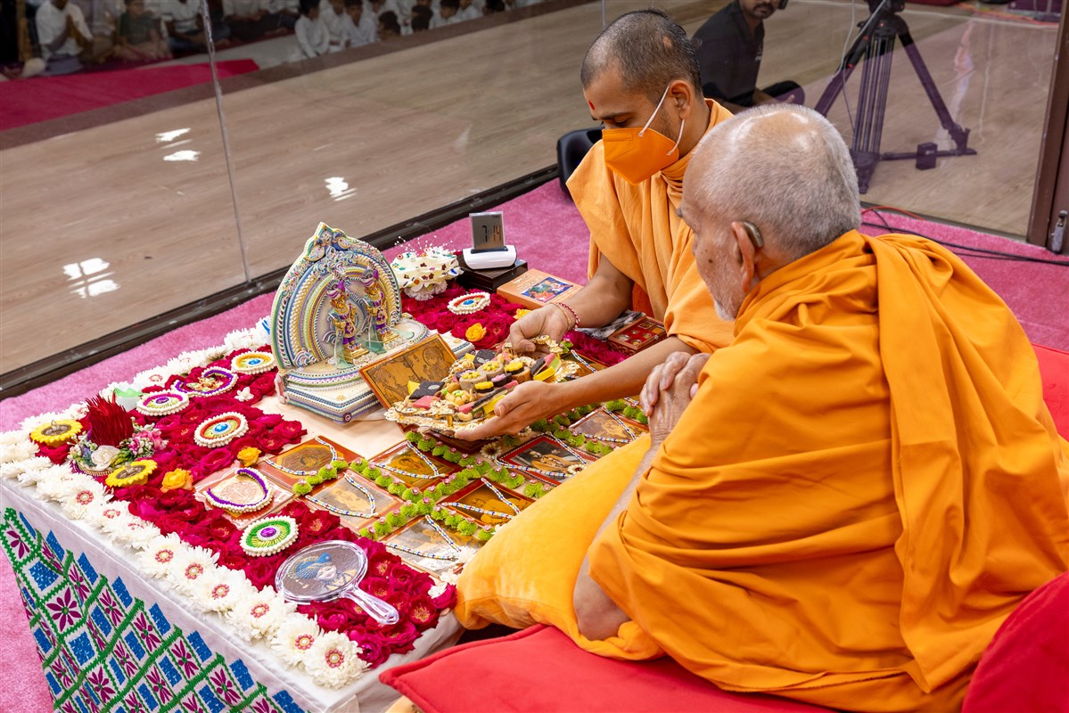 Swamishri offers thal to Brahmaswarup Pramukh Swami Maharaj
